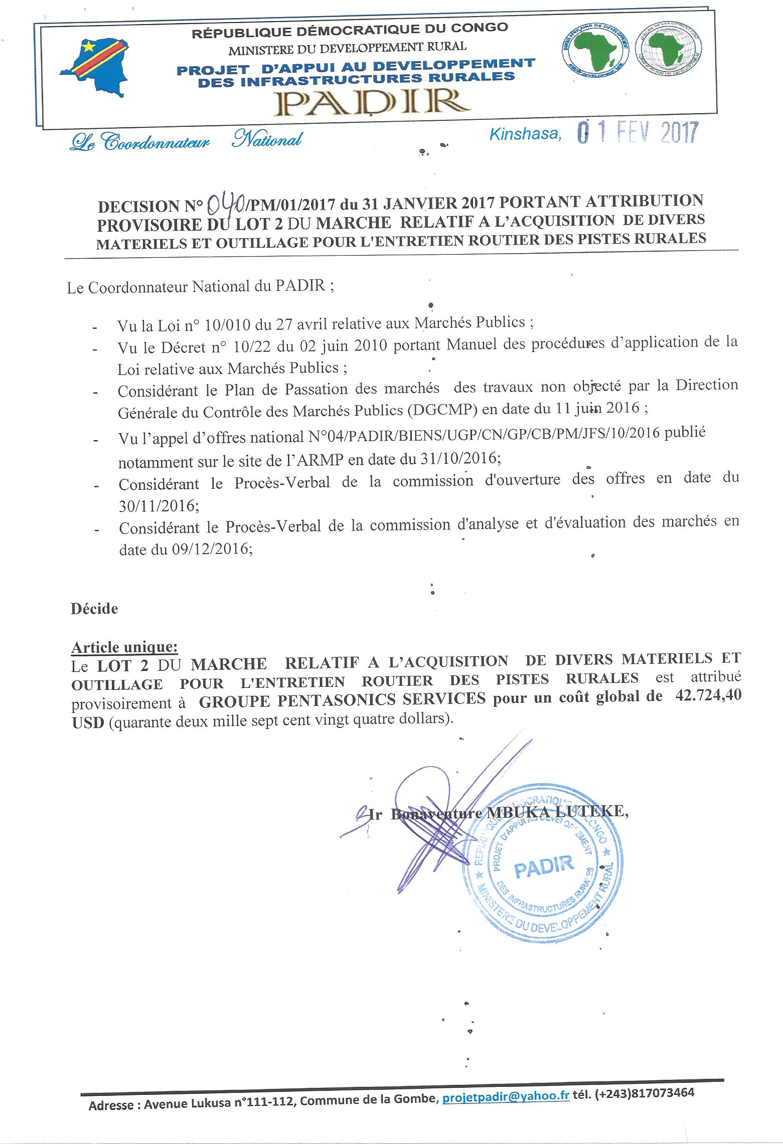 Attribution provisoire du lot 2 du marché relatif à l’acquisition de divers matériels et outillage pour l’entretien routier des pistes rurales à GROUPE PENTASONICS SERVICES.