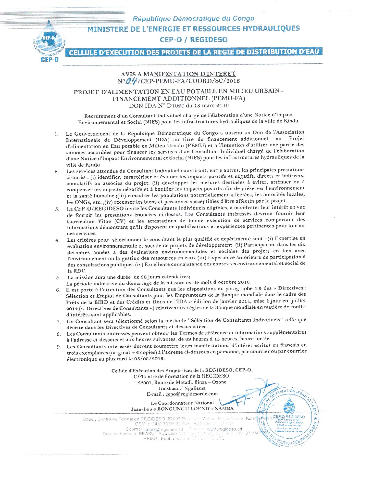 Recrutement d’un Consultant Individuel chargé de l’élaboration d’une Notice d’Impact Environnemental et Social pour les infrastructures hydrauliques de la ville de Kindu.