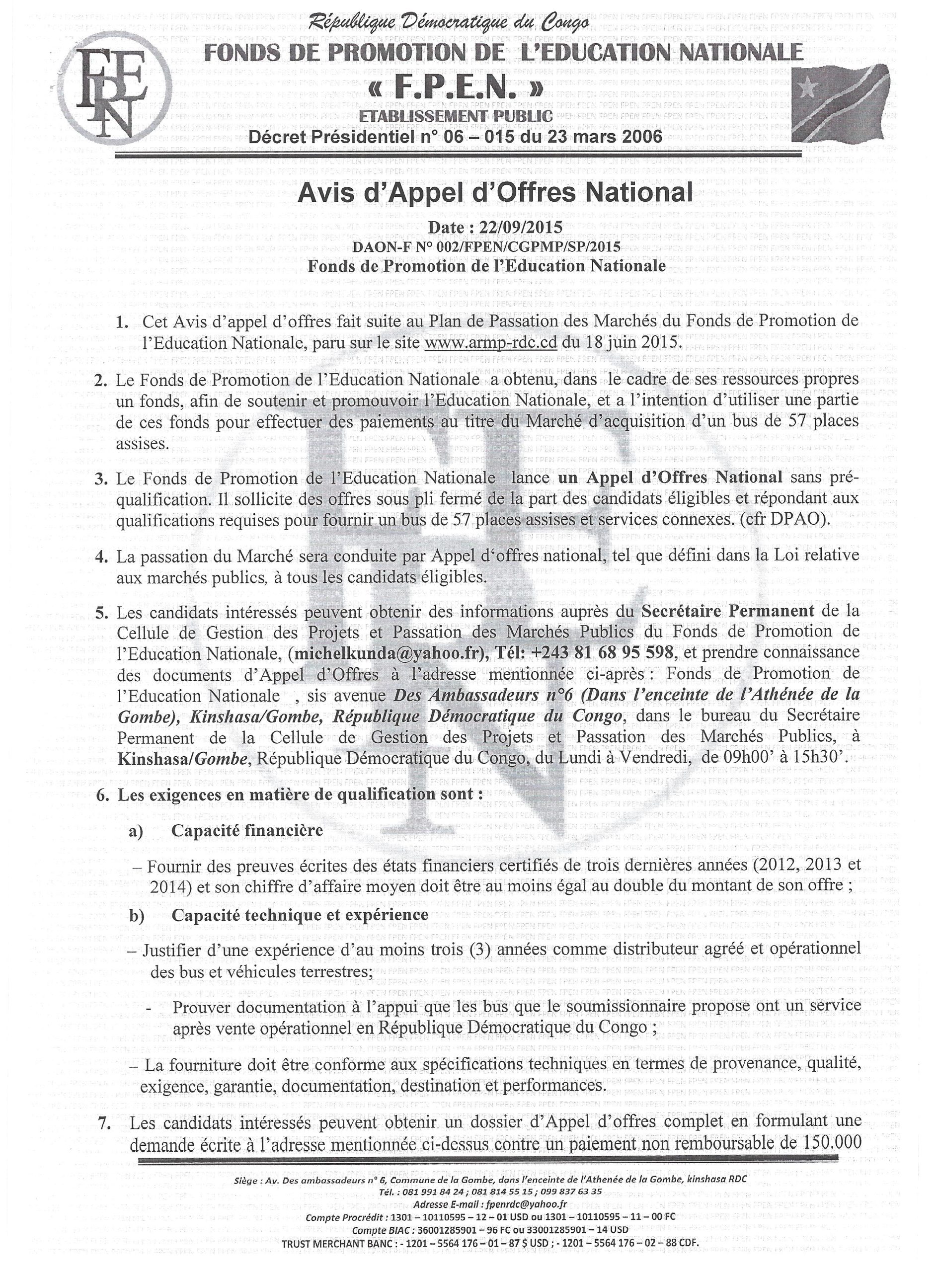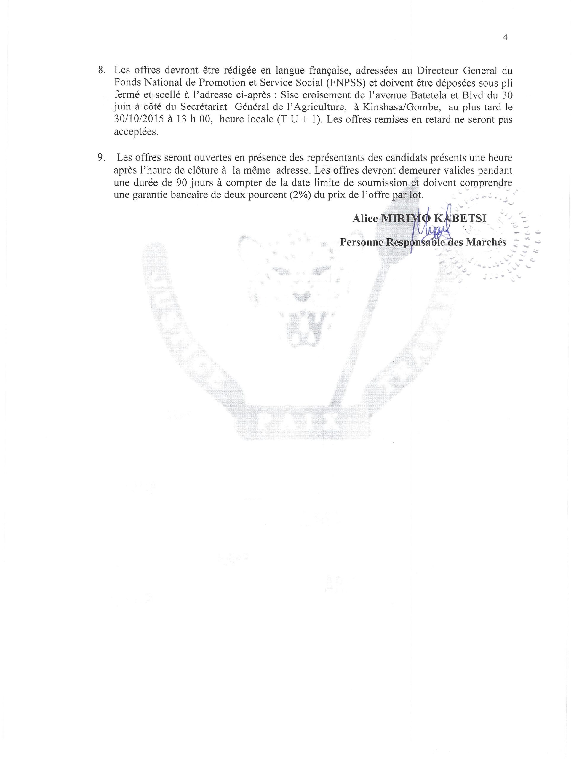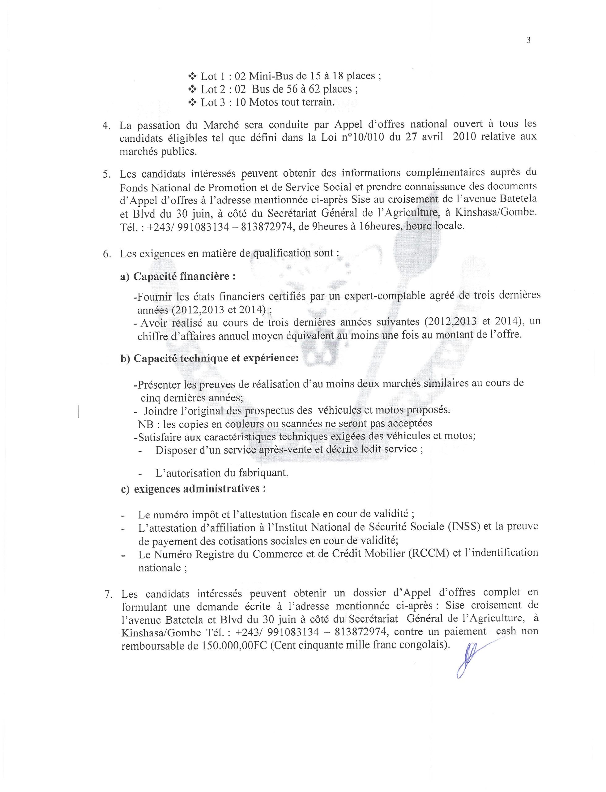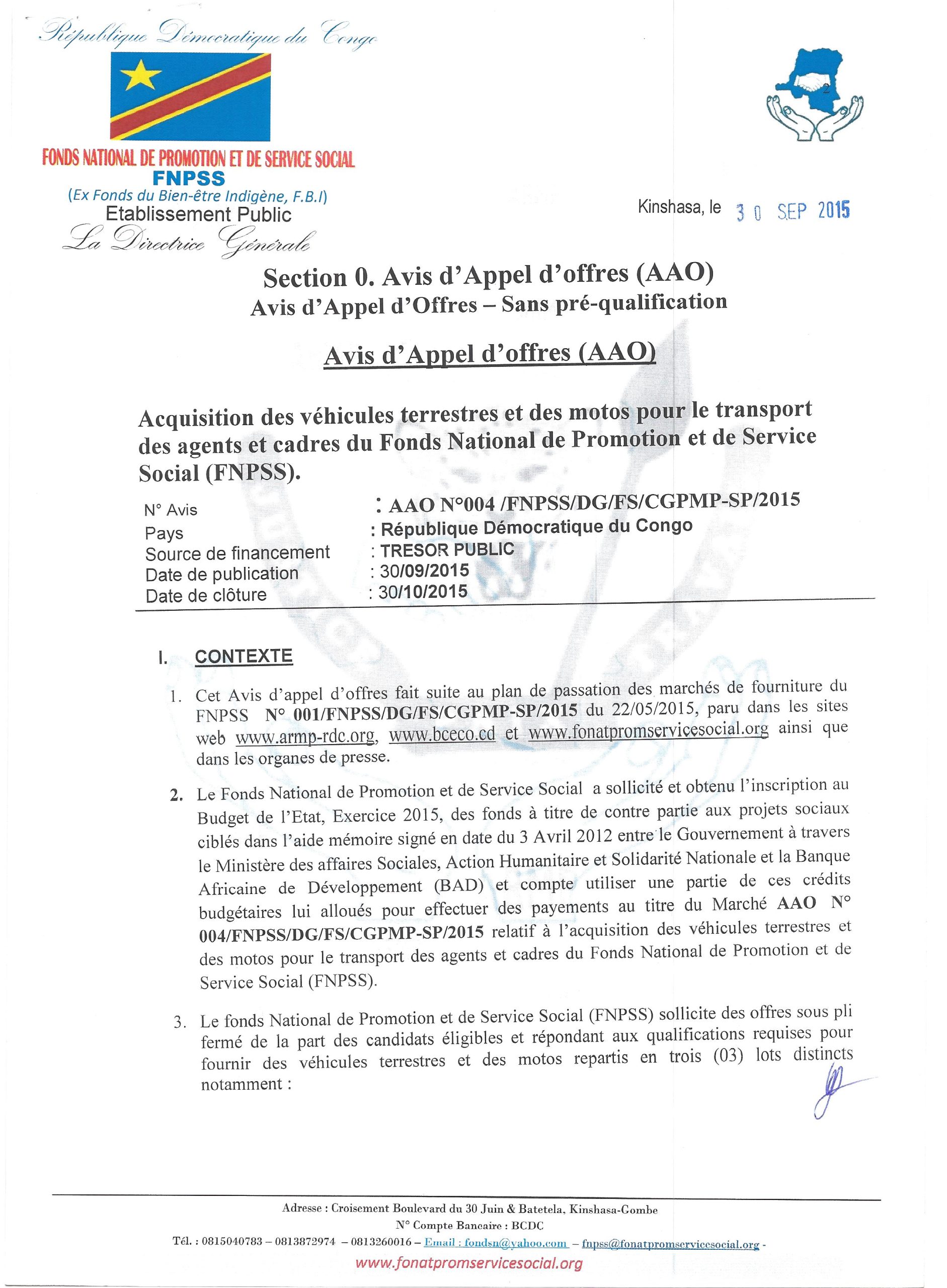 Acquisition des véhicules terrestres et des motos pour le transport des agents et cadres du Fonds National de Promotion et Service Social N°004.