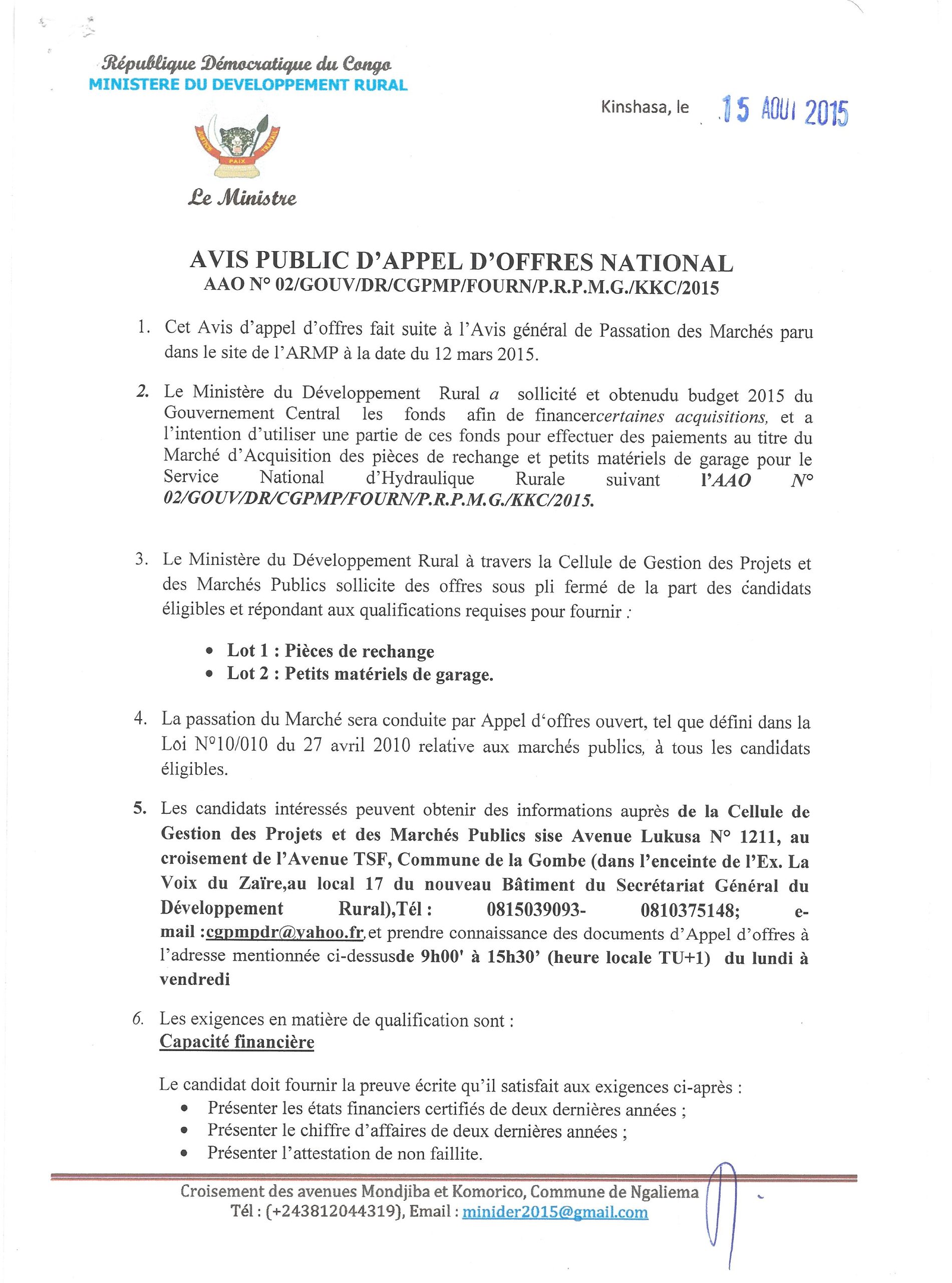 Marché d’Acquisition des pièces de rechange et petit matériels de garage pour le Service National d’hydraulique Rurale.