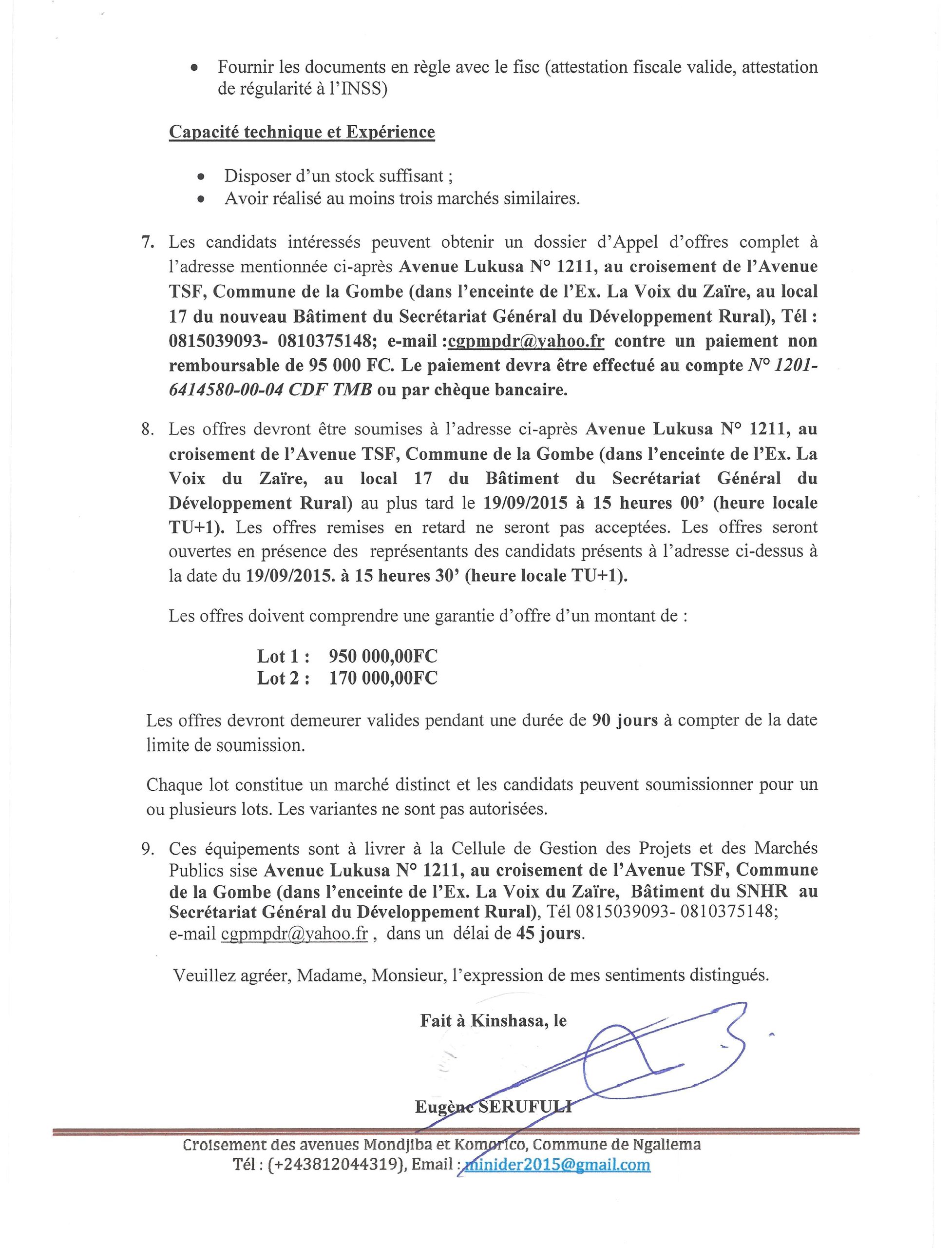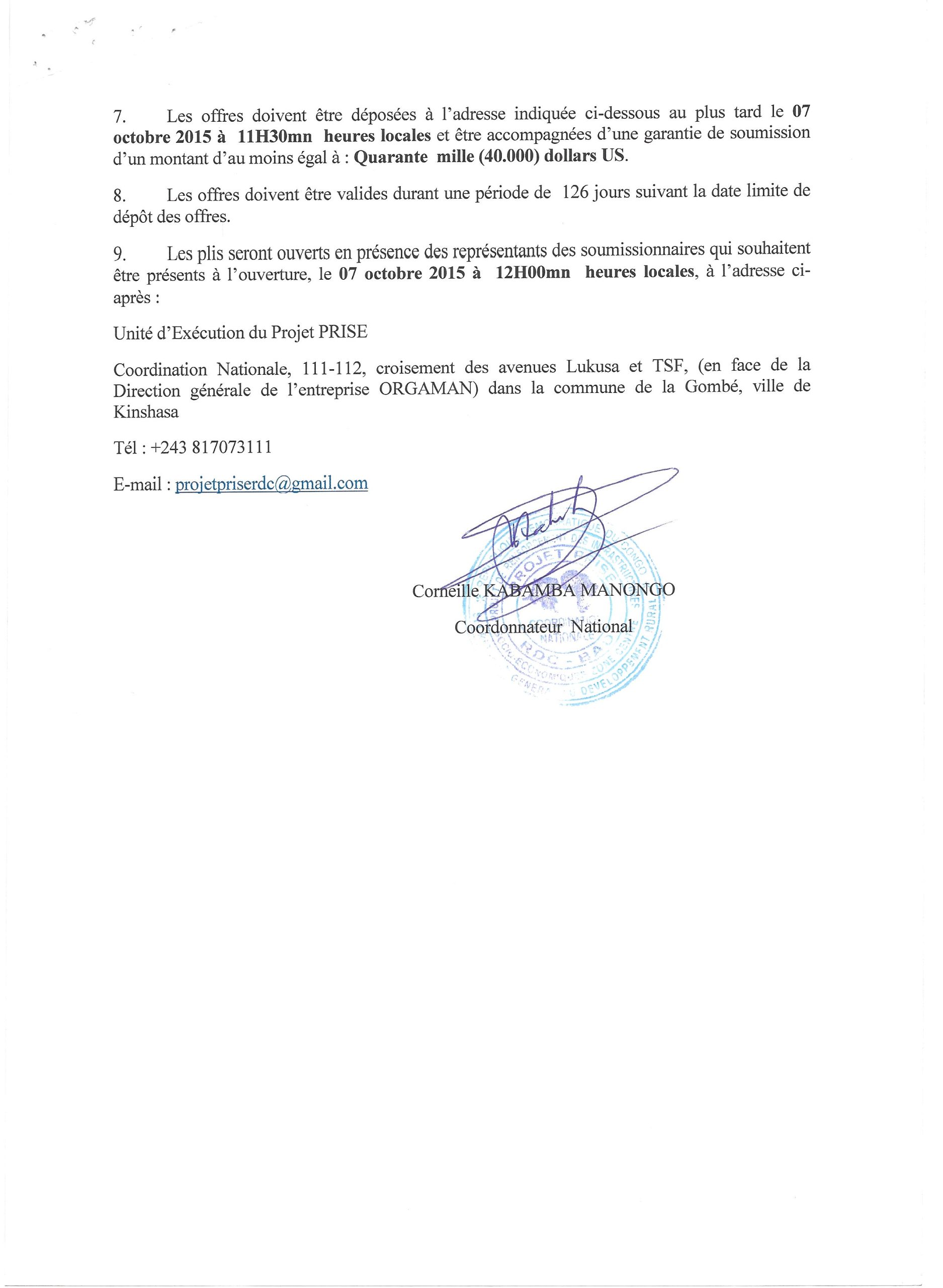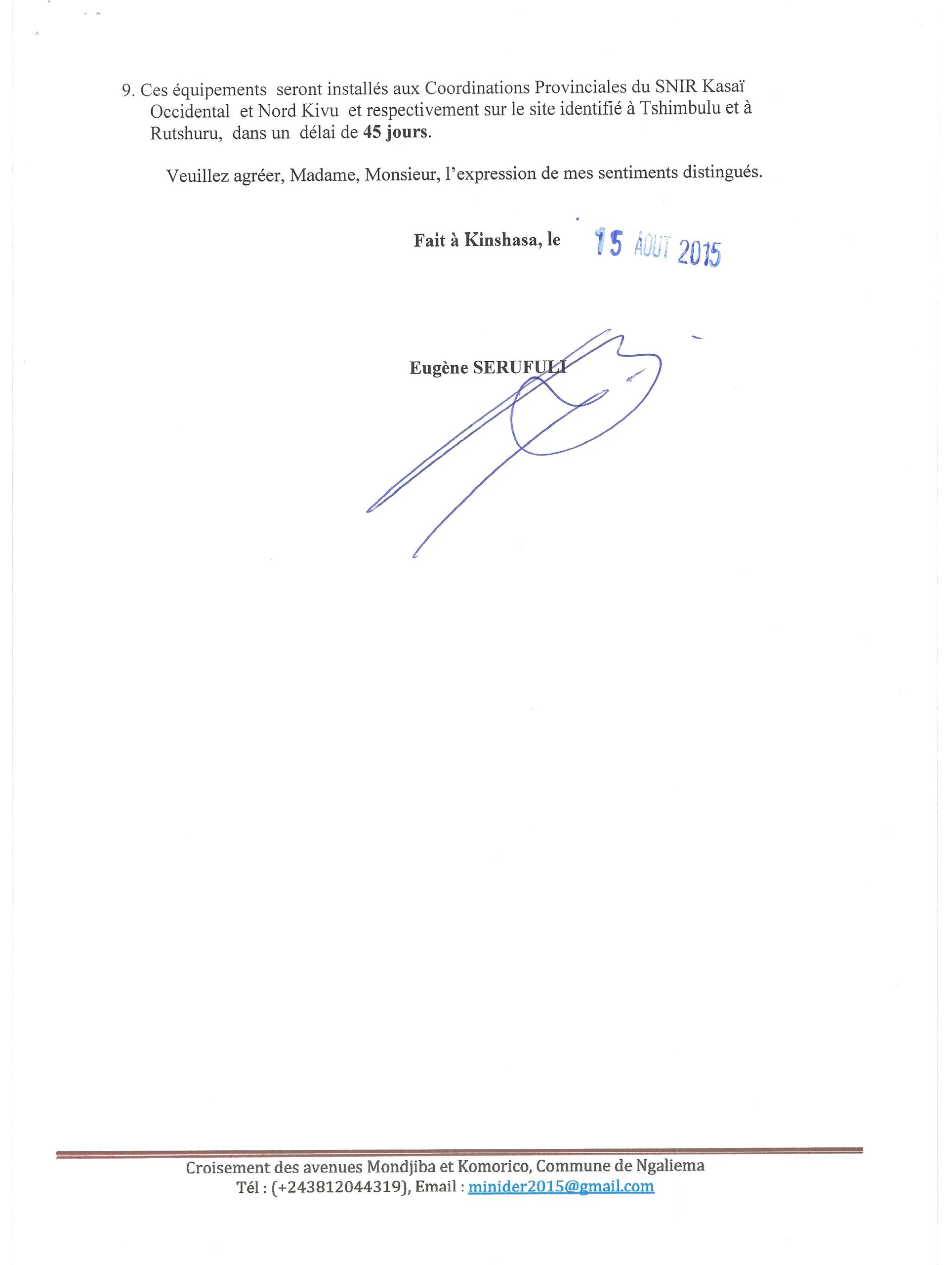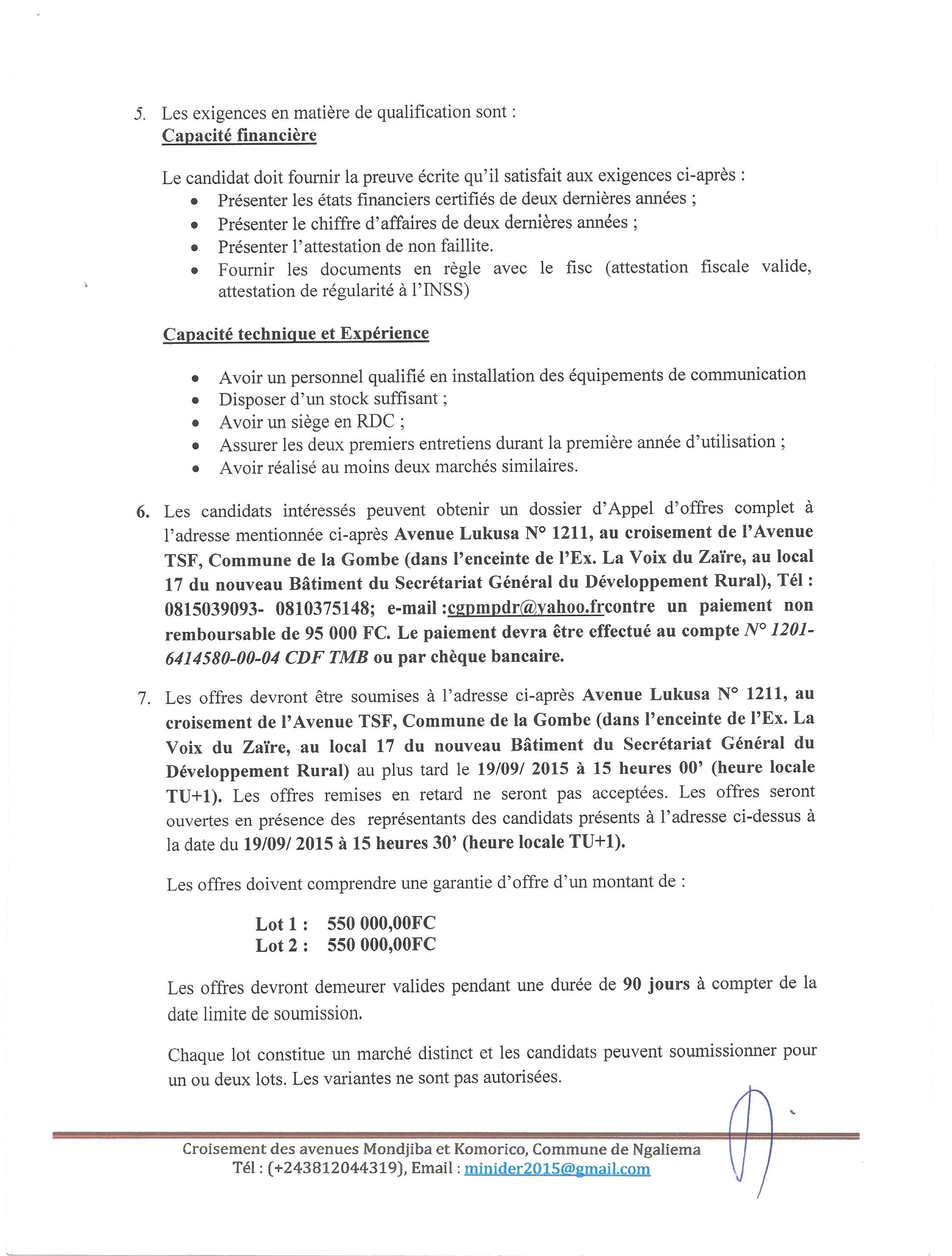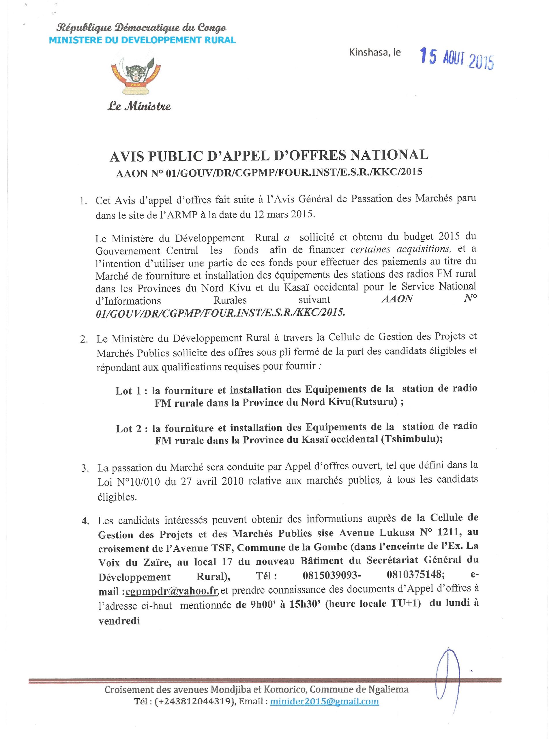 Marché de fourniture et installation des équipements des stations des radios FM rural dans les provinces du Nord Kivu et du Kasaï Occidental pour le Service National d’Information.