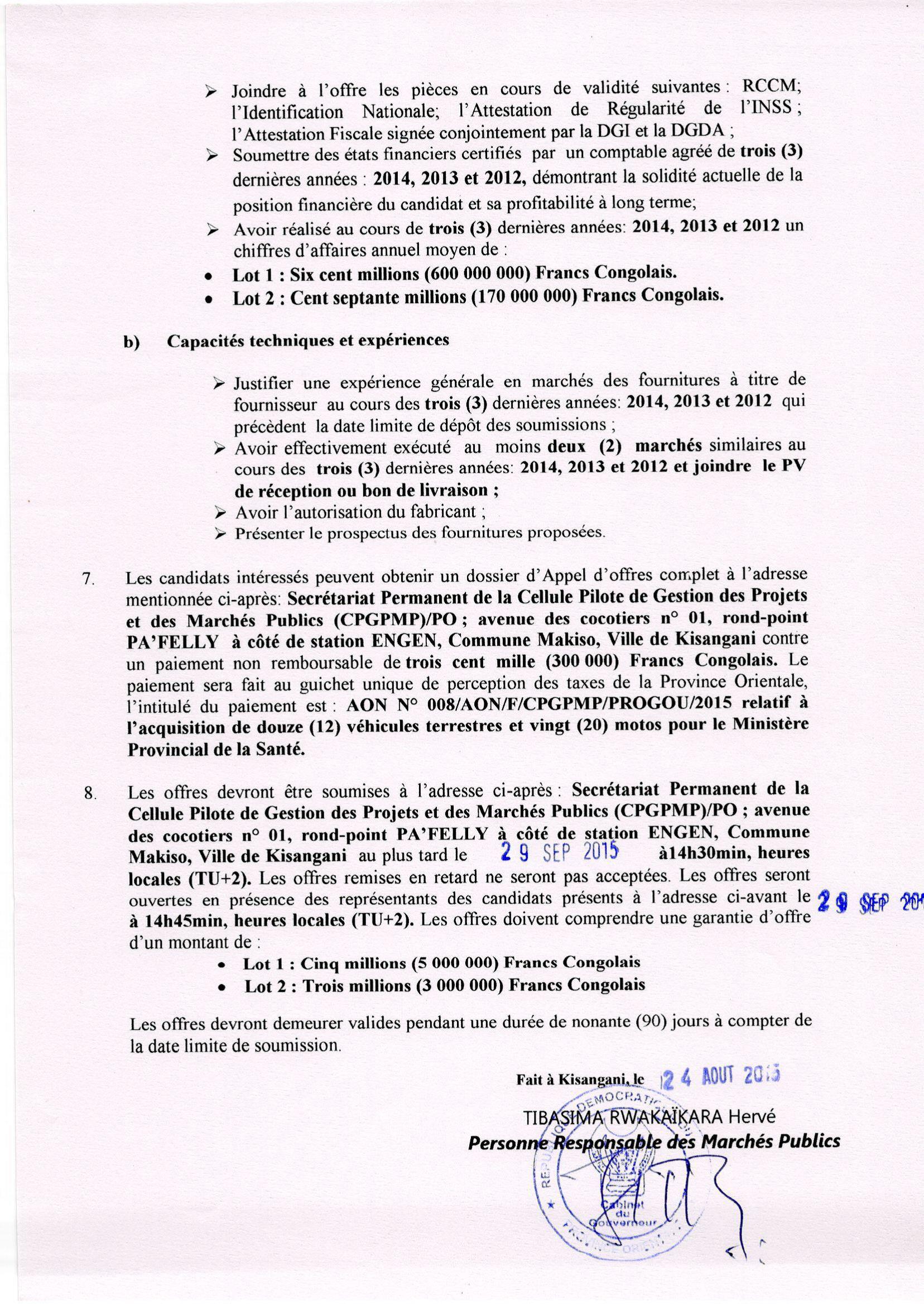 Acquisition de Douze (12) Véhicules Terrestres et Vingt (20) motos pour le Ministres Provincial de la Sante.
