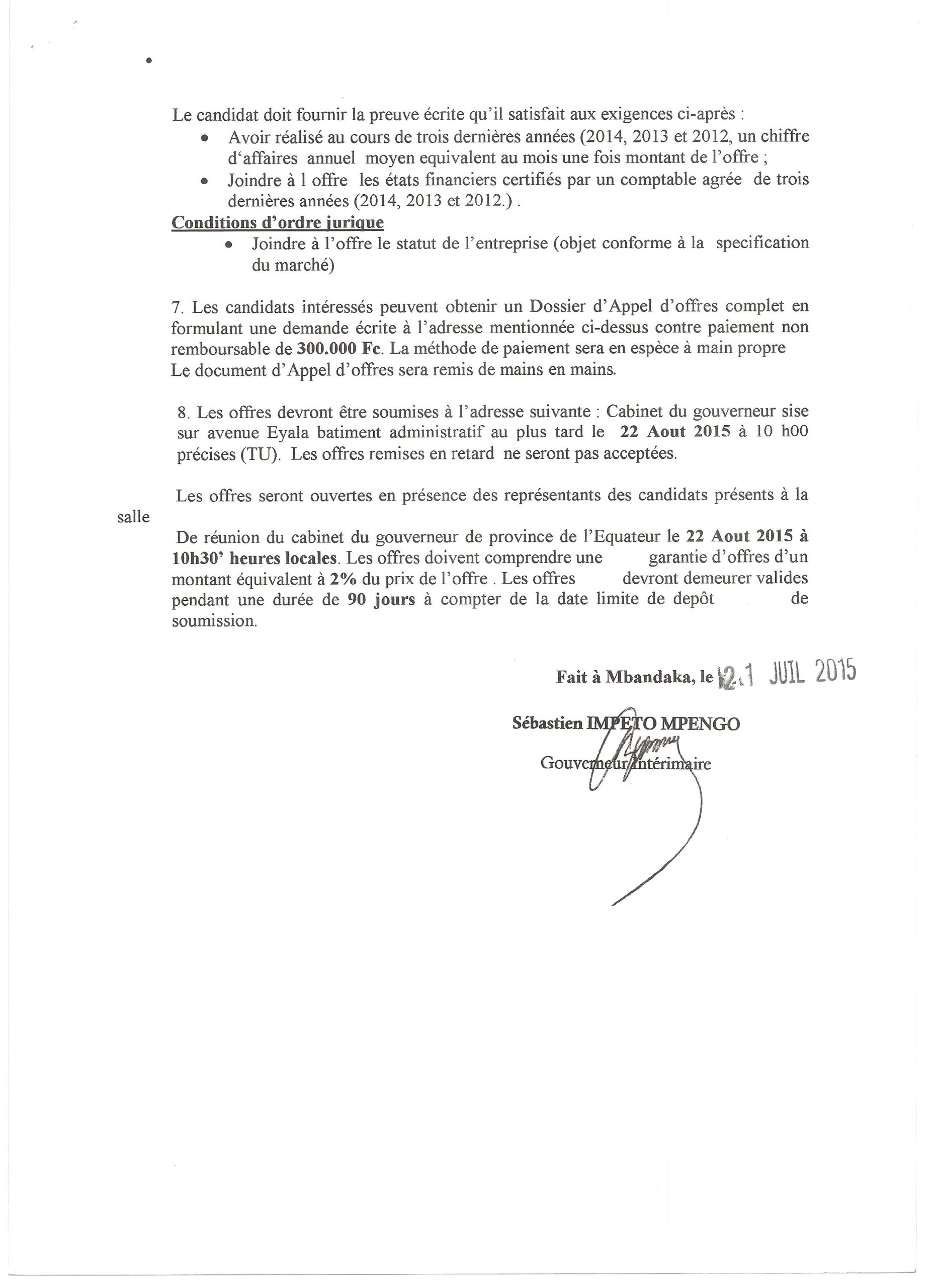 Attribution provisoire accordée à ACME INTERNATIONAL Ltd du marché relatif à l’ acquisition d’un groupe électropompe submersible et de deux groupes moto-suppresseurs du centre de Kindu.