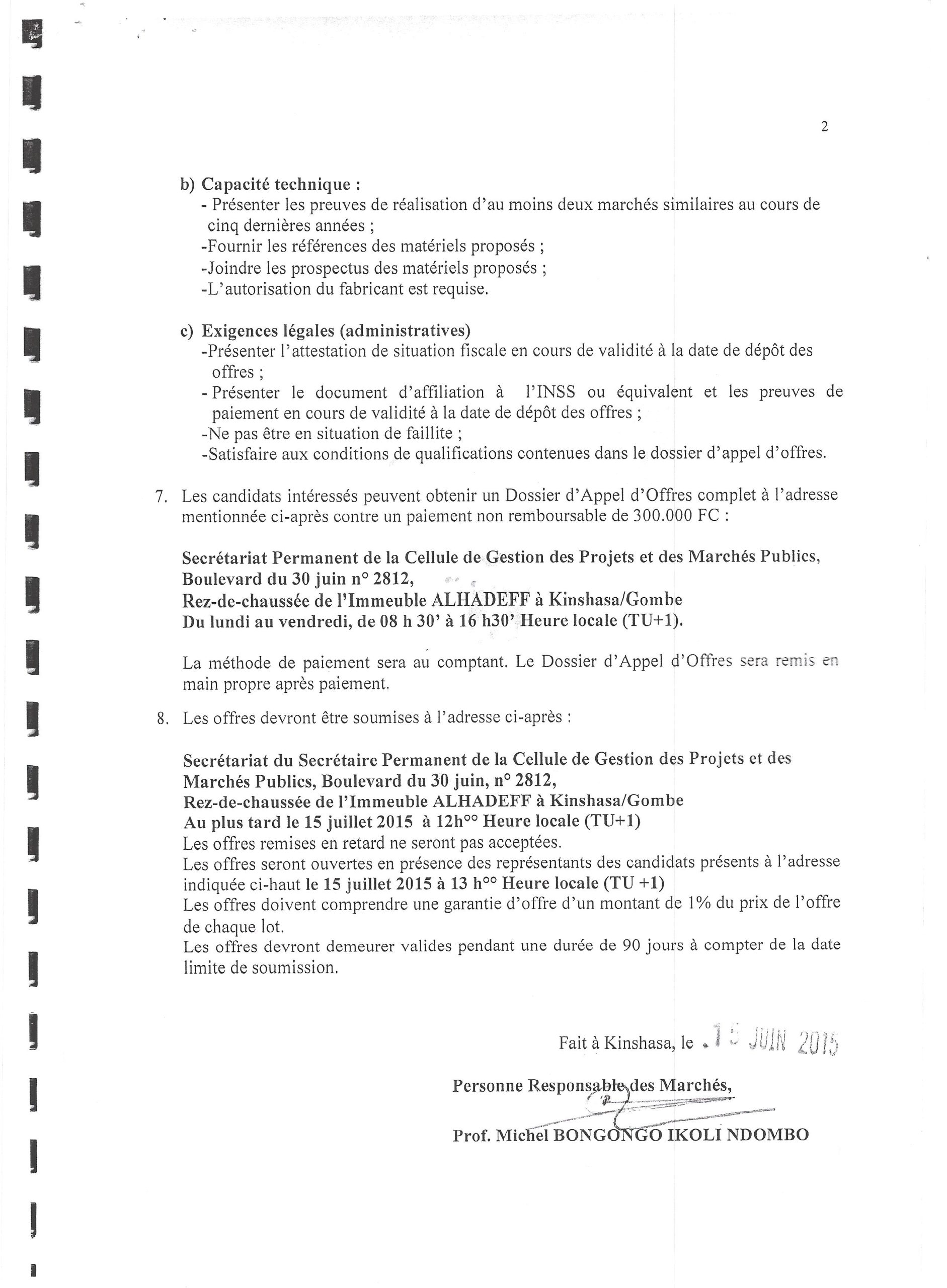 Attribution provisoire accordée à l’entreprise ESSOR EQUIPEMENT relative au marché de fourniture d’équipements et matériel pour l’école technique professionnelle moderne de Manono dans la province du KATANGA.