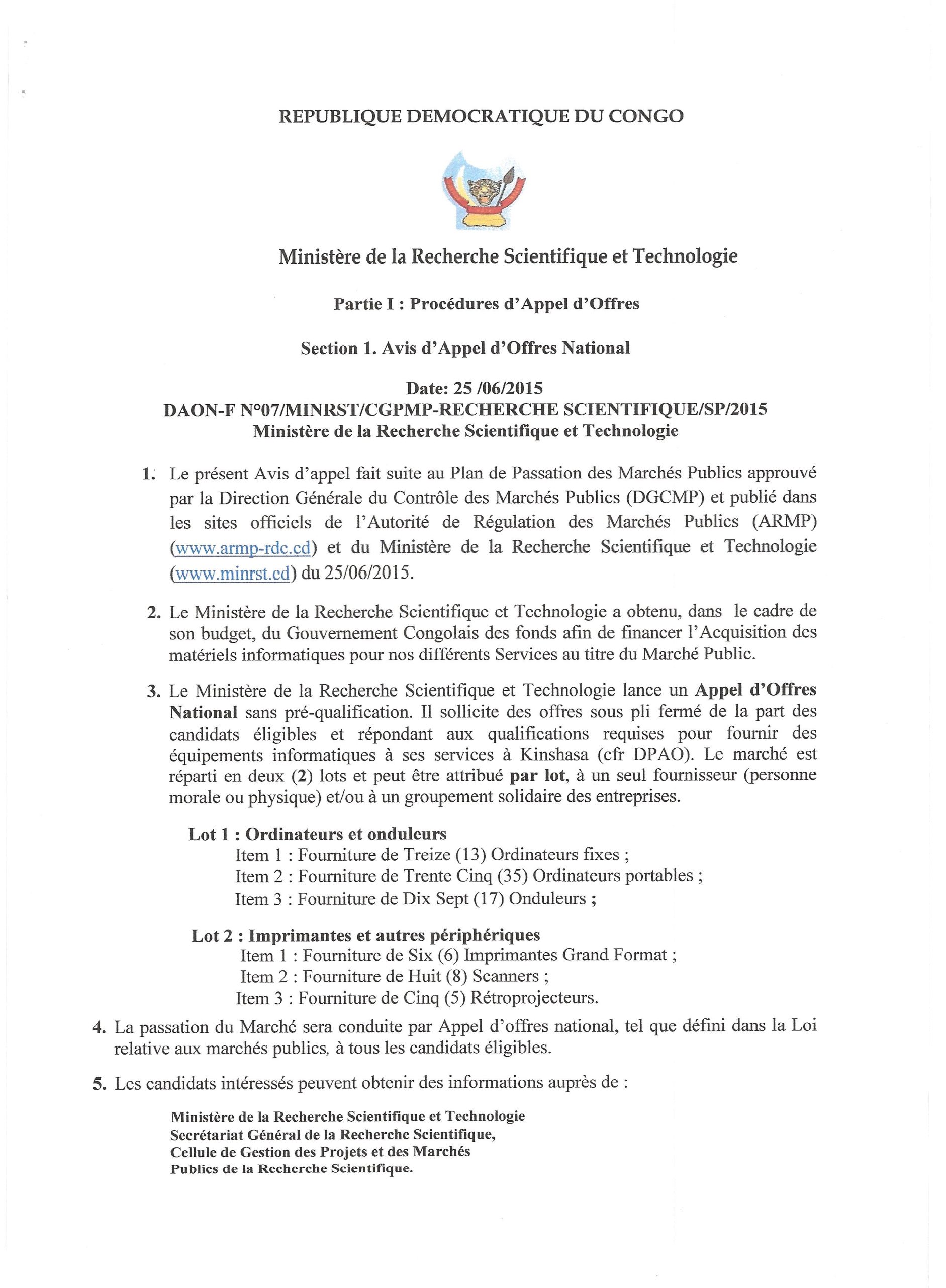 Fourniture des Ordinateurs, Onduleurs, Imprimantes et autres périphériques en faveur du Ministère de la Recherche Scientifique et Technologie.