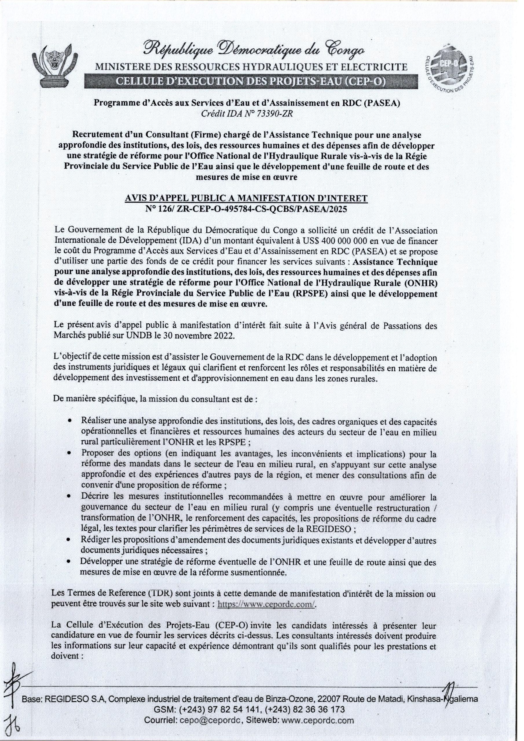 Attribution provisoire accordée à la société “ZHENGWEI TECHNIQUE COOPERATION SARL” le marché relatif aux travaux de réhabilitation et de construction de quelques artères de la voirie urbaine autour du Marché Central de Kinshasa, Phase 1, lot 2 : avenues Rwakadingi (Kasai-Bokassa), Rwakadingi 2 (Kasa-vubu – Huileries), du Marché 2 (Blvd du 30 juin – Jardin Botanique) et du Marché 3 (Rwakadingi – Dima).