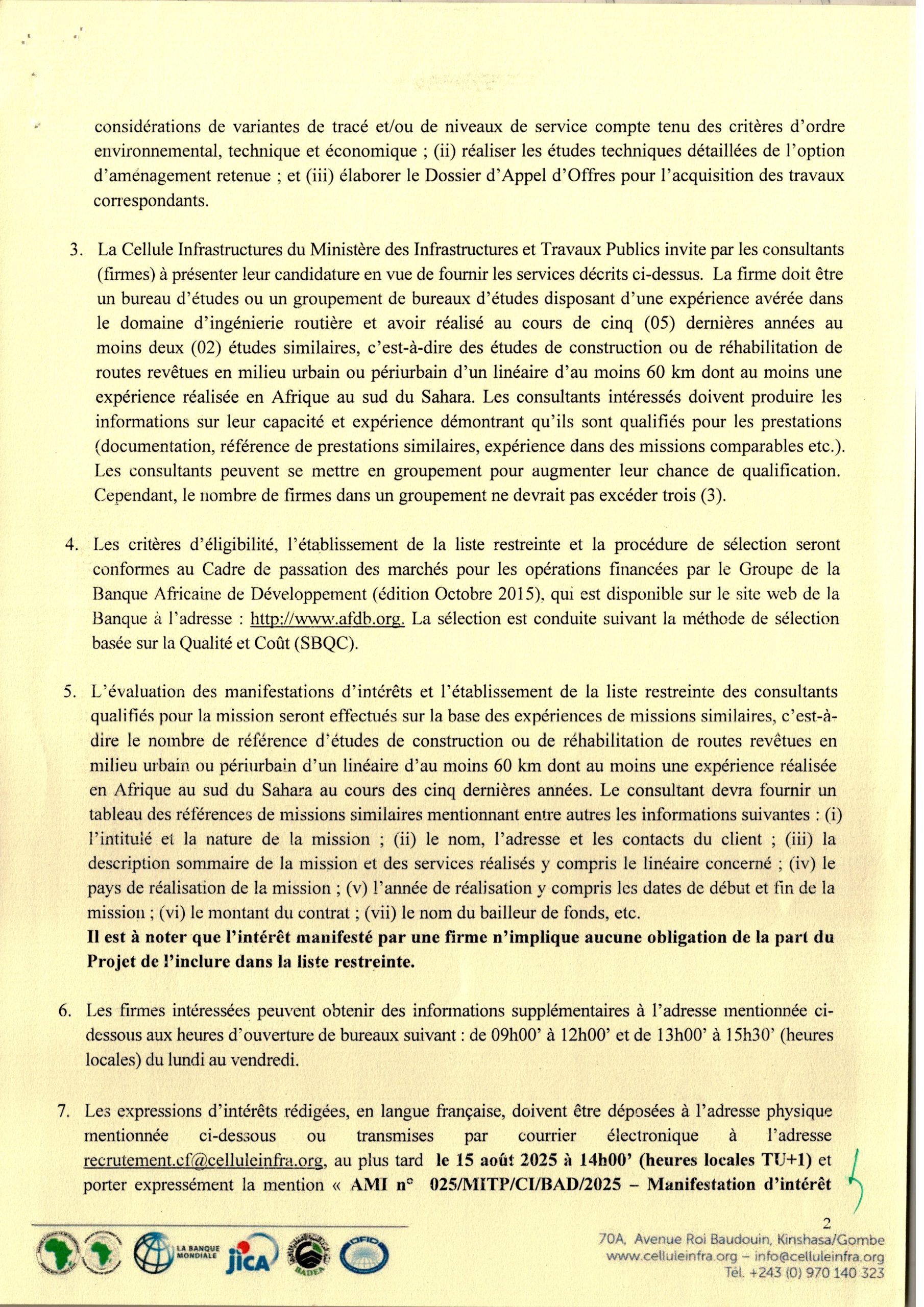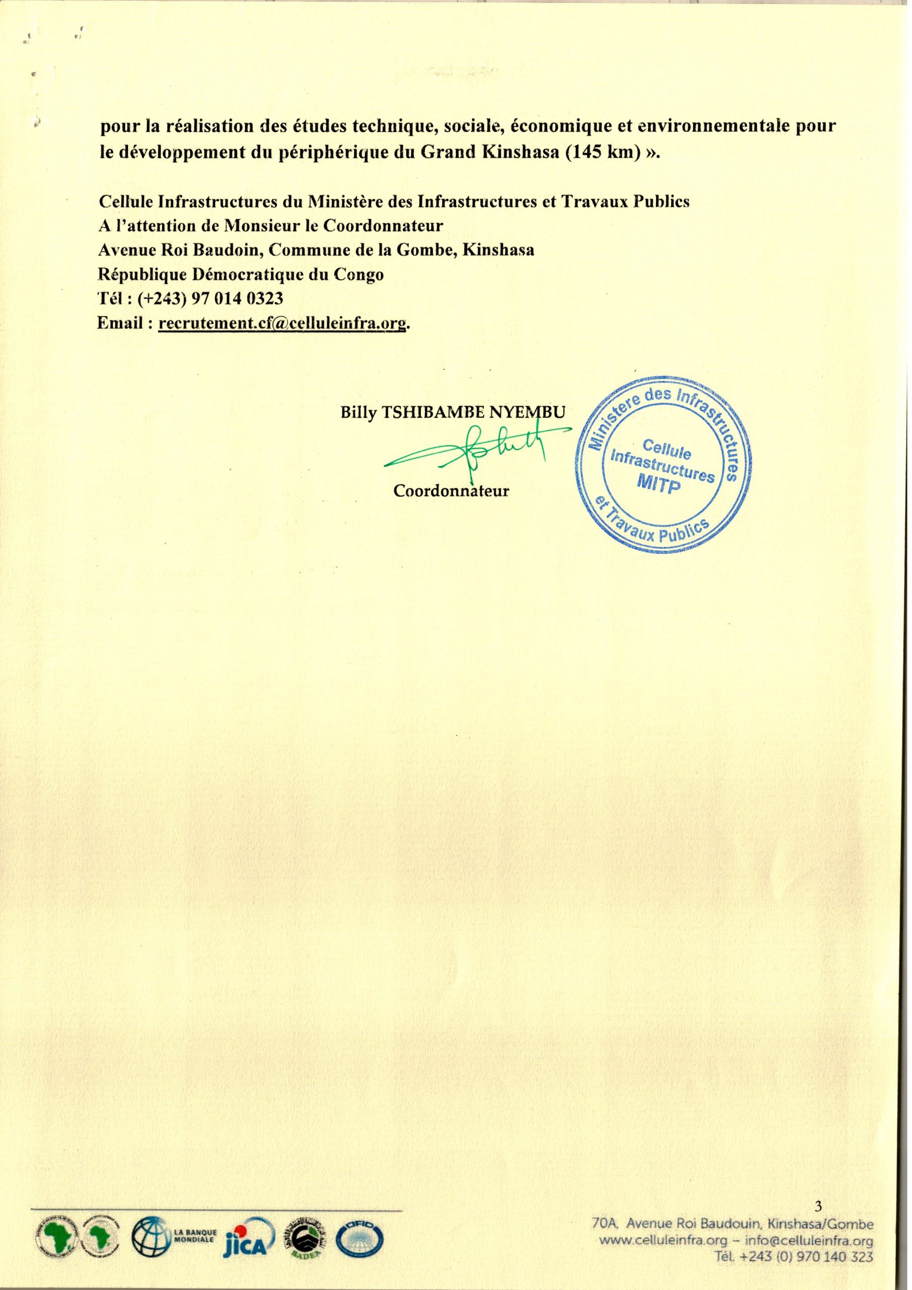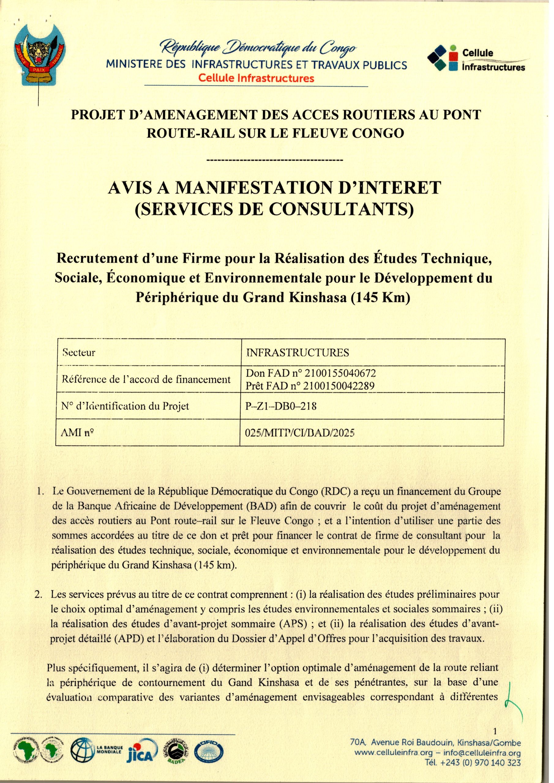 Recrutement d’une Firme pour la Réalisation des Études Technique, Sociale, Economique et Environnement pour le Développement du Périphérique du Grand Kinshasa