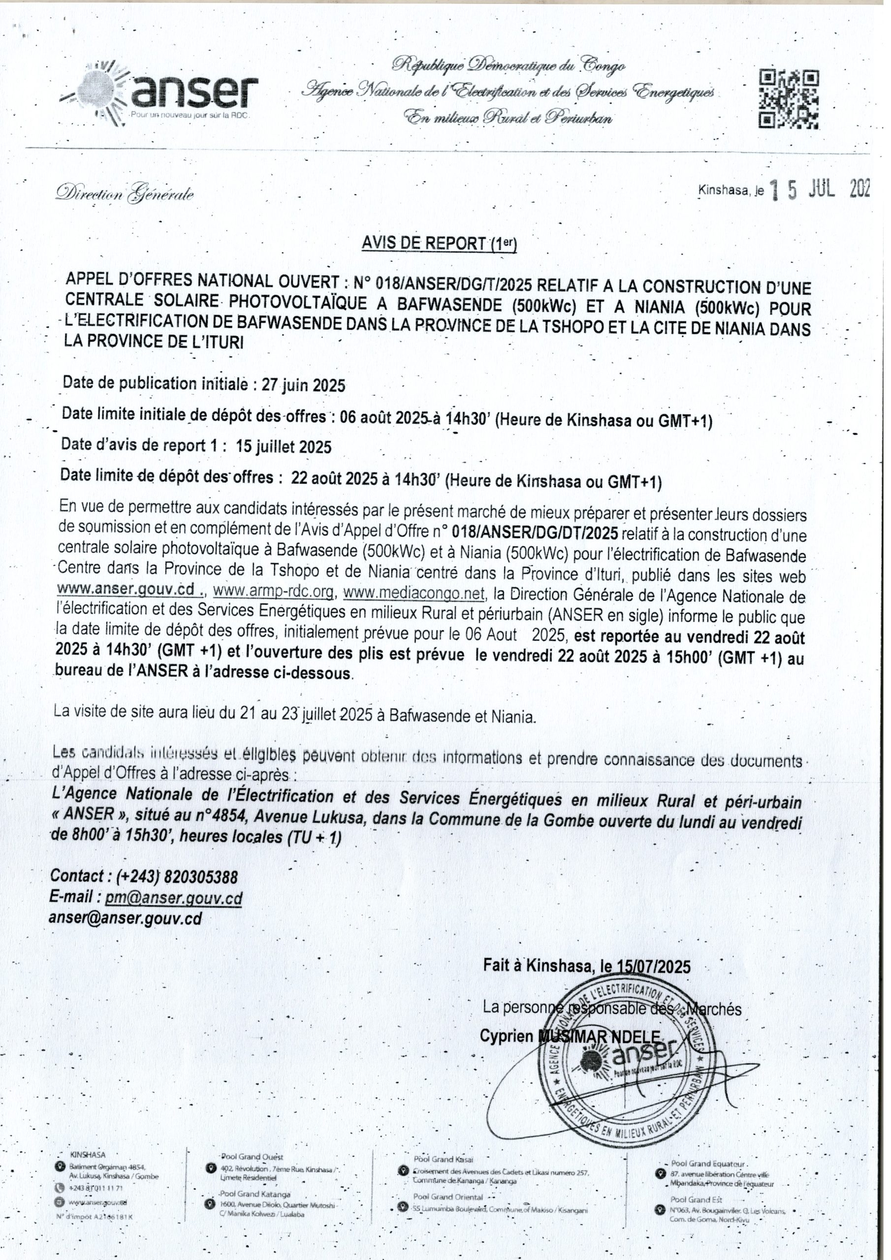 Avis de report du marché relatif aux travaux de construction de la centrale solaire photovoltaique à Lukolela (350kwc), à Bumba (350kwc), à Bokungu (350kwc) pour l’éléctrification de Lukoleladans la province de l’Equateur de Bumba dans la Province de la Mongala et de Bokungu dans la Province de la Tshuapa.