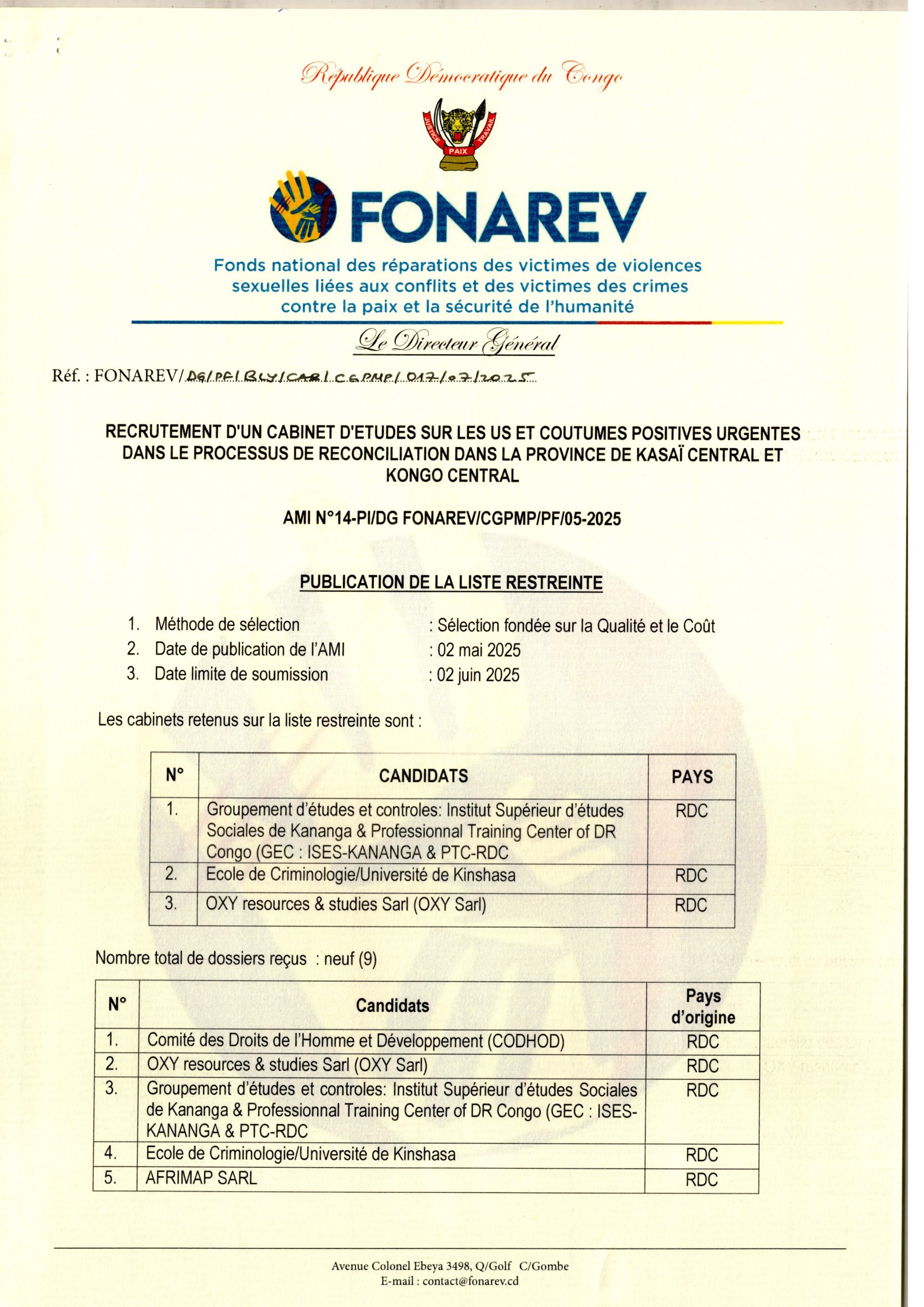 Recrutement d’un cabinet d’études sur les US et coutumes positives urgentes dans le processus de réconciliation dans la province de Kasaï Central et Kongo Central.