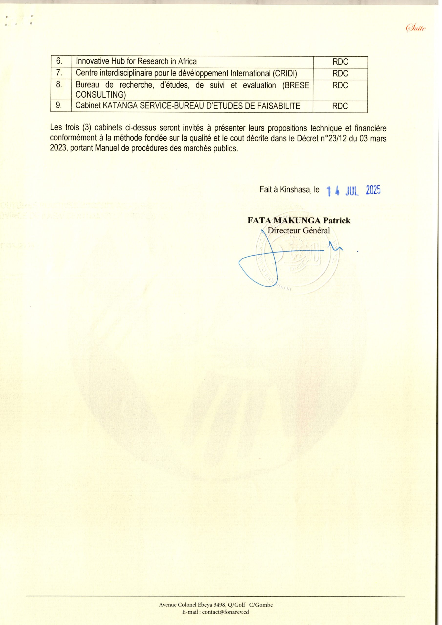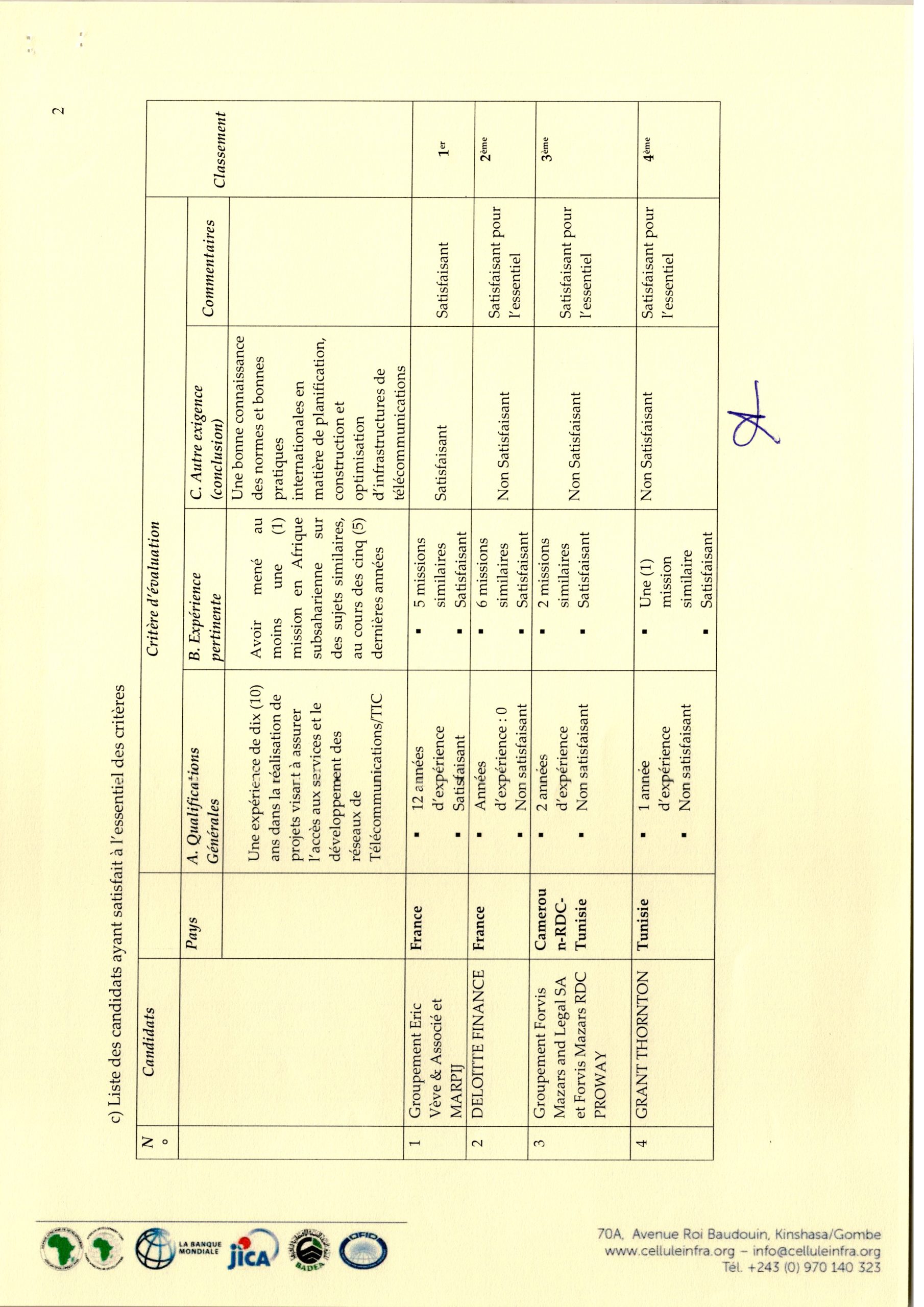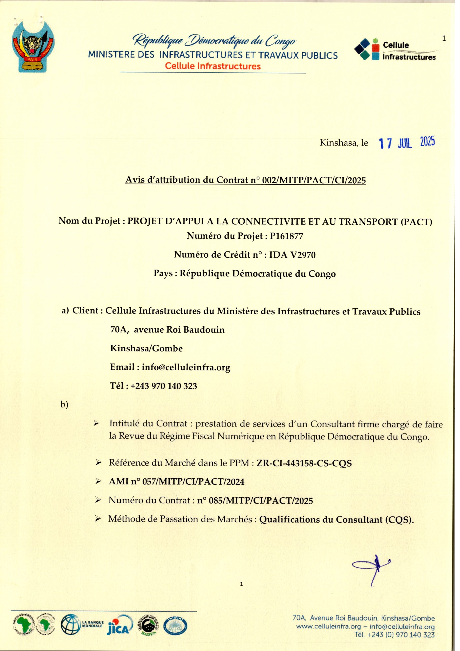 Prestation de services d’un cabinet de consultant pour l’Assistance Technique à la mise en place des normes techniques et des règles d’ingénierie et d’esthétique relatives à la pose d’infrastructures en fibre optique en RDC.