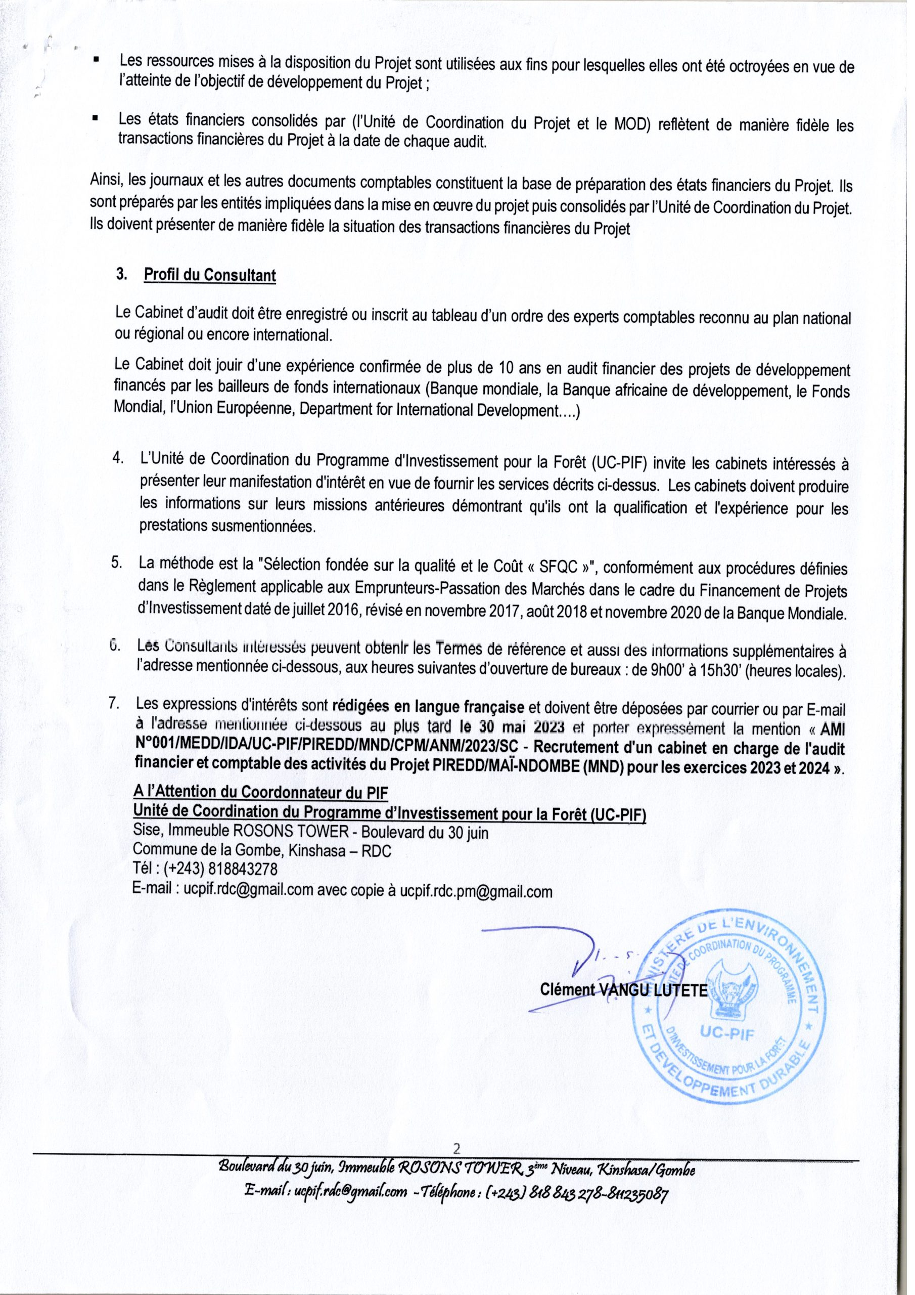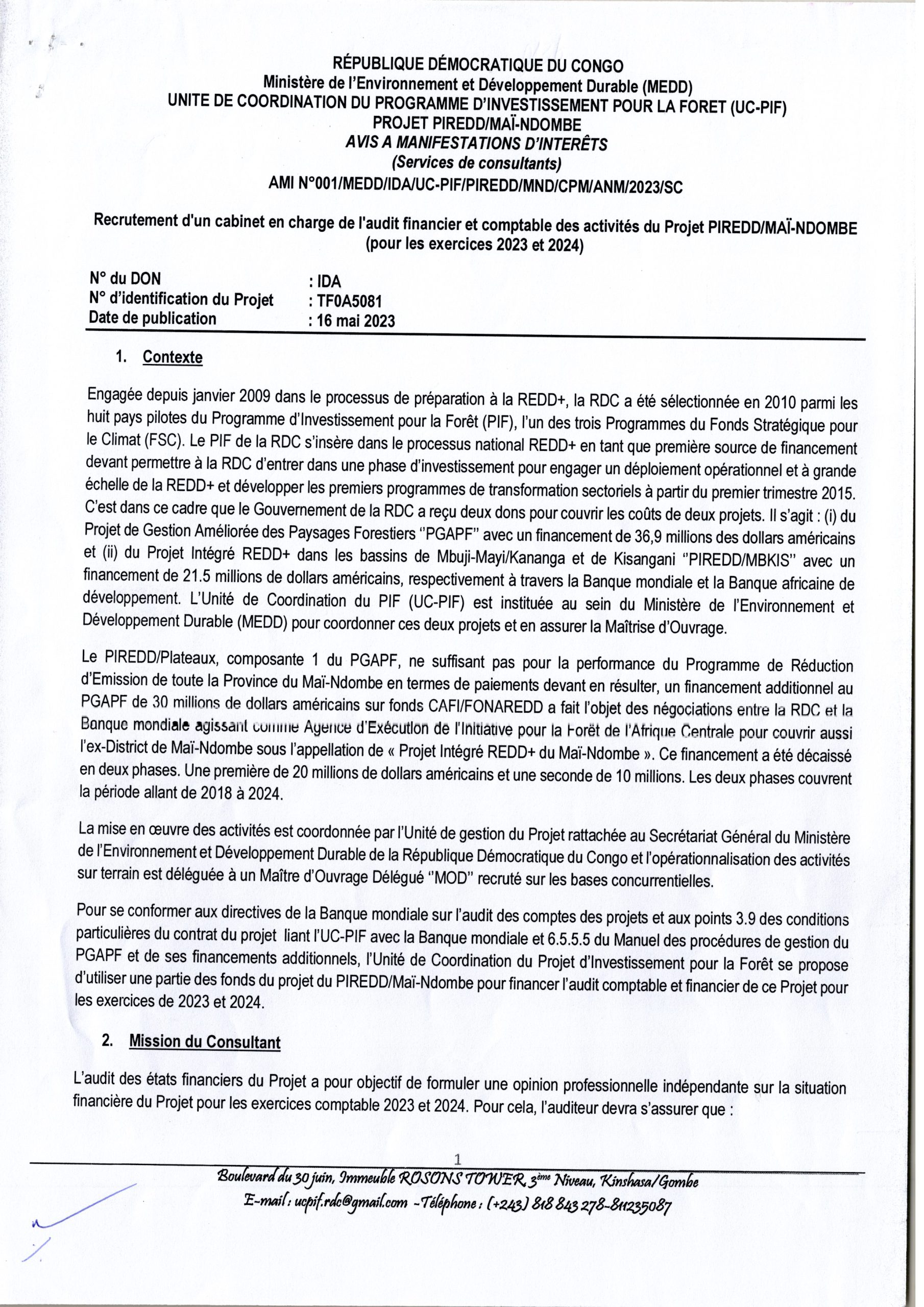 Recrutement d’un cabinet en charge de l’audit financier et comptable des activites du Projet PIREDD/MAI-NDOMBE (Pour les exercices 2023 et 2024)