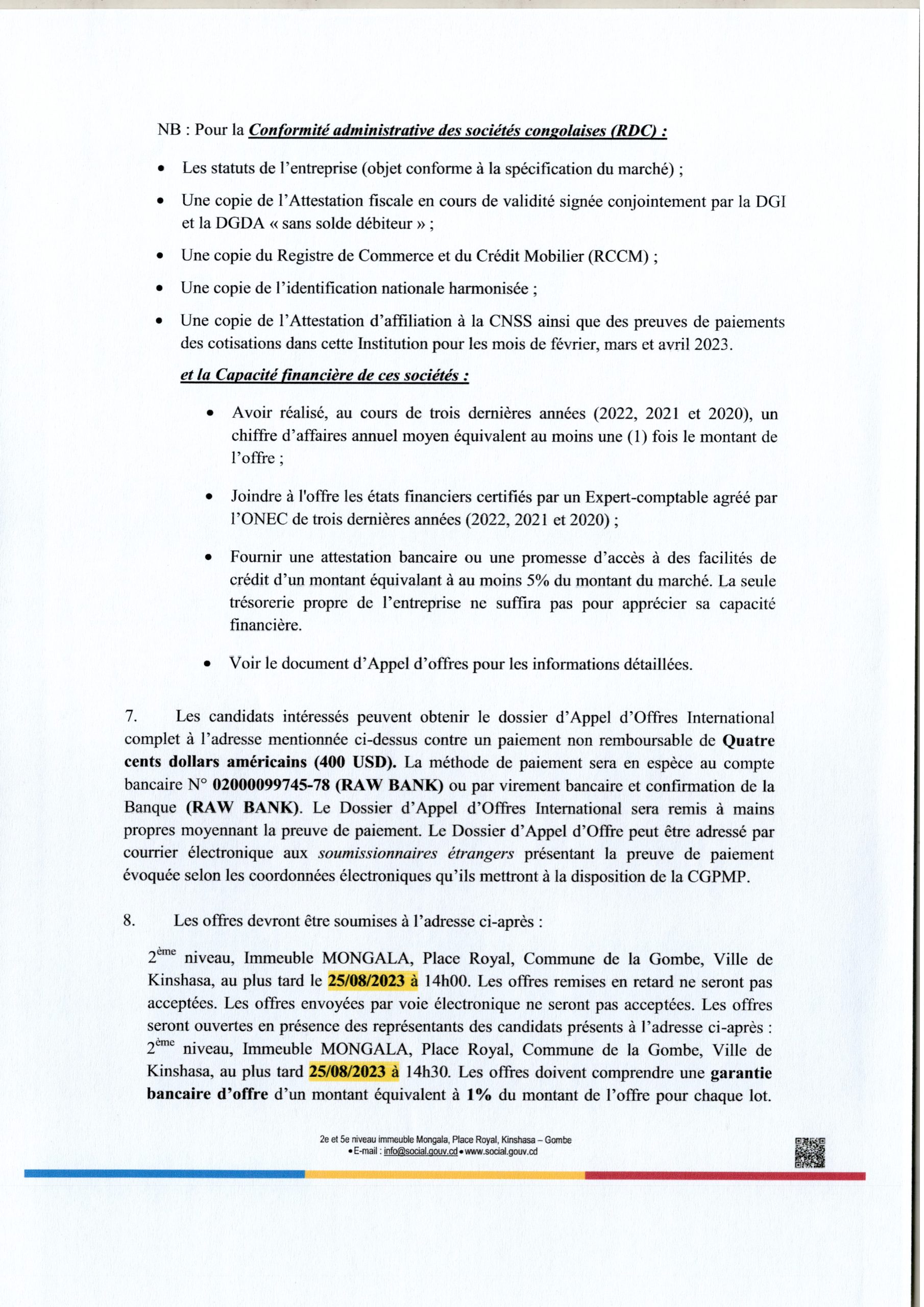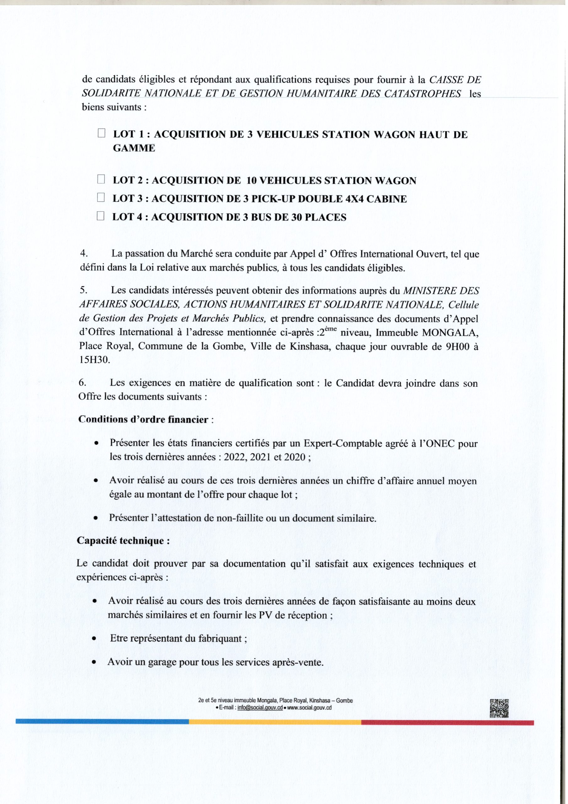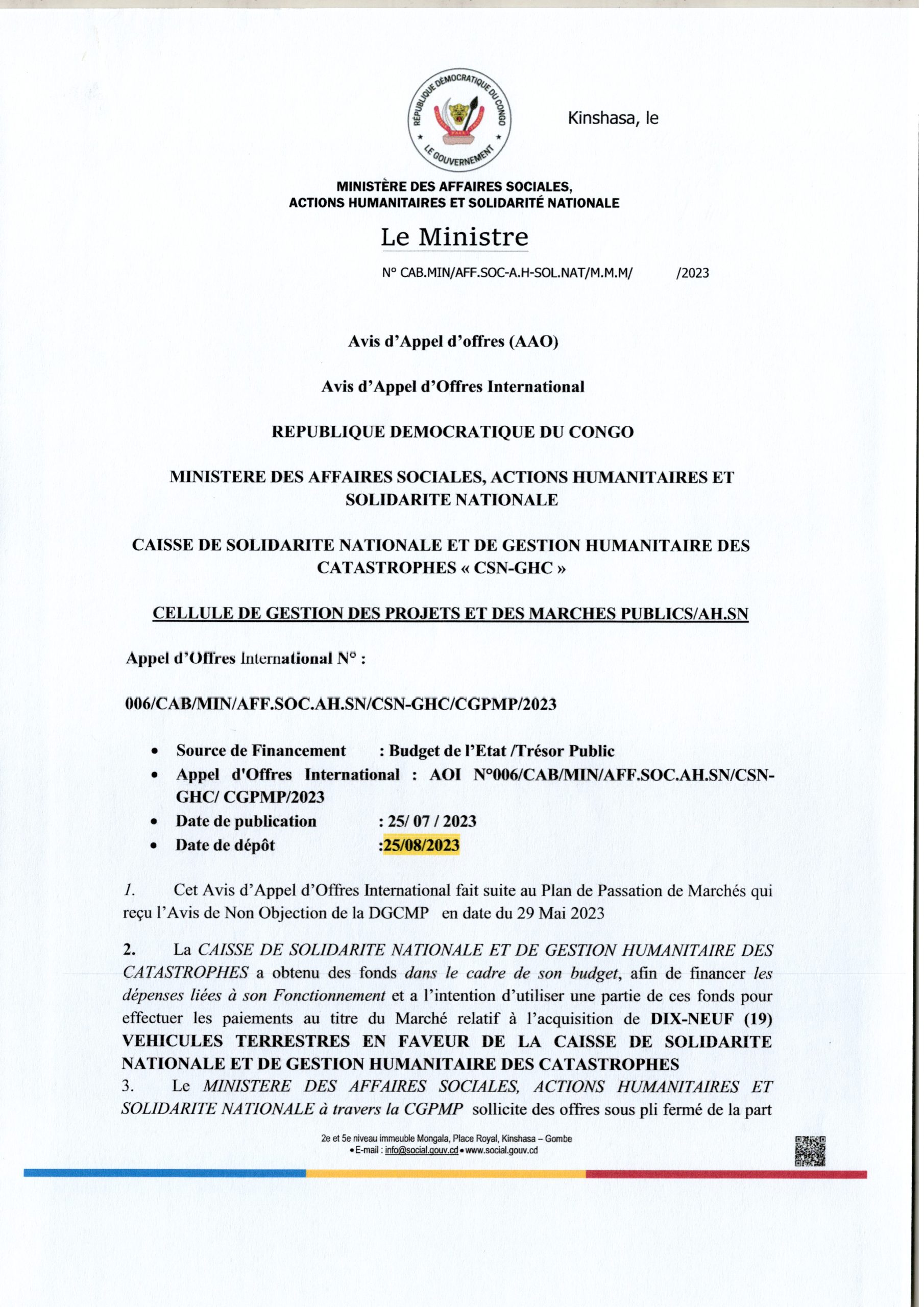 Acquisition de dix-neuf (19) véhicules Terrestres en faveur de la Caisse de solidarité Nationale et de Gestion Humanitaire des catastrophes.