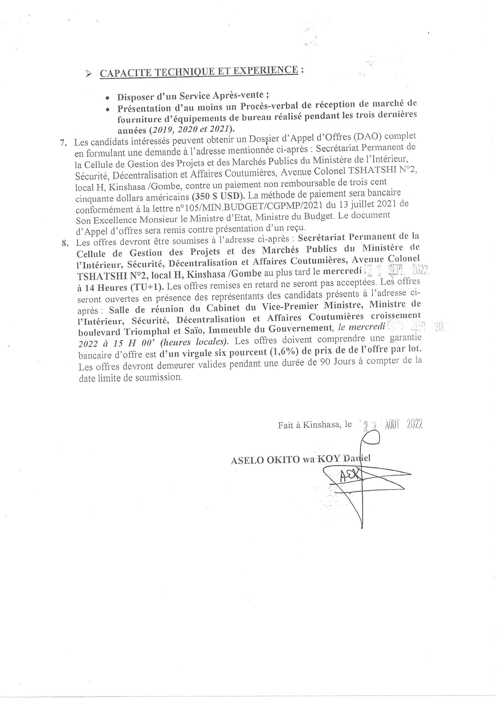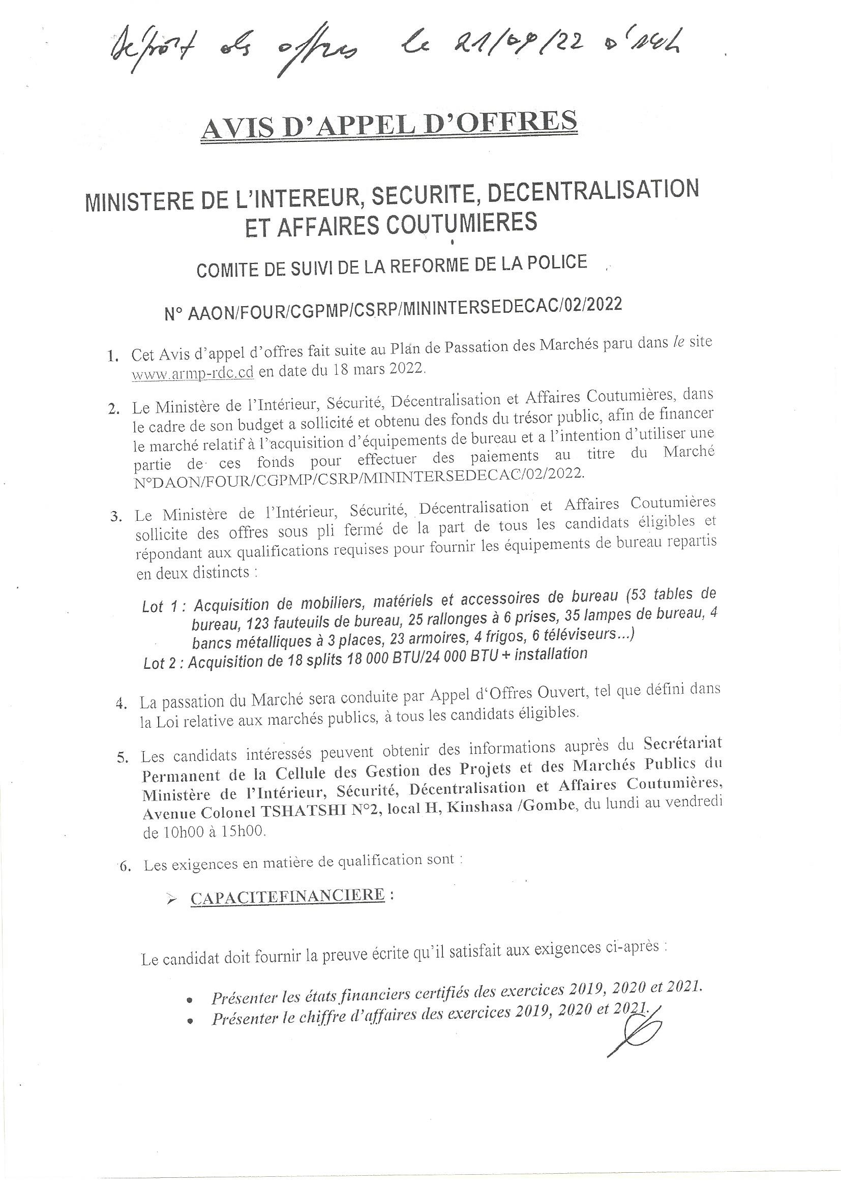Acquisition de mobiliers, matériels et accessoires de bureau (53 tables de bureau, 123 fauteuils de bureau pour lot 1 et Acquisition de 18 splits 18 BTU/24 000 BTU + installation pour lot 2