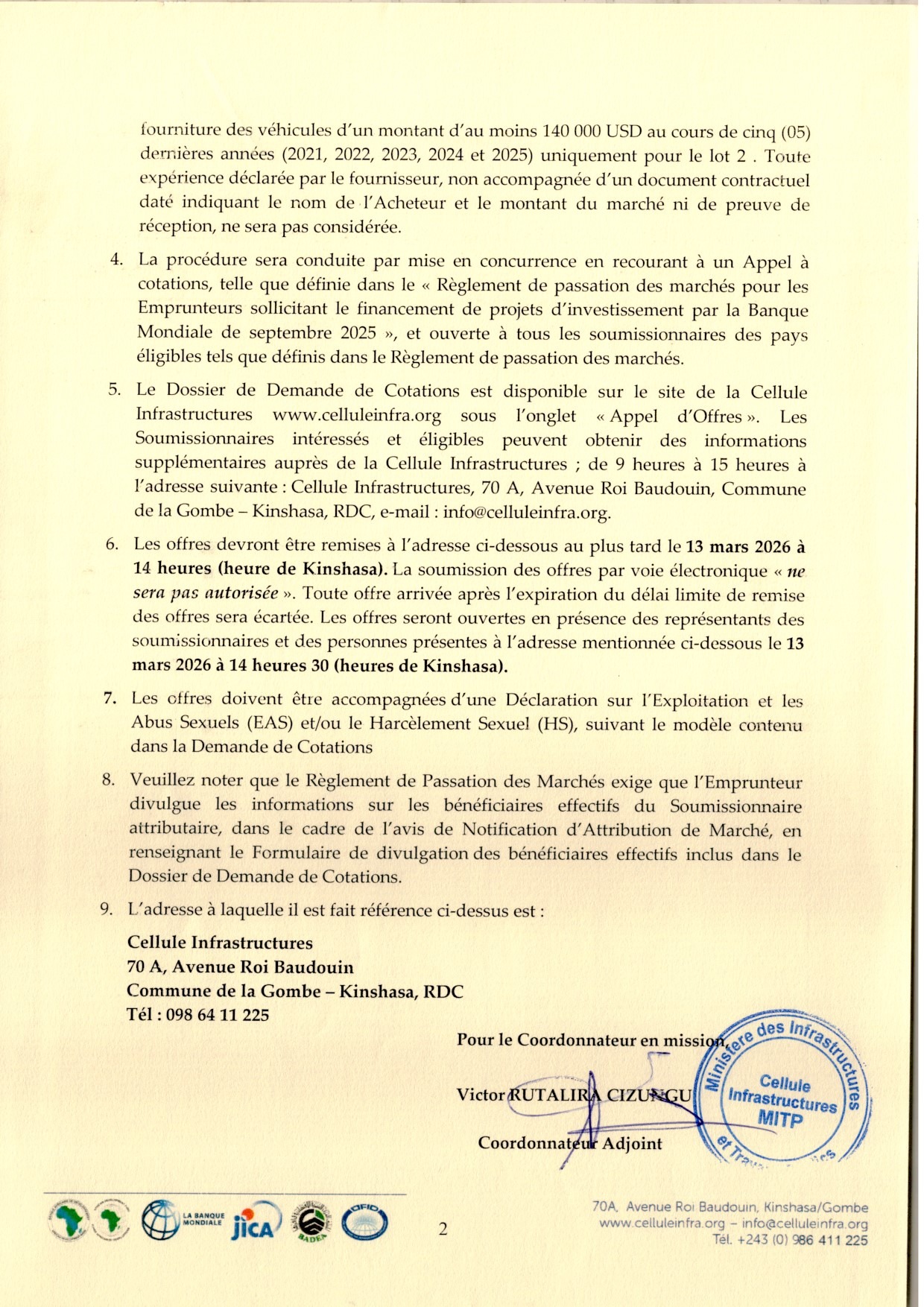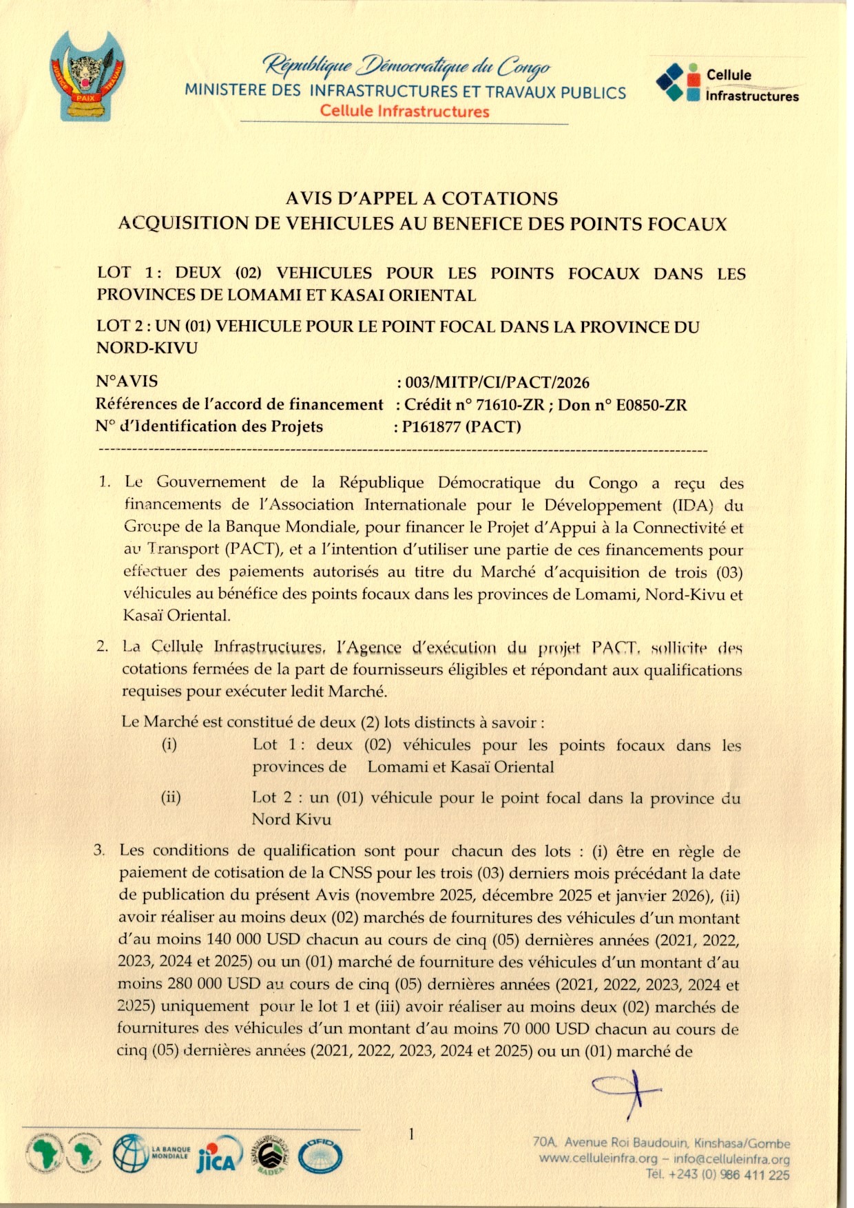 Acquisition de trois (03) véhicules au bénéfice des points focaux dans les provinces de Lomami, Nord-Kivu et Kasaï-Oriental (lot 1 et 2).