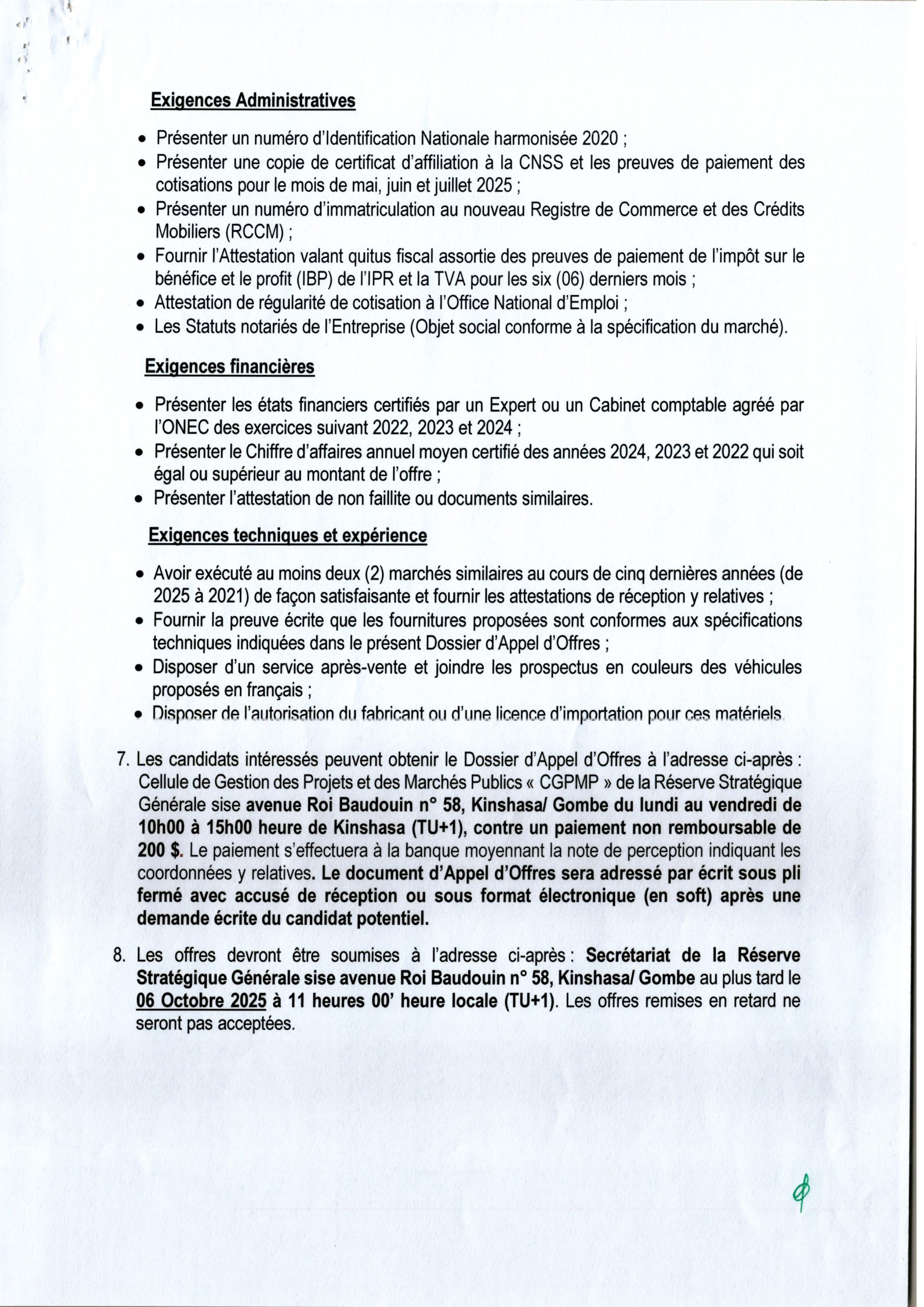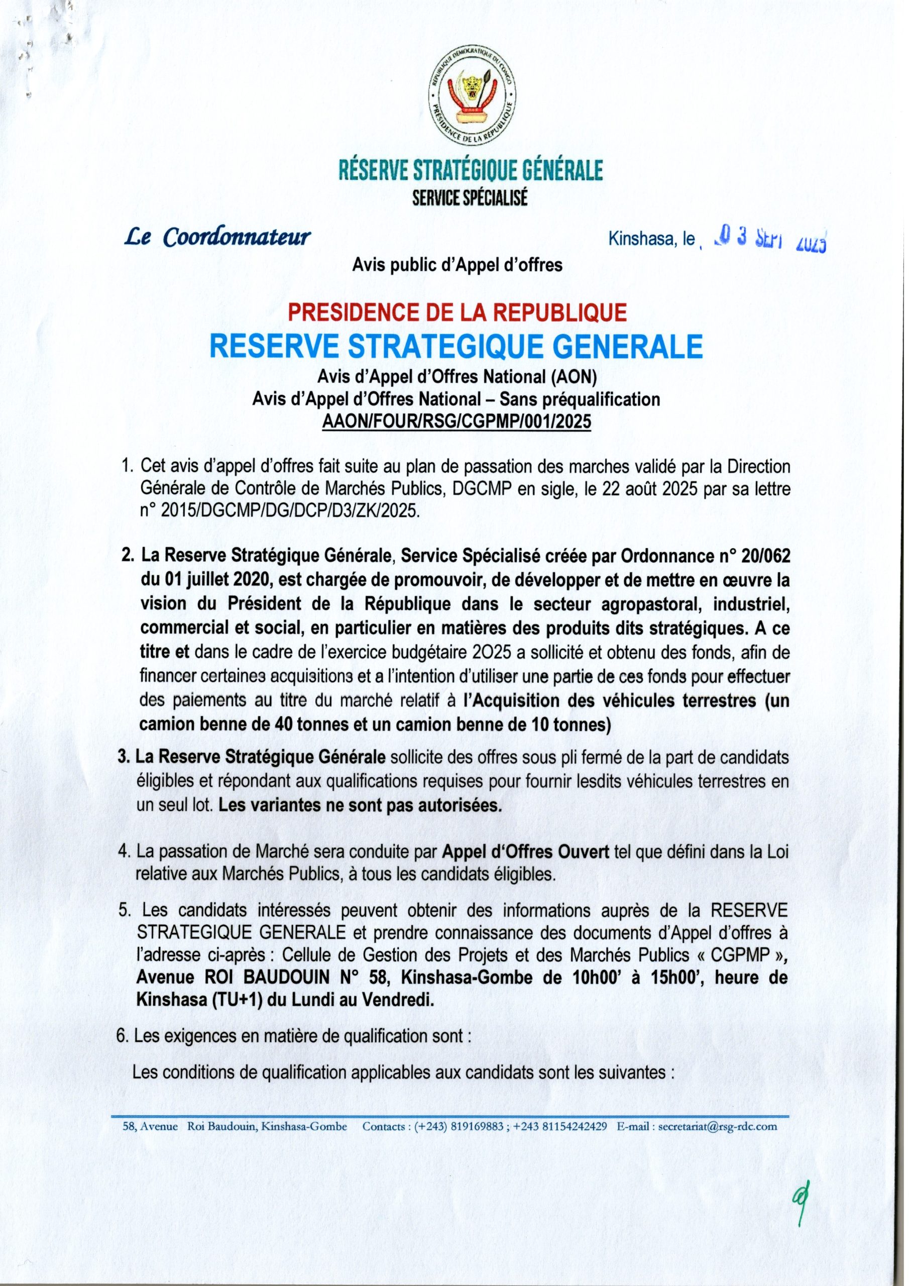 Acquisition de véhicules terrestres (camion benne de 40 tonnes et un camion benne de 10 tonnes).