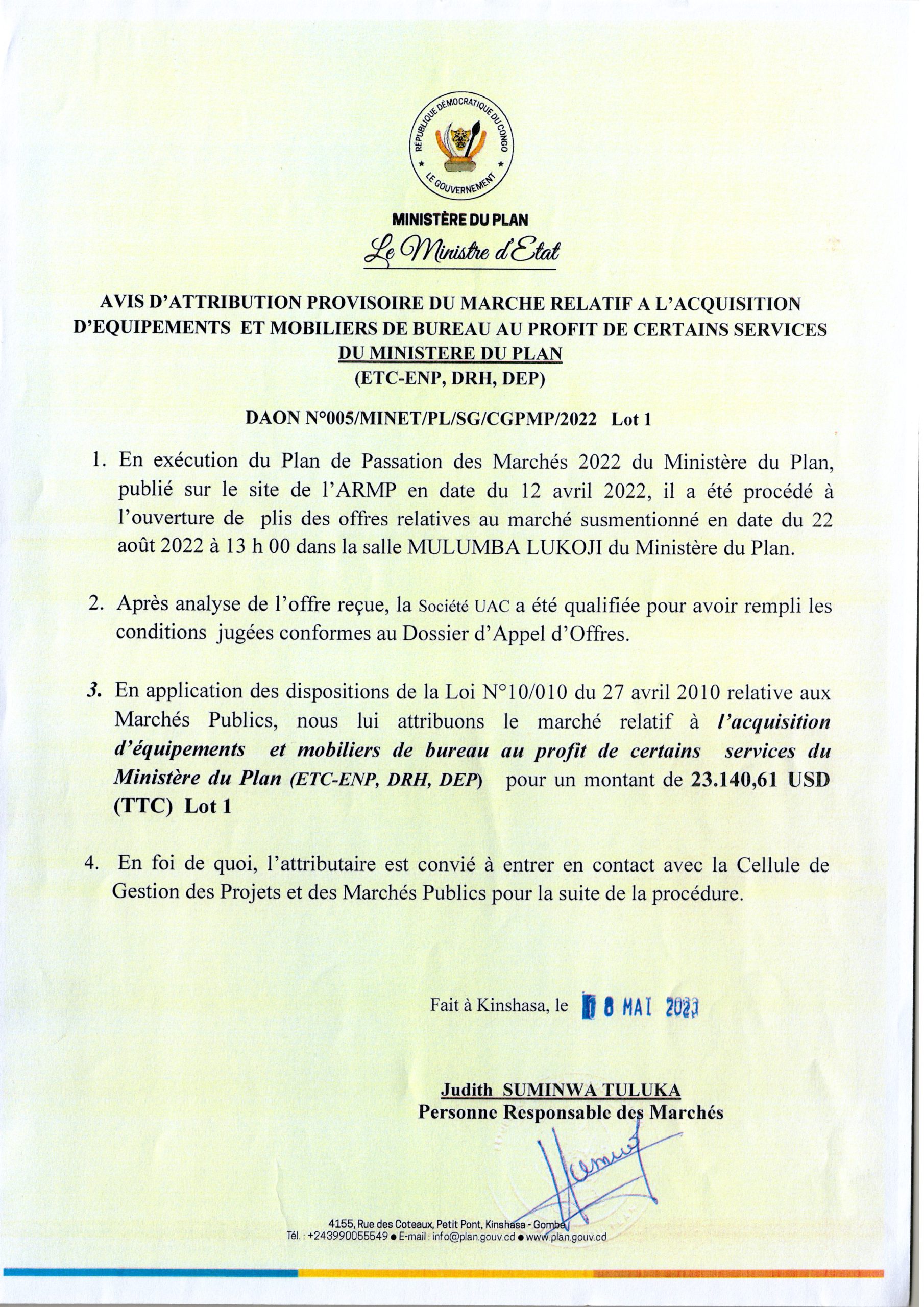 Attribution provisoire relative à l’acquisition d’équipements et mobiliers de bureau au profit de certains services du Ministère du Plan (ETC-ENP, DRH, DEP) lot 1