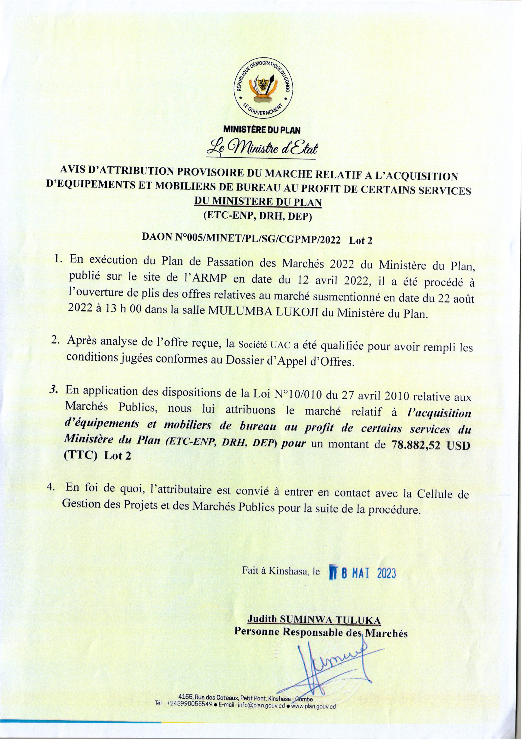 Attribution provisoire relative à l’acquisition d’équipements et mobiliers de bureau au profit de certains services du Ministère du Plan (ETC-ENP, DRH, DEP) lot 2