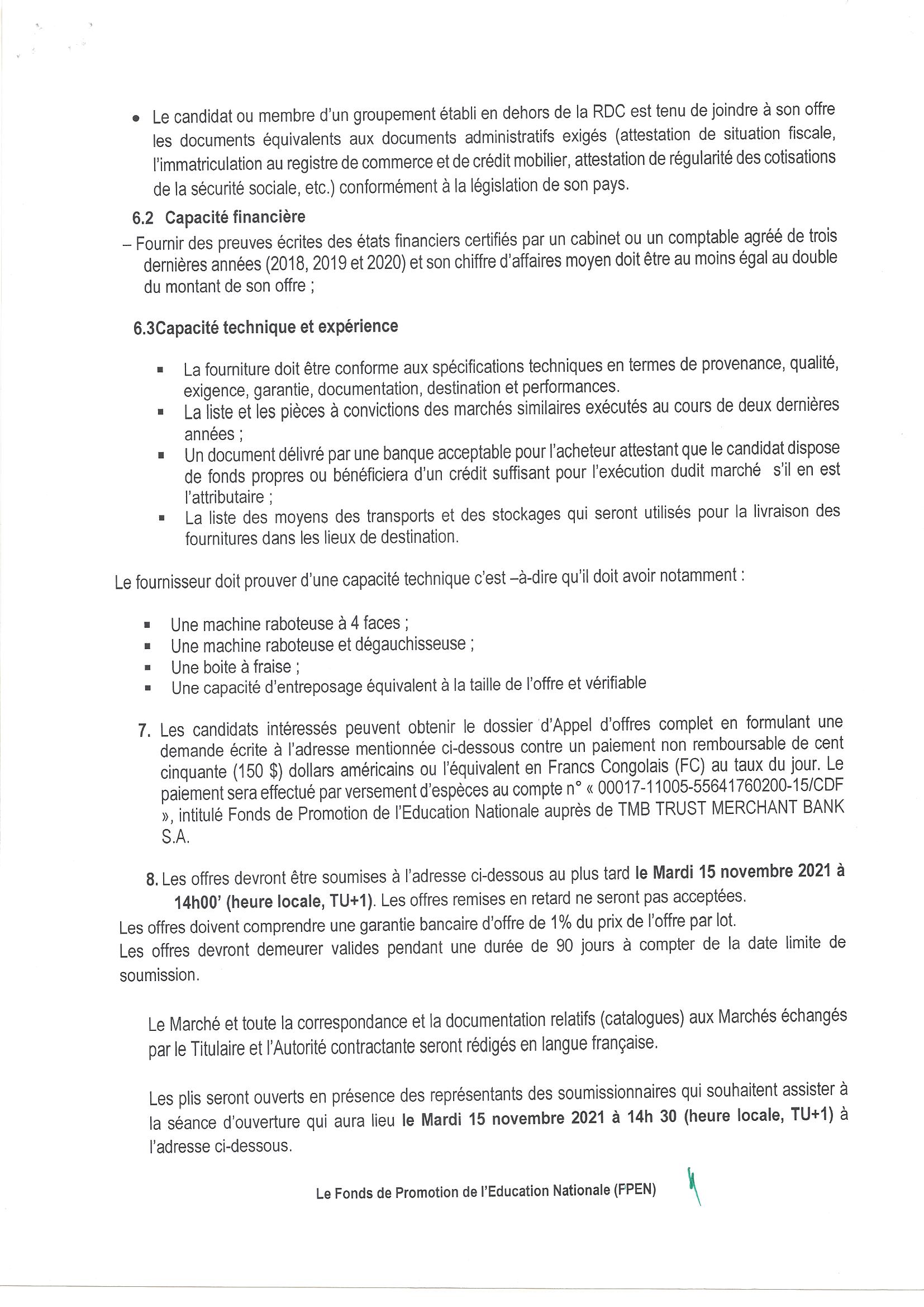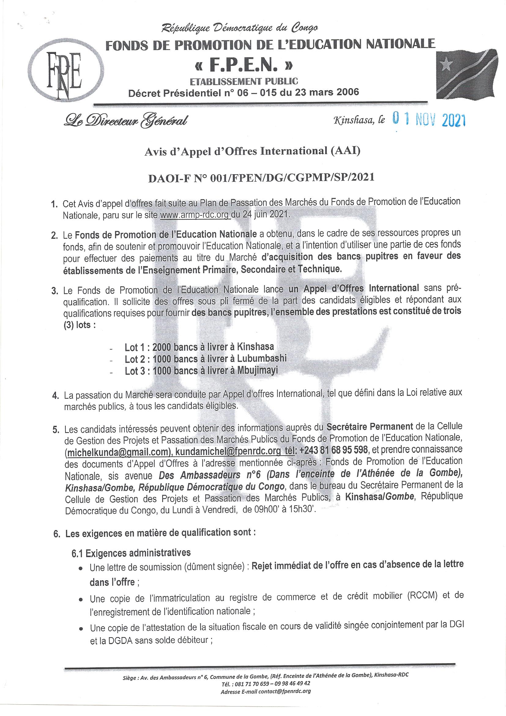 Acquisition des bancs pupitres en faveur des établissements de l’enseignement primaire, secondaire et technique.