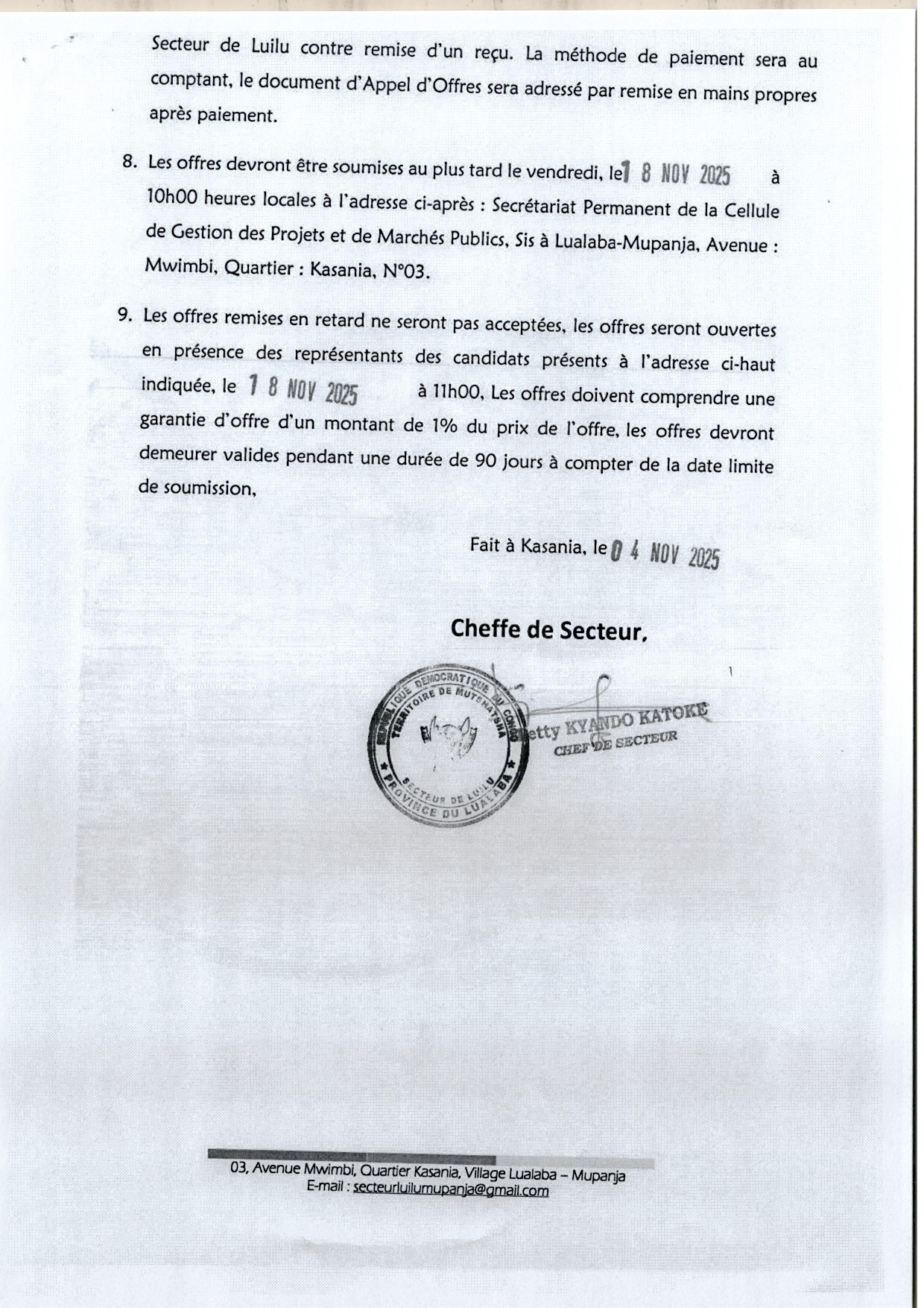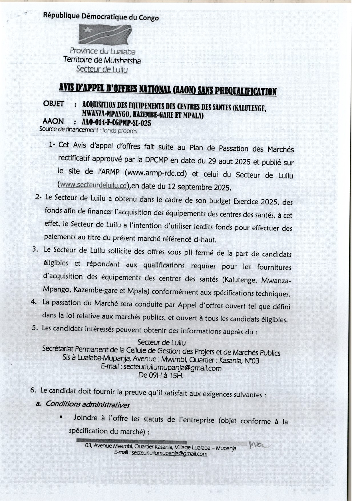 Acquisition des Équipements des Centres des Santés ( KALUTENGE, MWANZA-MPANGO, KAZEMBE-GARE ET MPALA)