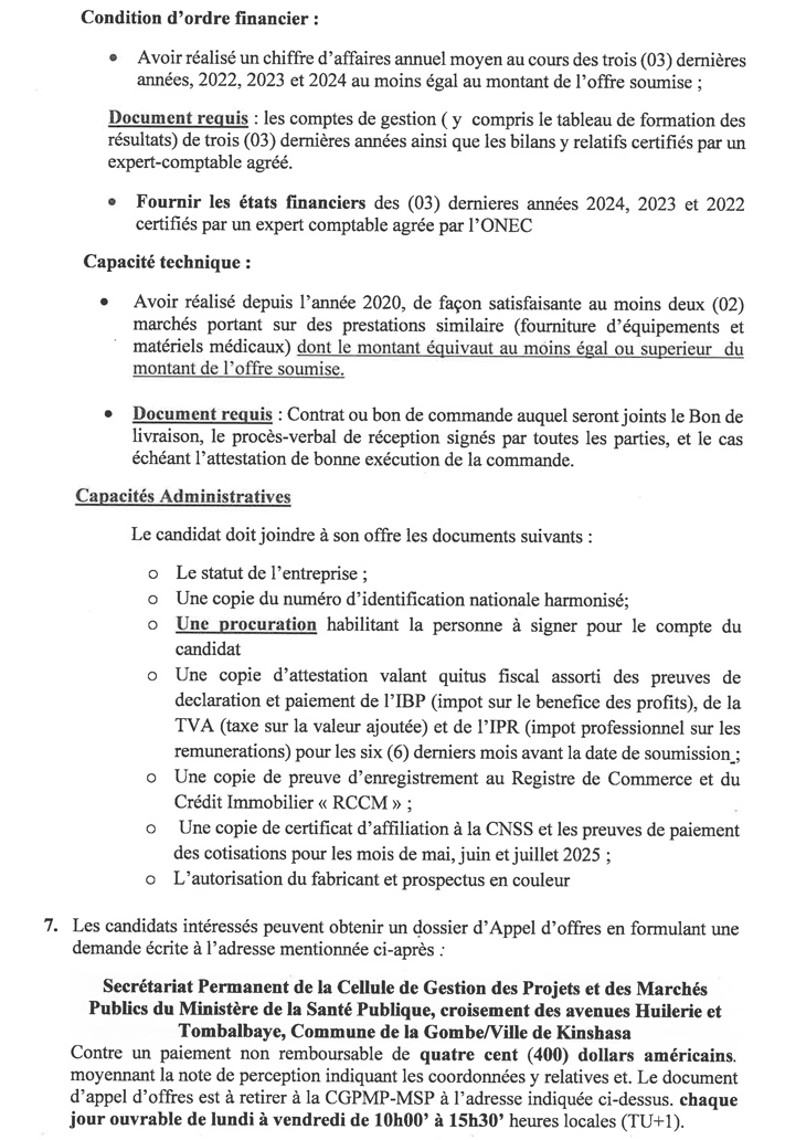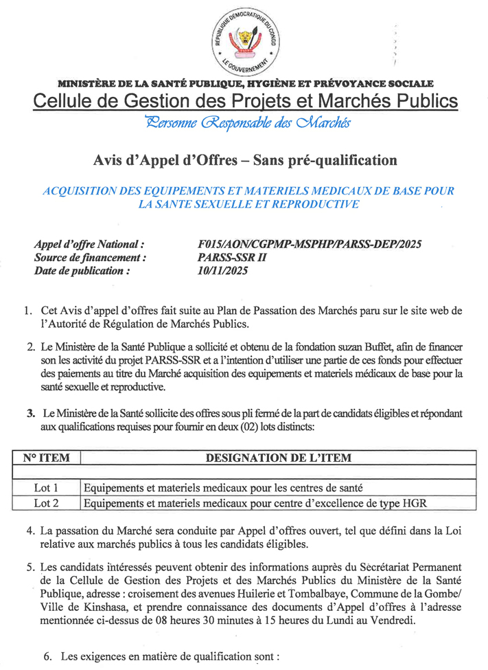 Acquisition des équipements et matériels médicaux de base pour la santé sexuelle et reproductive.