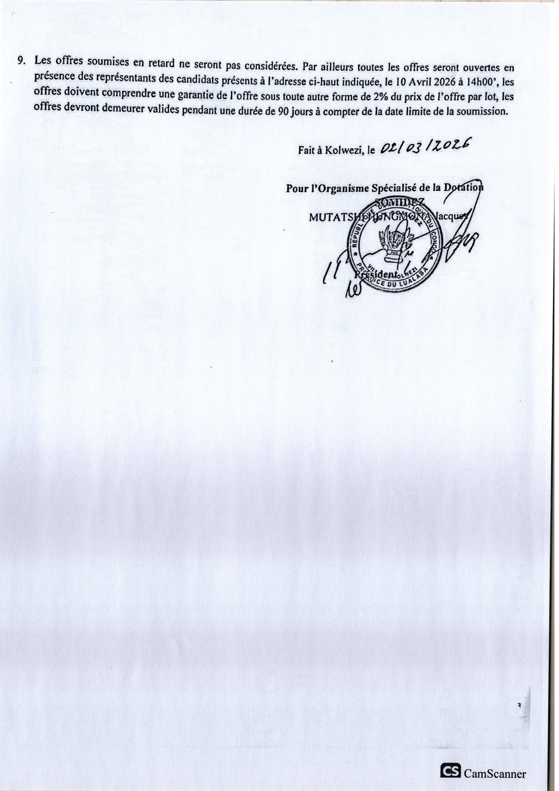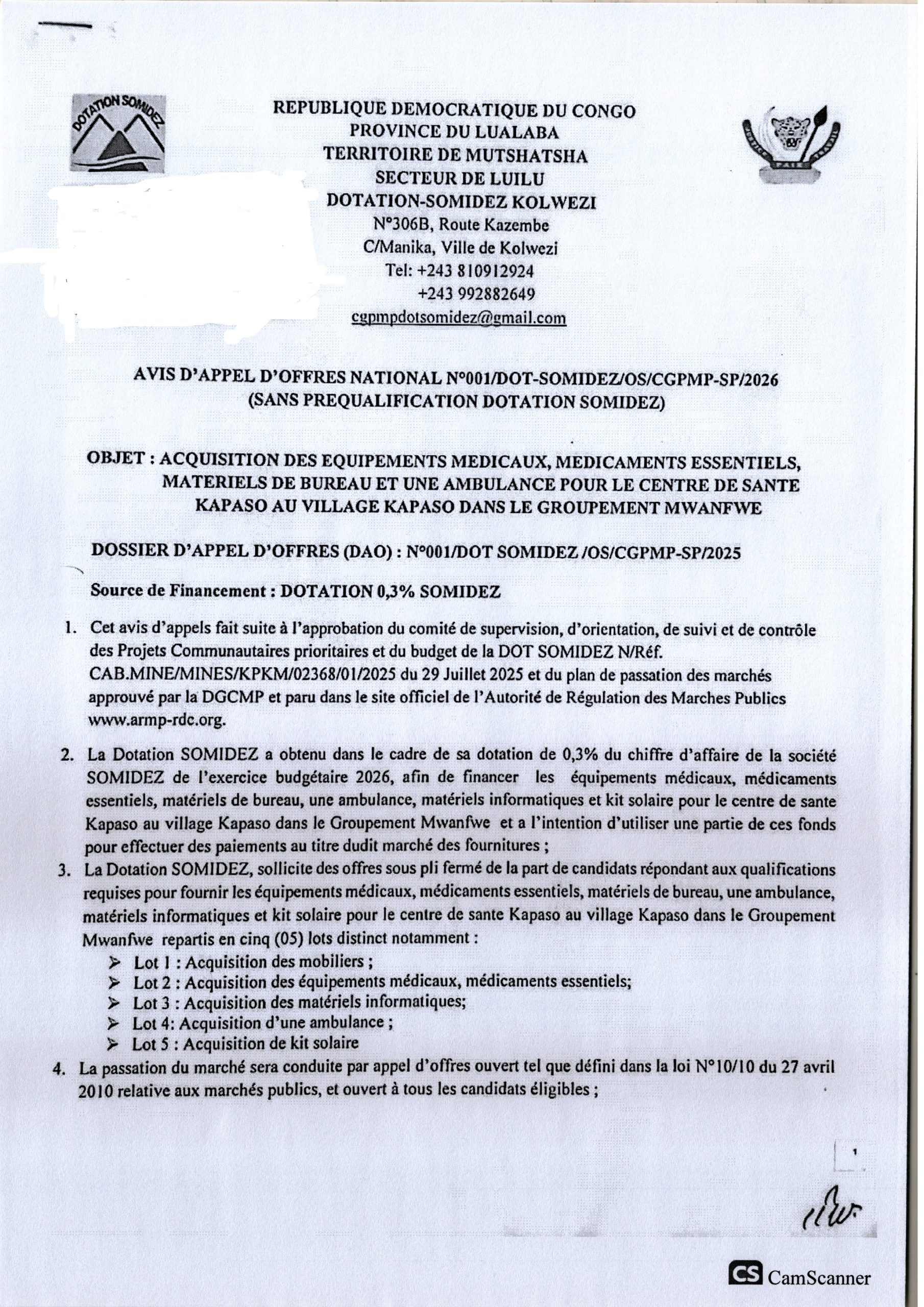 Acquisition des équipements médicaux, médicaments essentiels, matériels de bureau et une ambulance pour le centre de santé KAPASO au village Kapaso dans le groupement Mwanfwe.