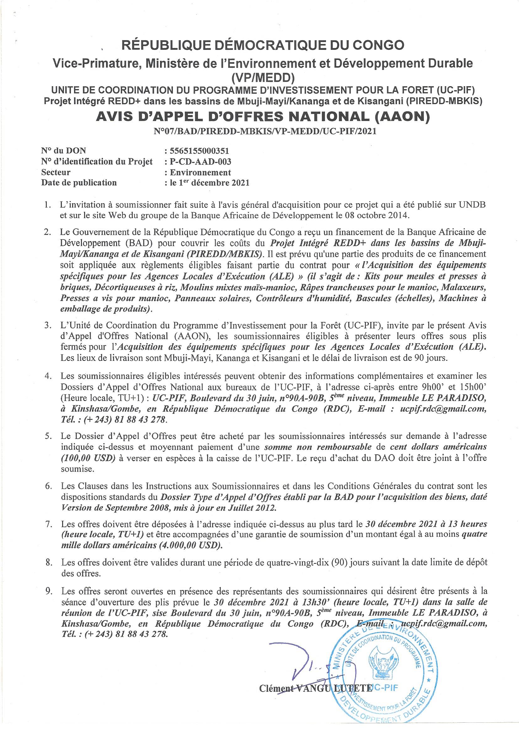 Acquisition des équipements spécifiques pour les agences locales d’exécution (ALE).