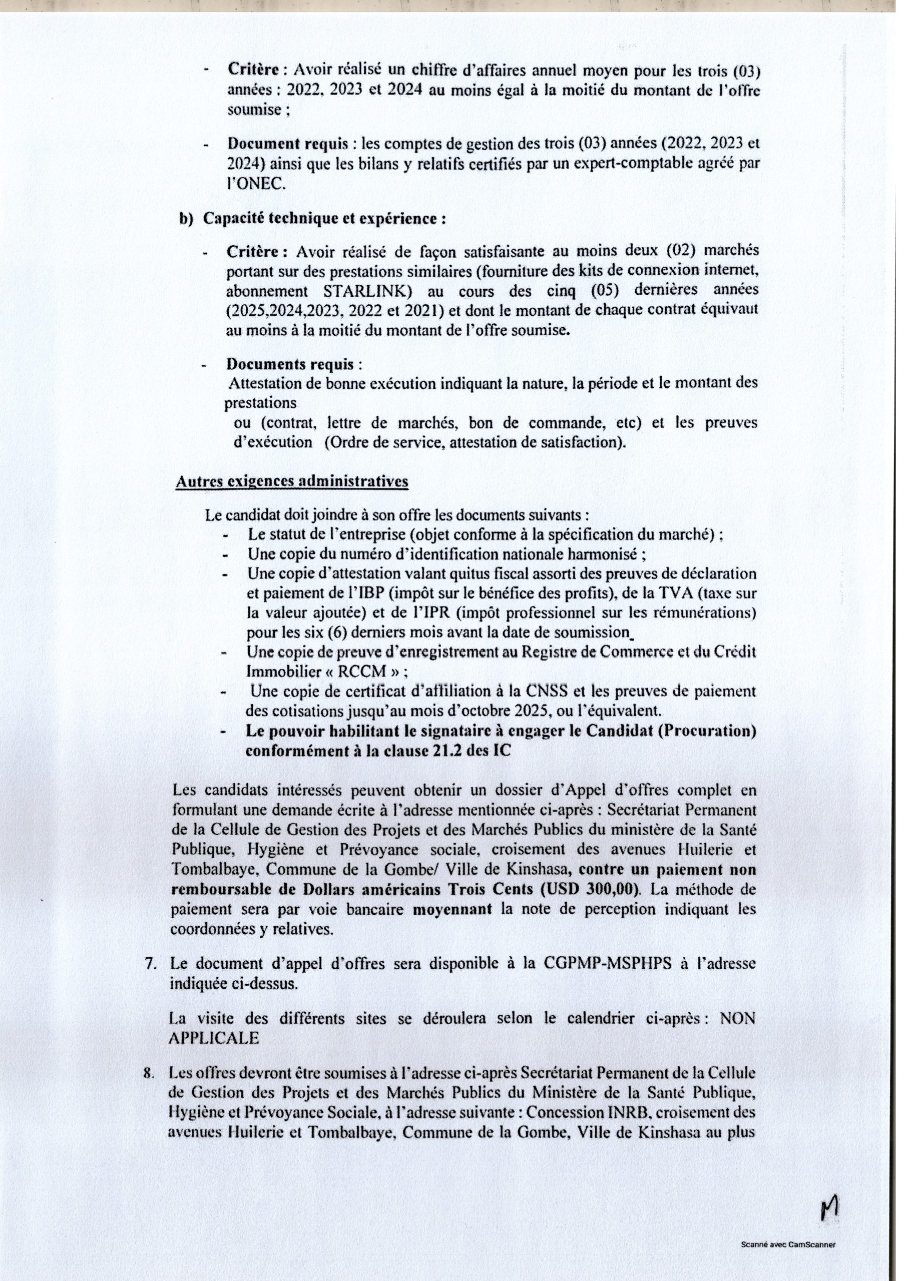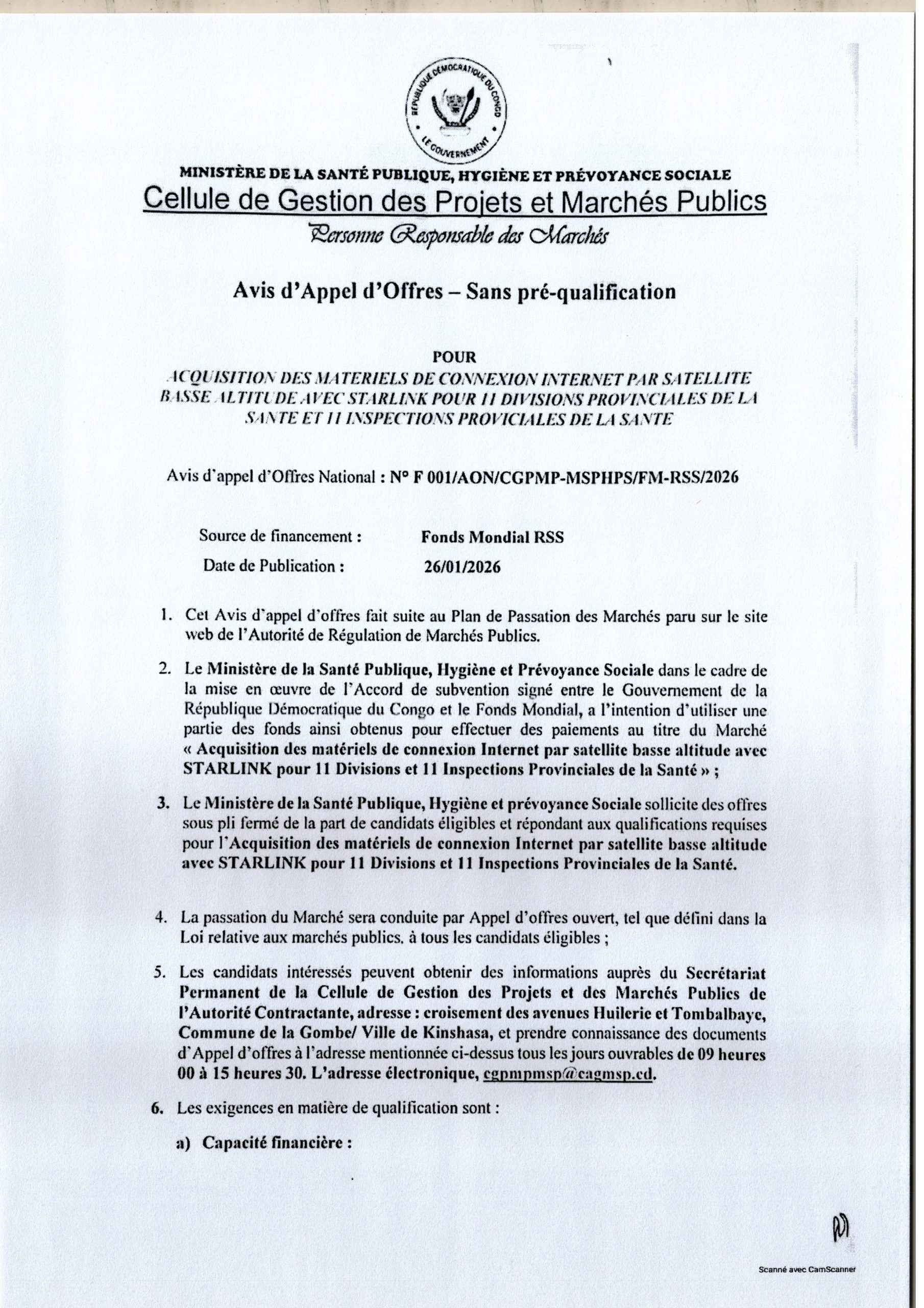 Acquisition des matériels de connexion Internet par Satellite basse altitude avec STARLINK pour 11 divisions provinciales de la Santé et 11 inspections provinciales de la Santé.