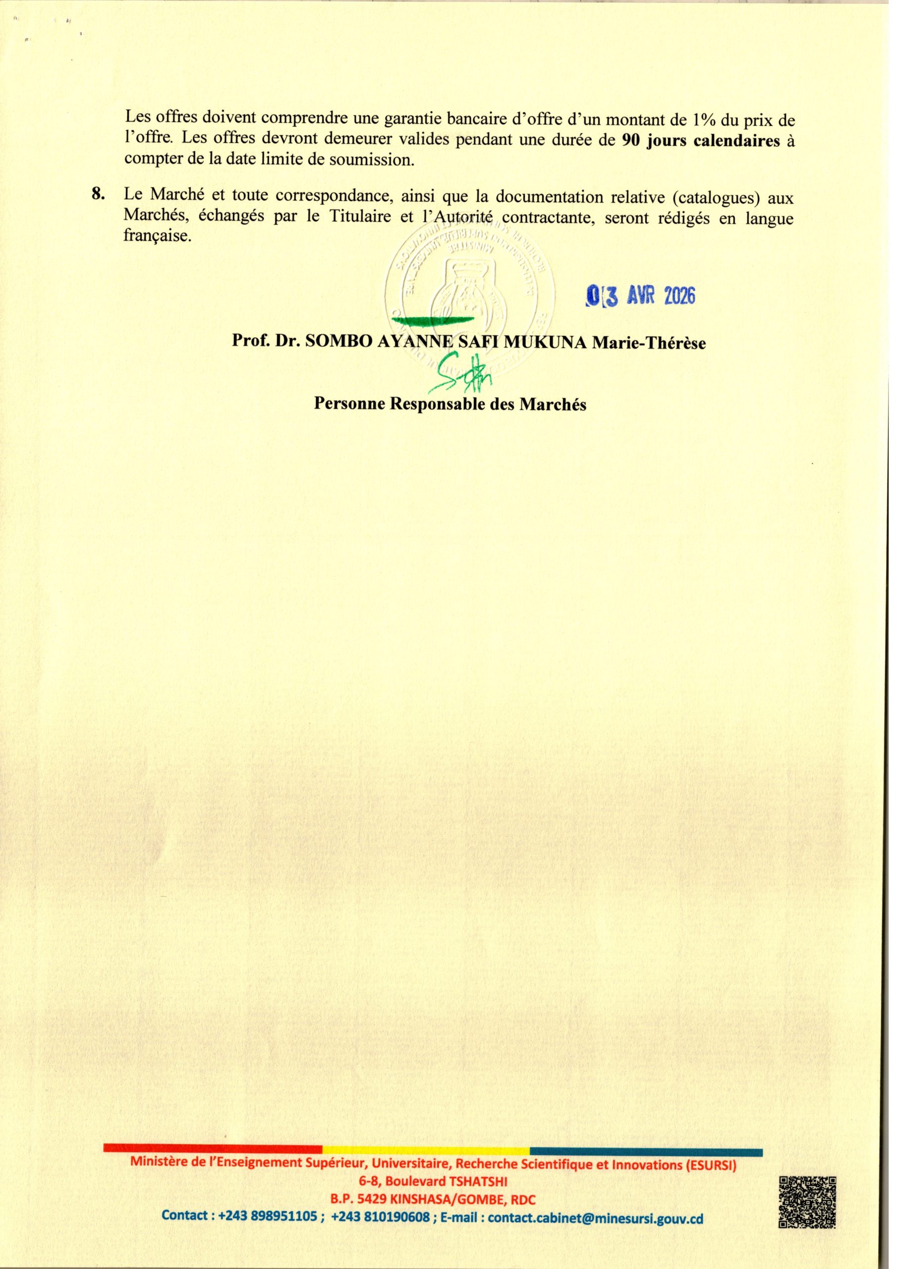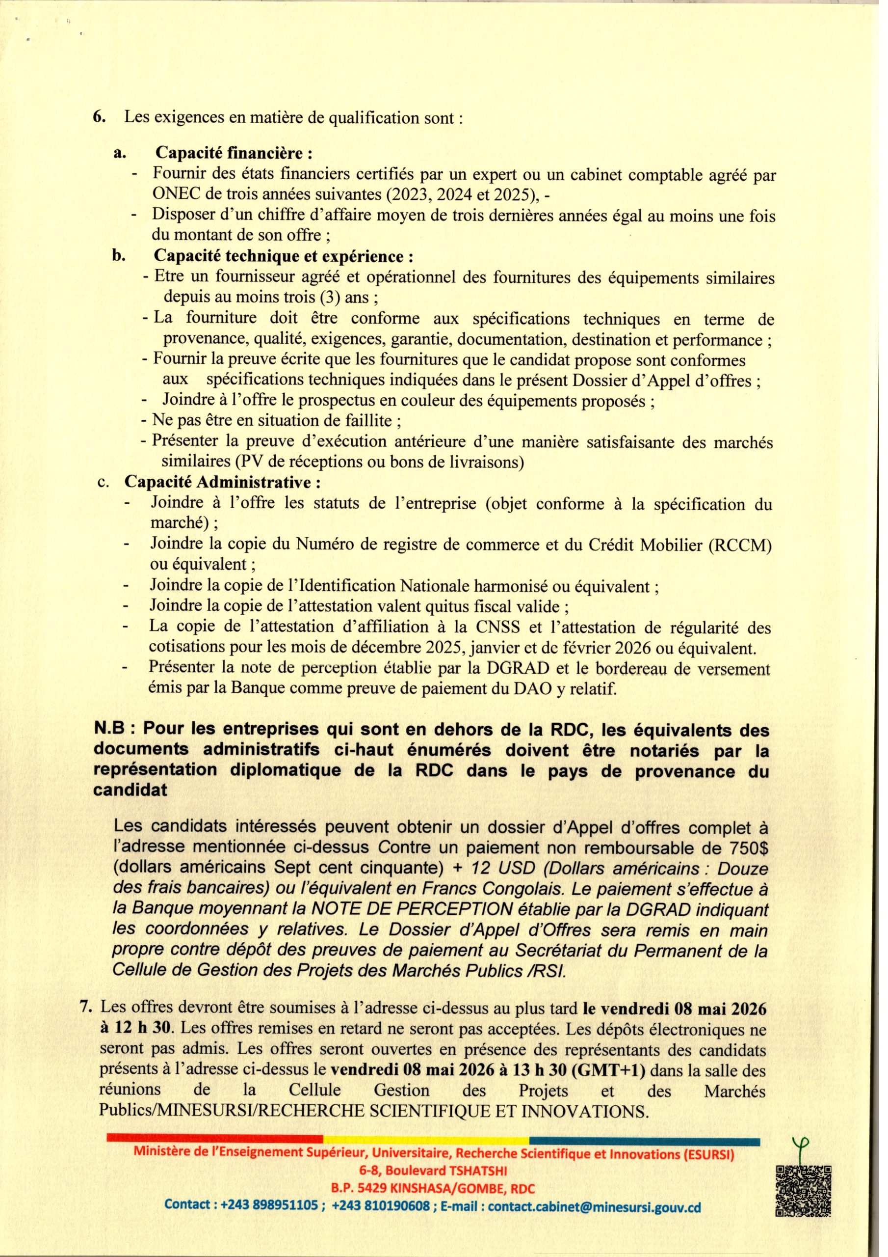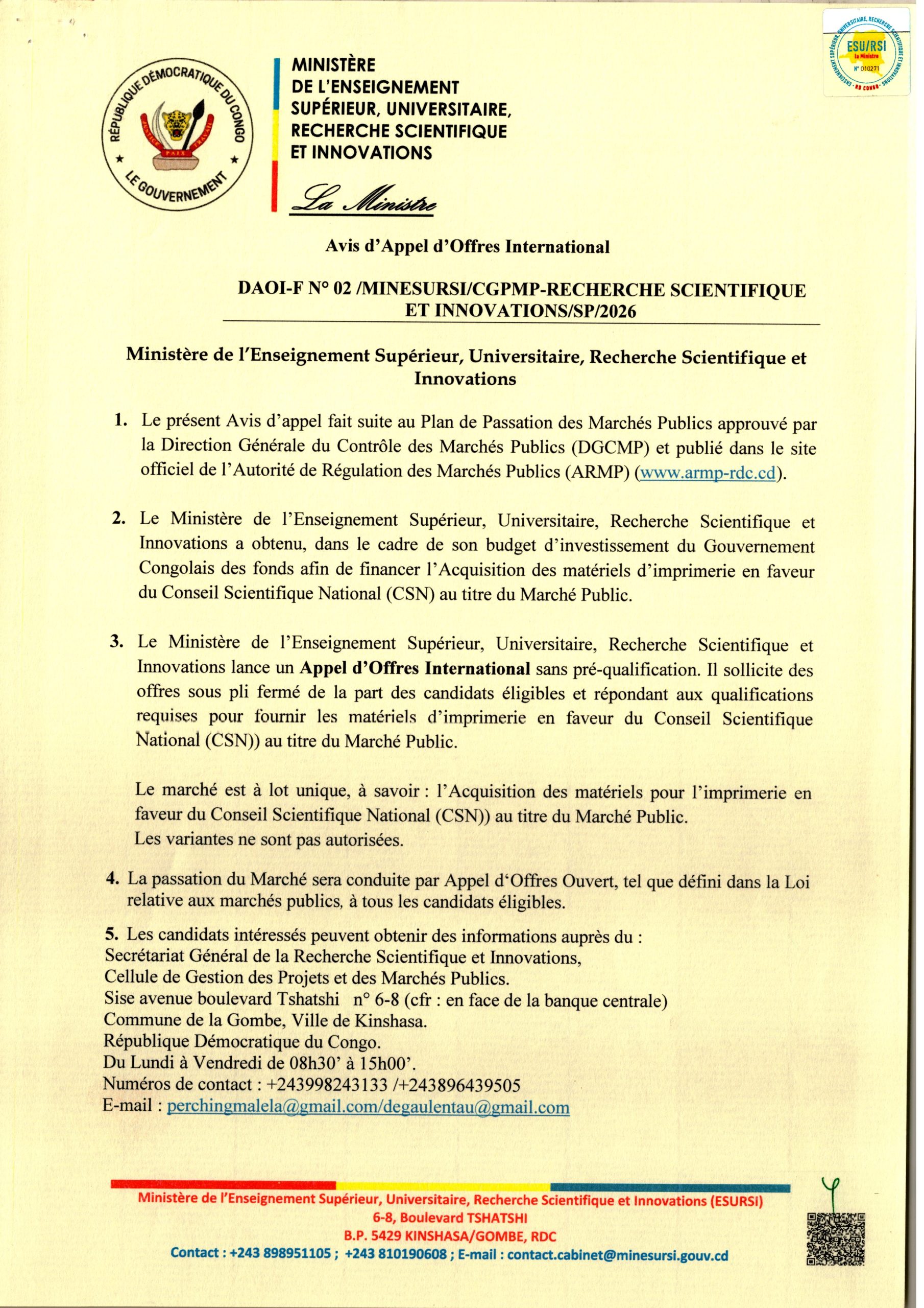 Acquisition des matériels d’imprimerie en faveur du Conseil Scientifique National