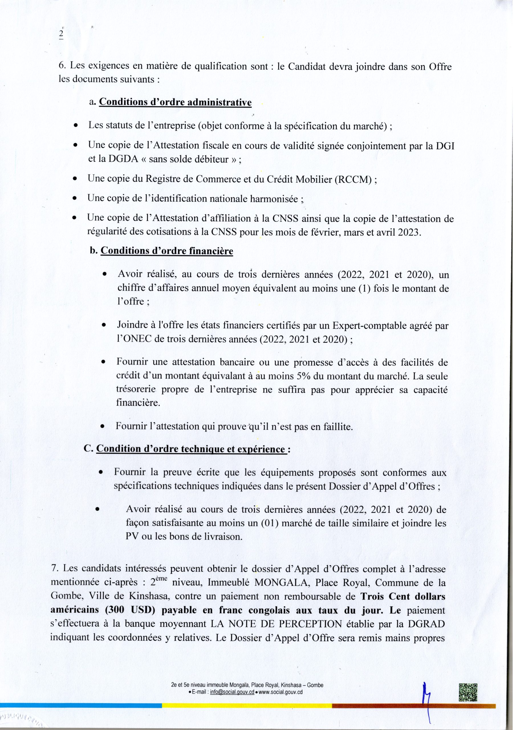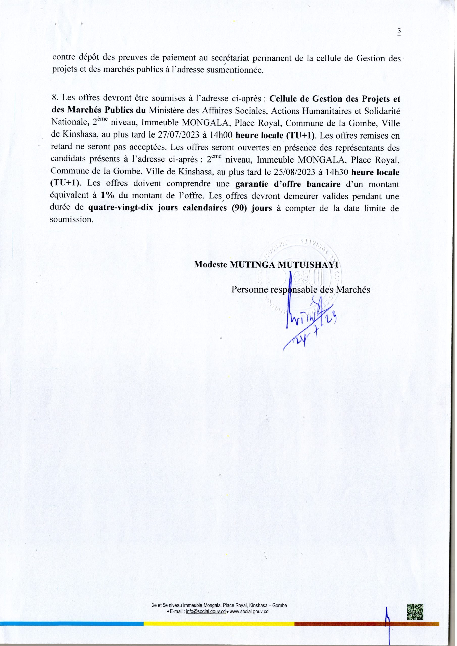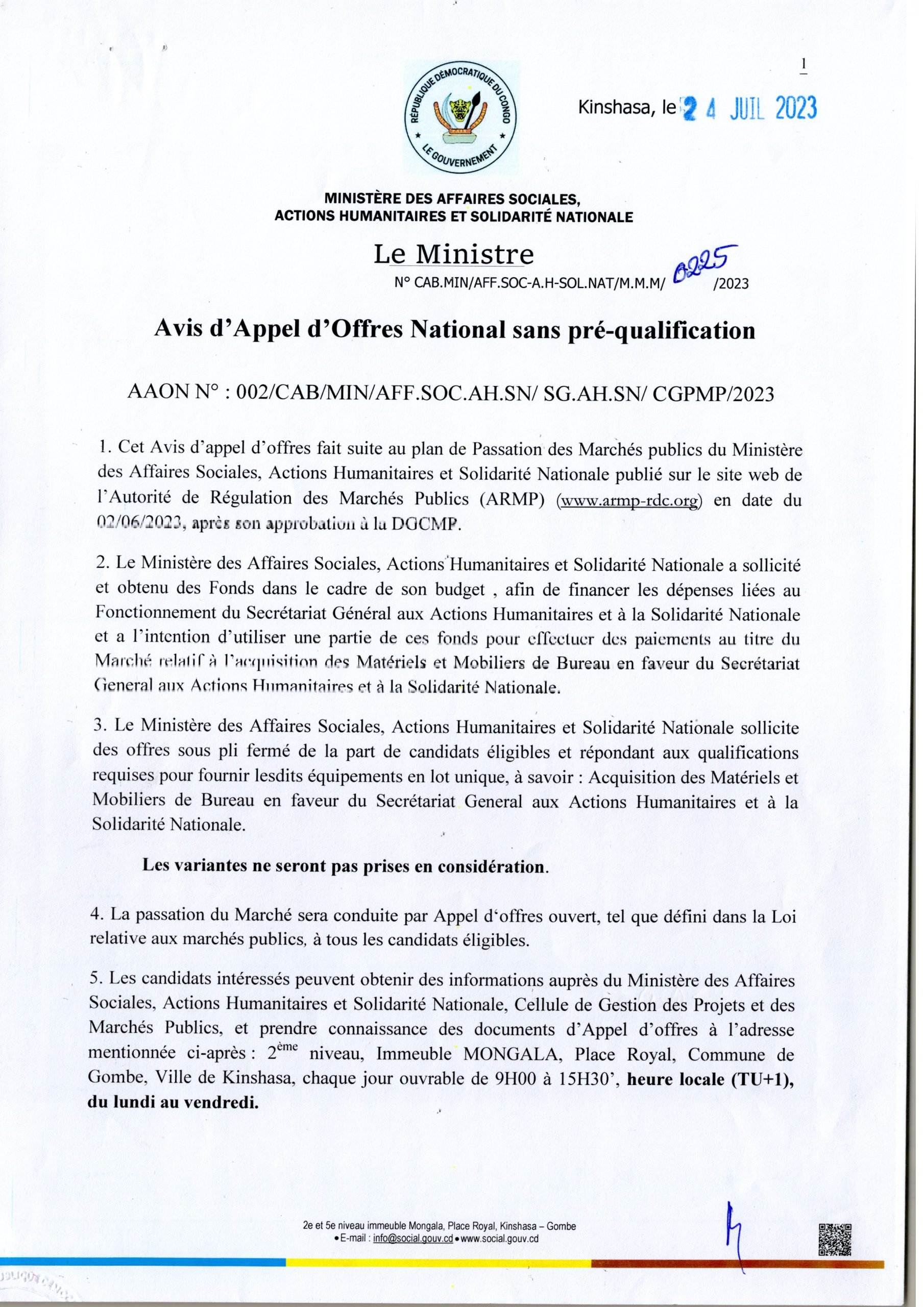 Acquisition des Matériels et Mobiliers de Bureau en faveur du Secrétariat général aux Actions Humanitaires et à la Solidarité Nationale.