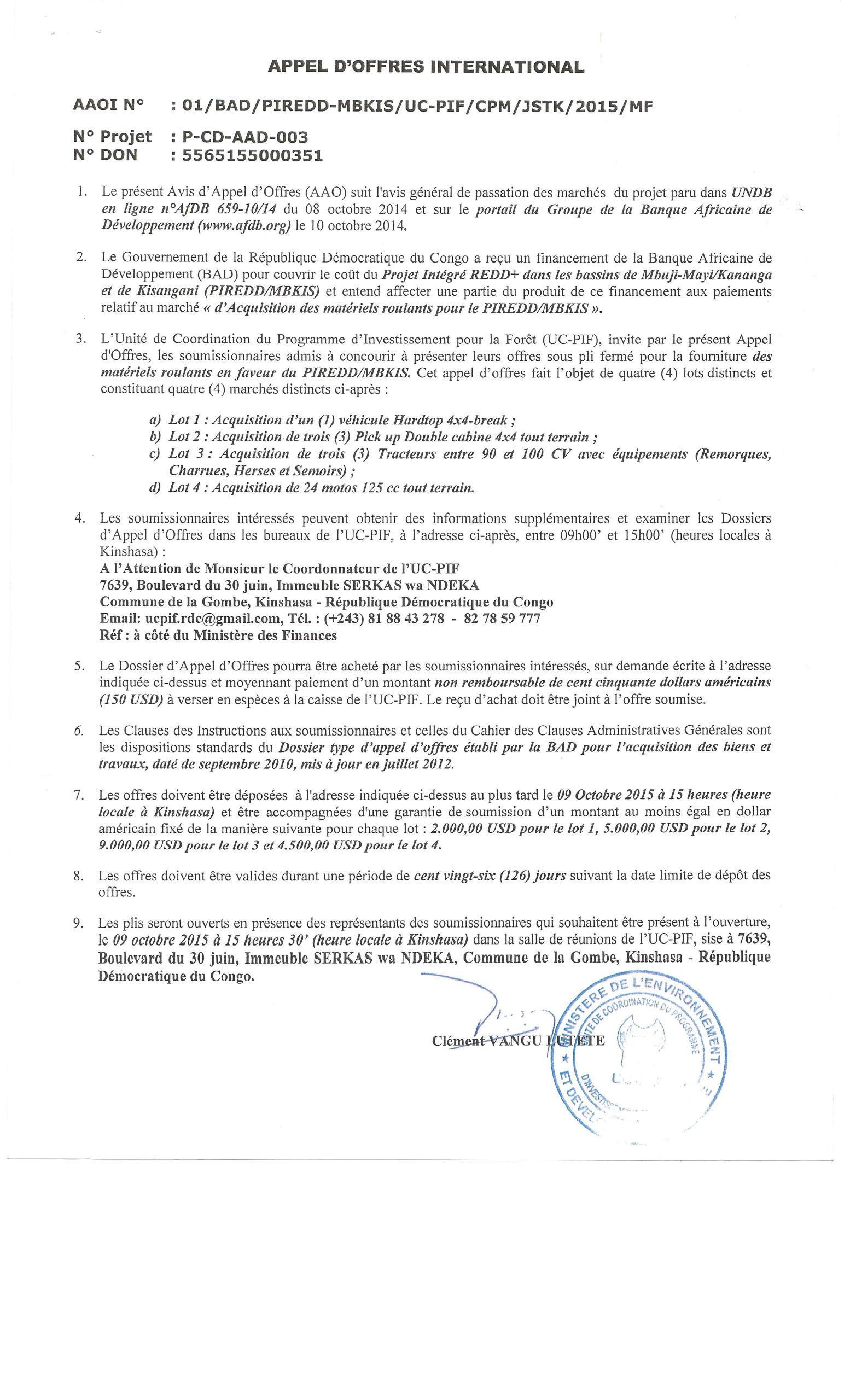 Acquisition des matériels roulants pour le PIREDD/MBKIS.