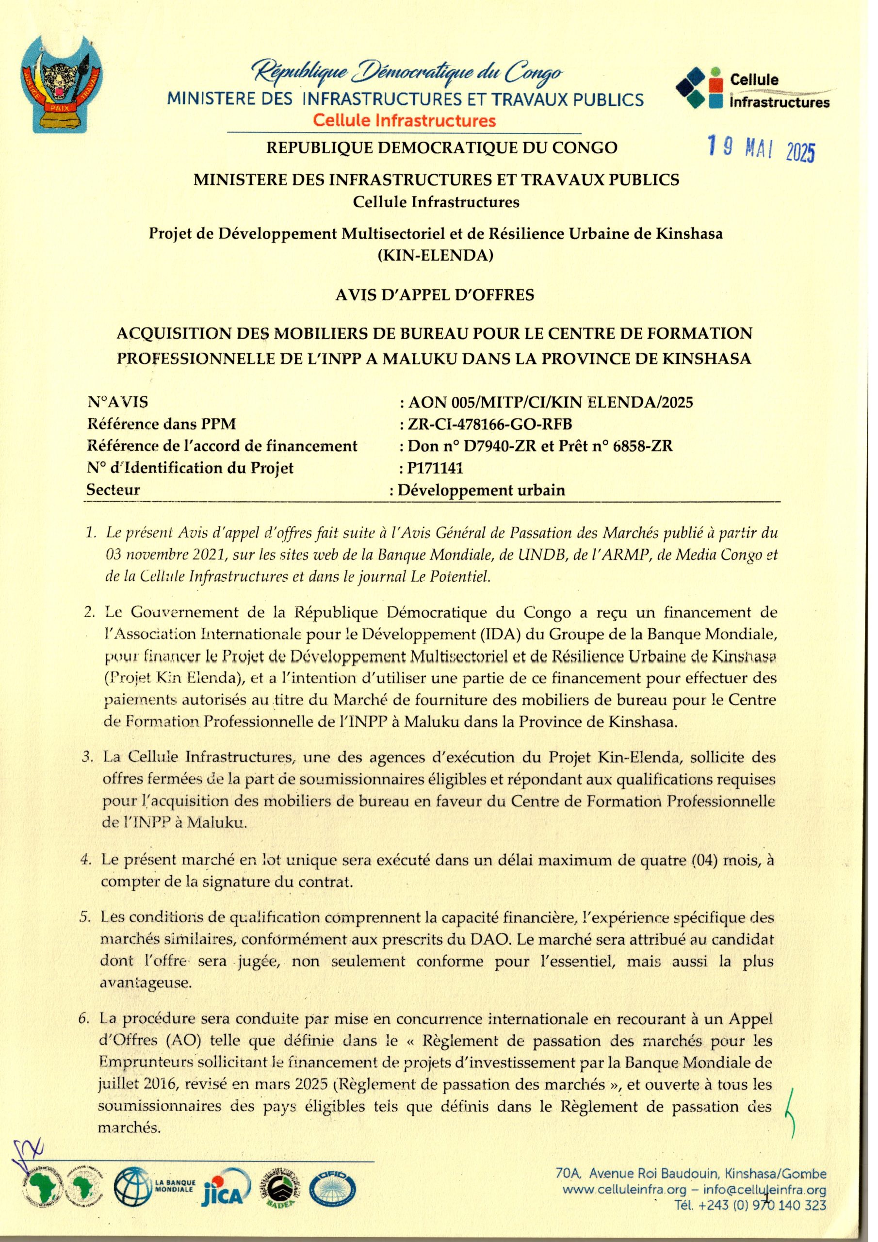 Acquisition des mobiliers de bureau pour le centre de formation professionnelle de l’INPP à MALUKU dans la province de Kinshasa.
