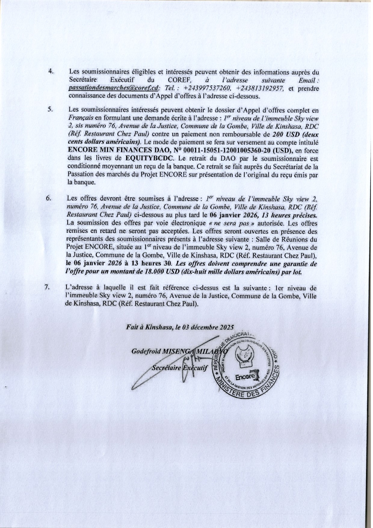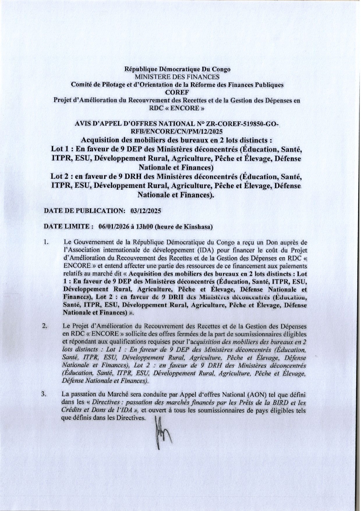 Acquisition des mobiliers des bureaux en 2 lots distincts : Lot 1 : En faveur de 9 DEP des Ministères déconcentrés, et Lot 2 : en faveur de DRH des Ministères déconcentrés,…