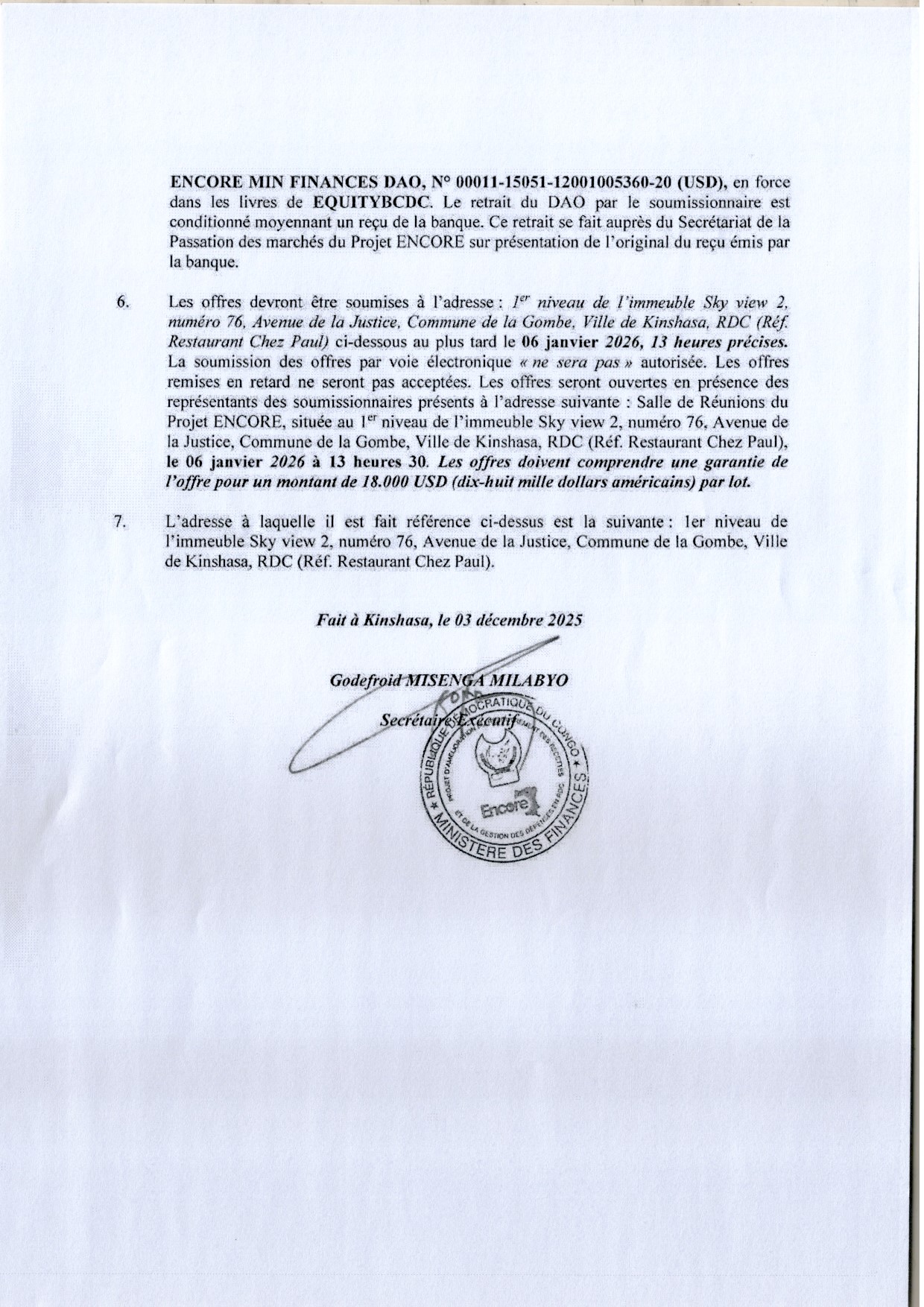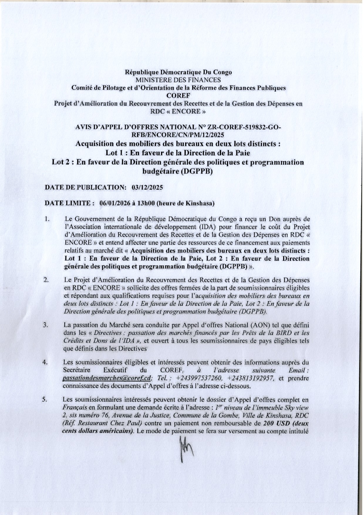 Acquisition des mobiliers des bureaux en deux lots distincts : Lot 1 : En faveur de la Direction de la Paie Lot 2 : En faveur de la Direction générale des politiques et programmation budgétaire (DGPPB).