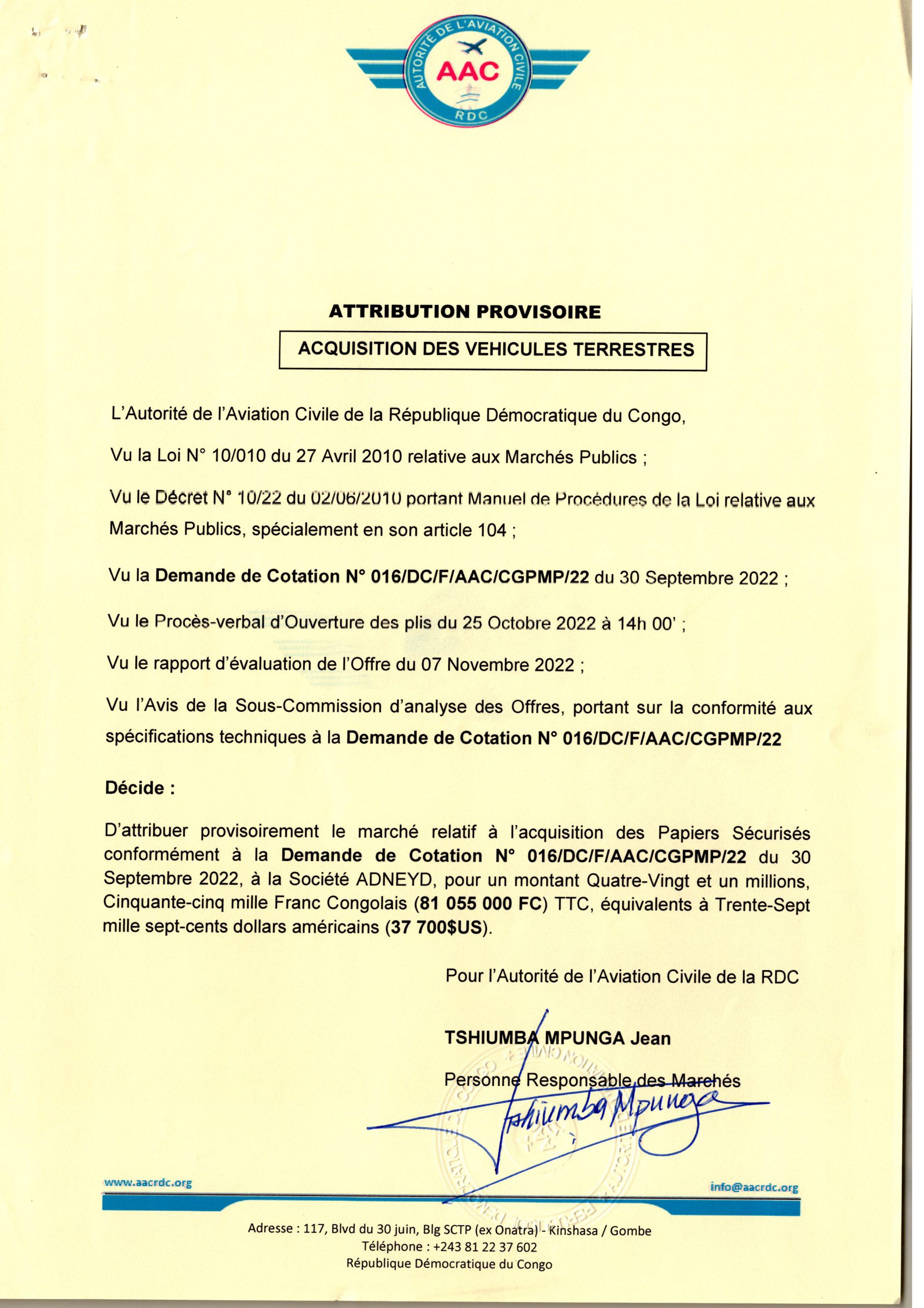Attribution provisoire relative à l’acquisition des papiers sécurisés conformément à la demande de Cotation N°016/CD/F/AAC/CGPMP/22 du 30 Septembre 2022 à la société ADNEYD