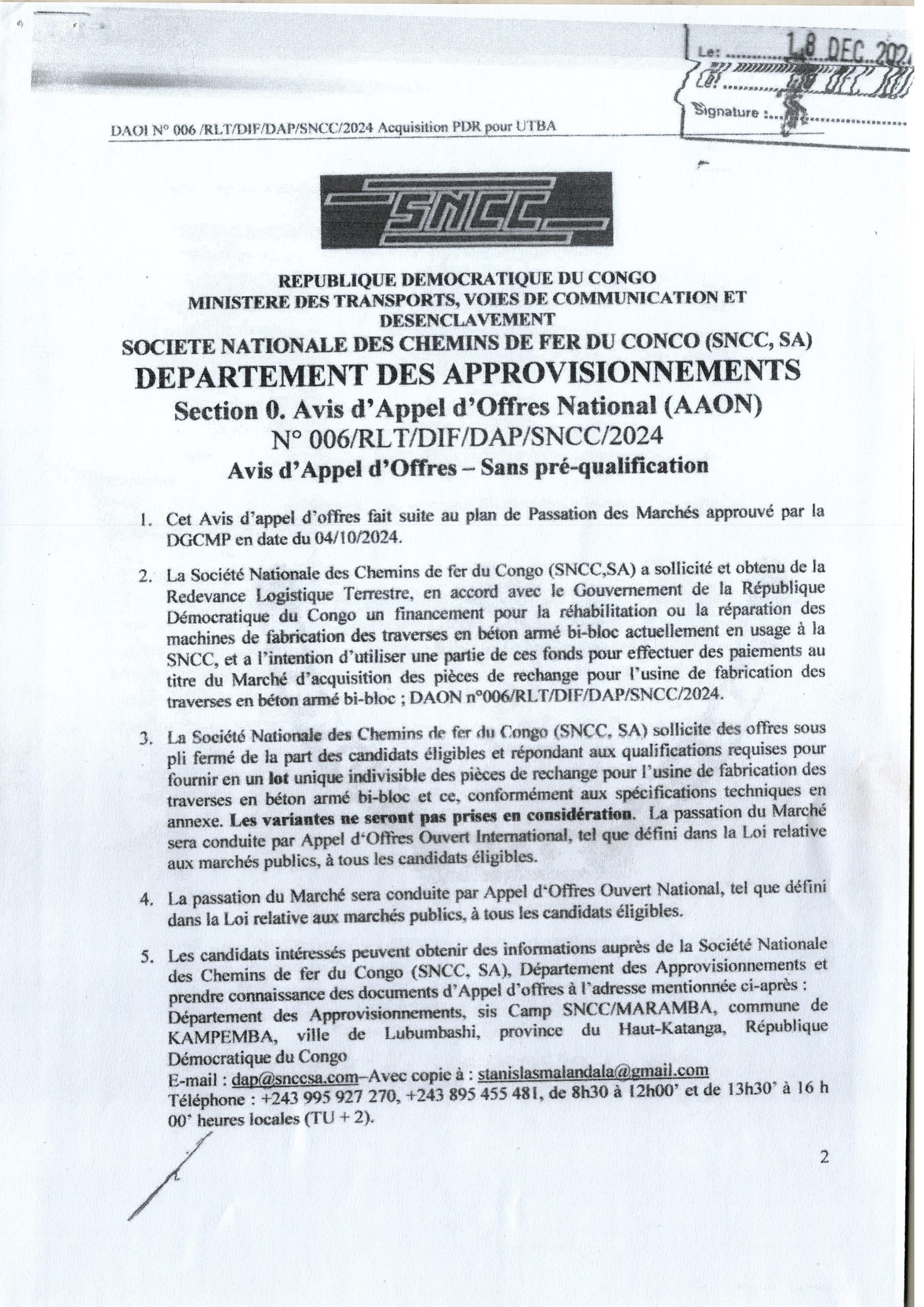 Acquisition des pièces de rechange pour l’usine de fabrication des traverses en béton armé bi-bloc.