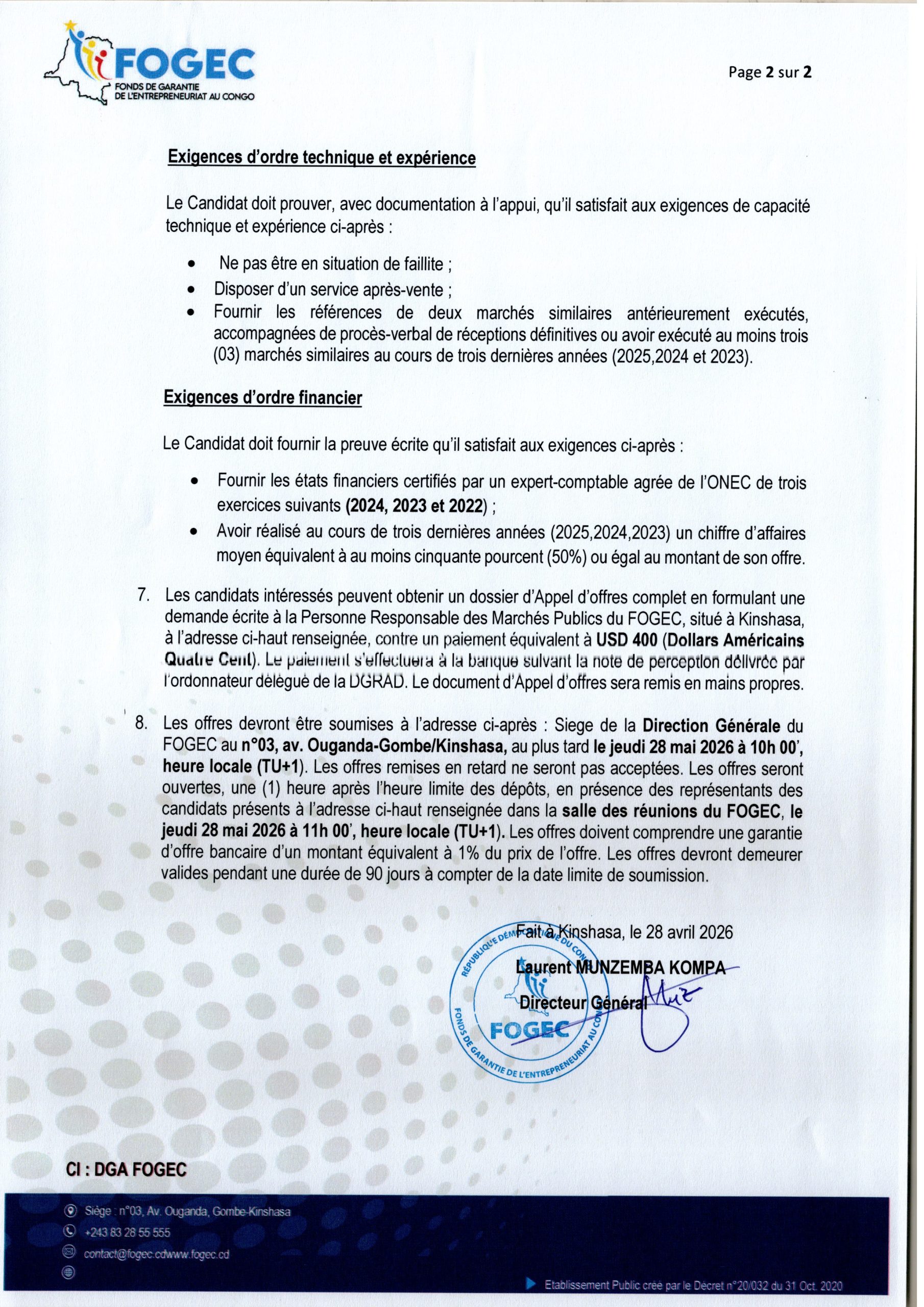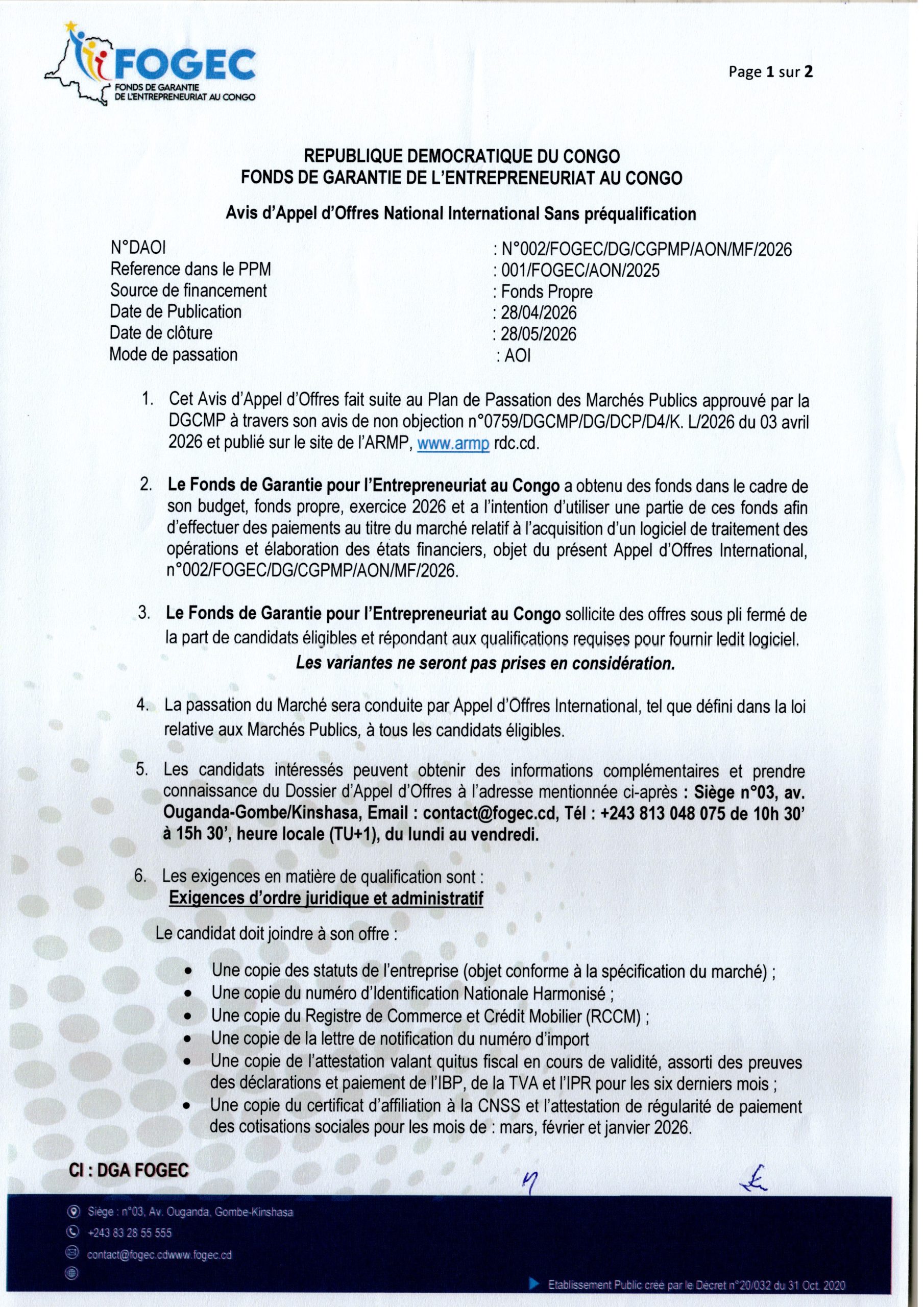 Acquisition d’un logiciel de traitement des opérations et élaboration des états financiers pour le compte du FOGEC.