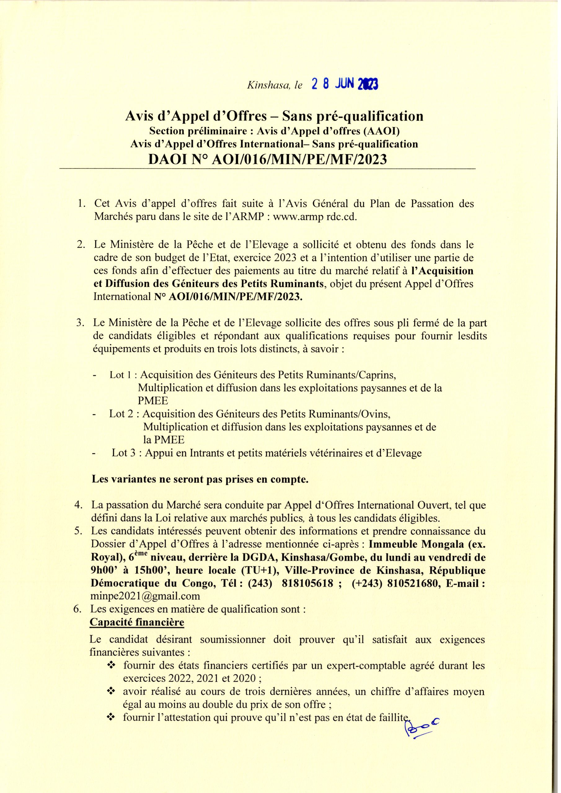 Acquisition et Diffusion des Géniteurs des Petits Ruminants.