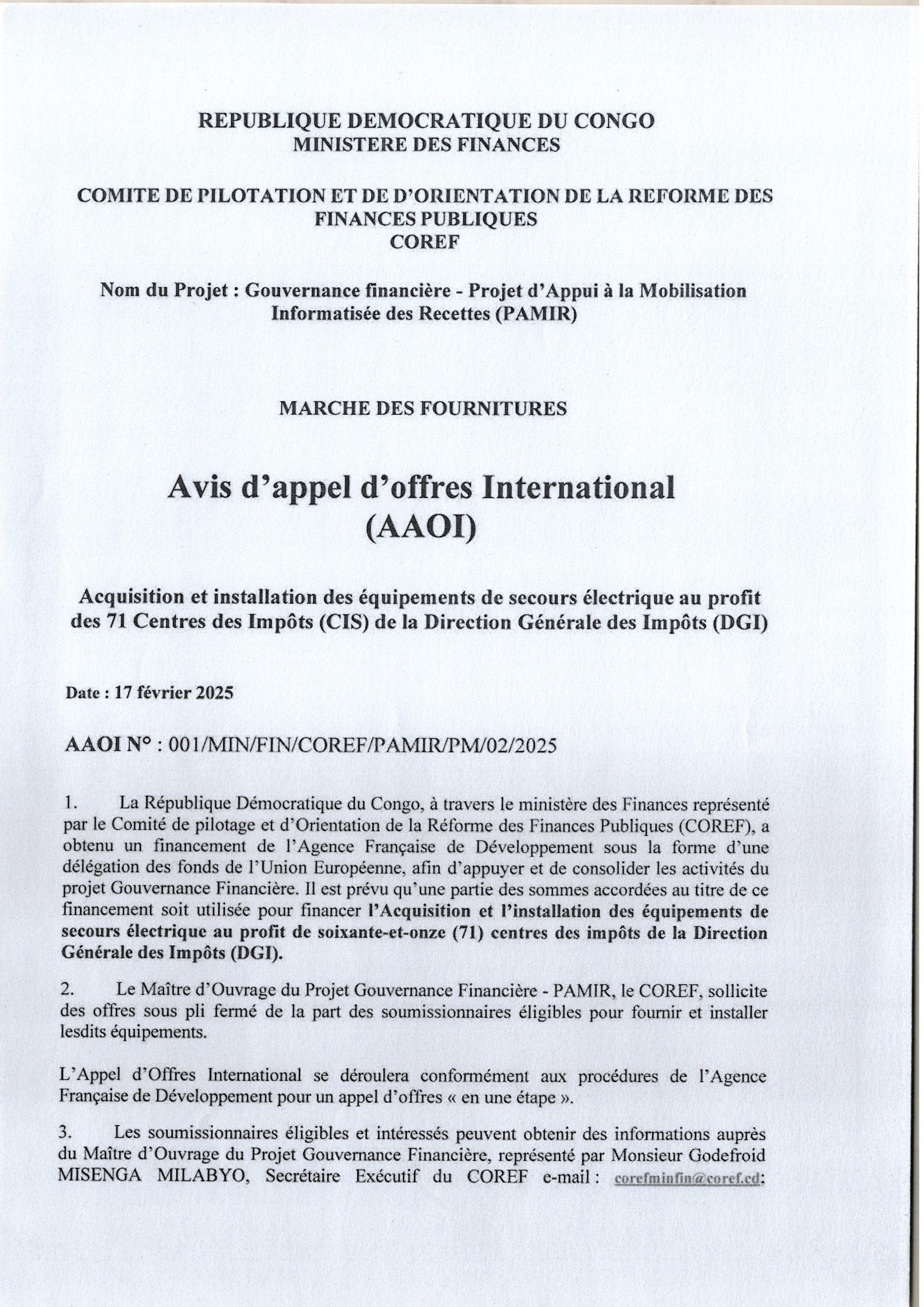 Acquisition et Installation des équipements de secours électrique au profit des 71 Centres des Impôts (CIS) de la Direction Générale des Impôts (DGI)