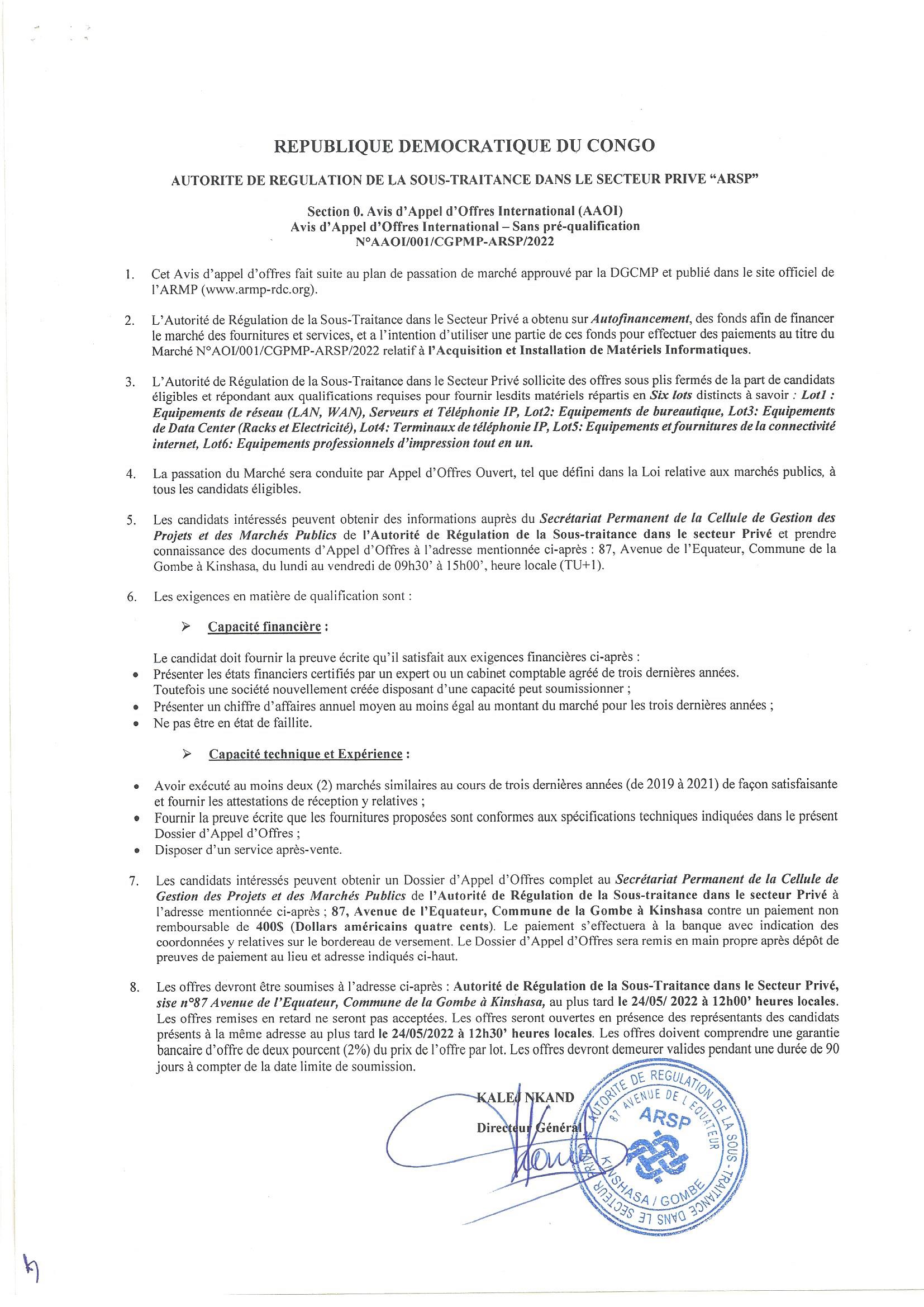 Acquisition et l’installation de matériels informatiques en faveur de ARSP.