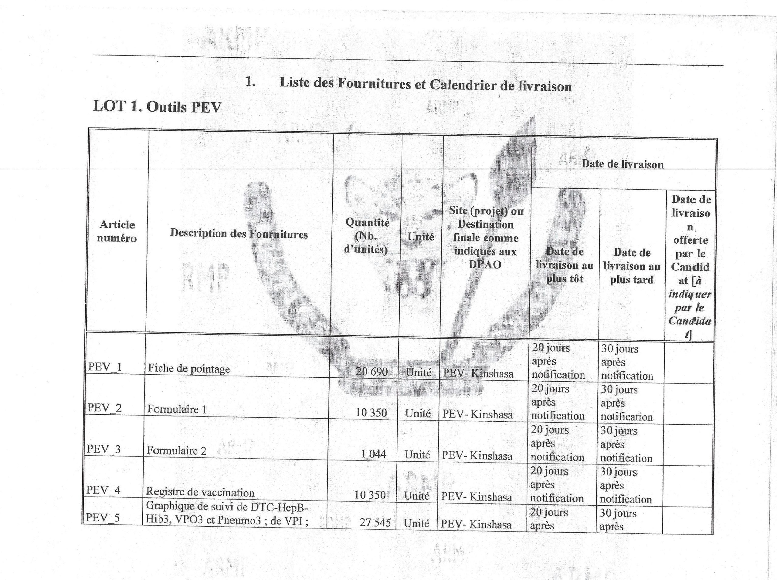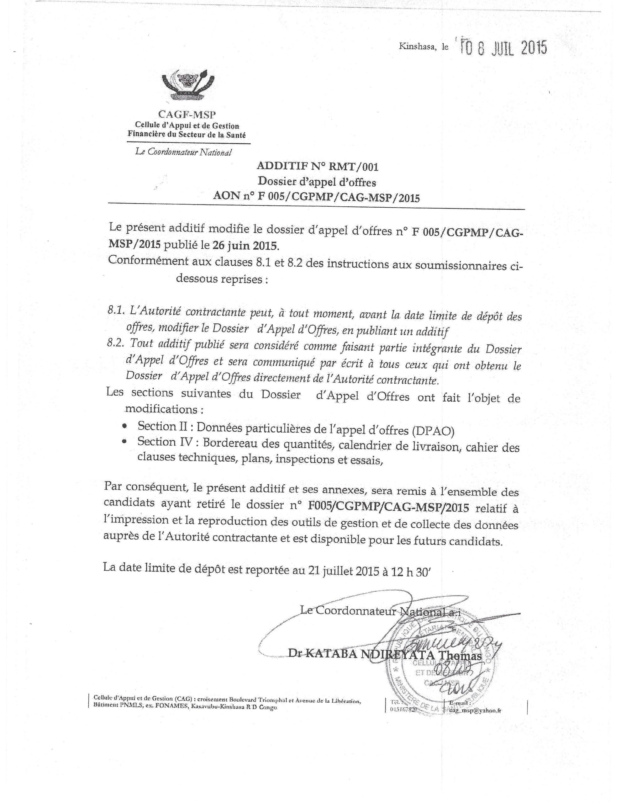 Additif n° F 005/CGMP/CAGMSP/2015 modifie le dossier d’appel d’offres.