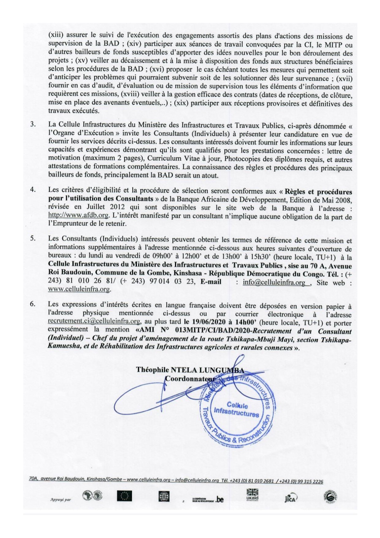 AMI – RECRUTEMENT D’UN CONSULTANT INDIVIDUEL, CHEF DE PROJET – PROJET D’AMENAGEMENT DE LA ROUTE TSHIKAPA-MBUJI MAYI ET REHABILITATION DES INFRASTRUCTURES AGRICOLES ET RURALES CONNEXES
