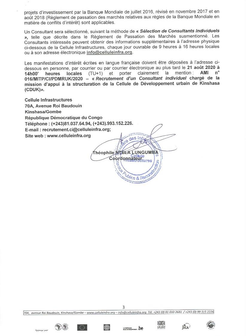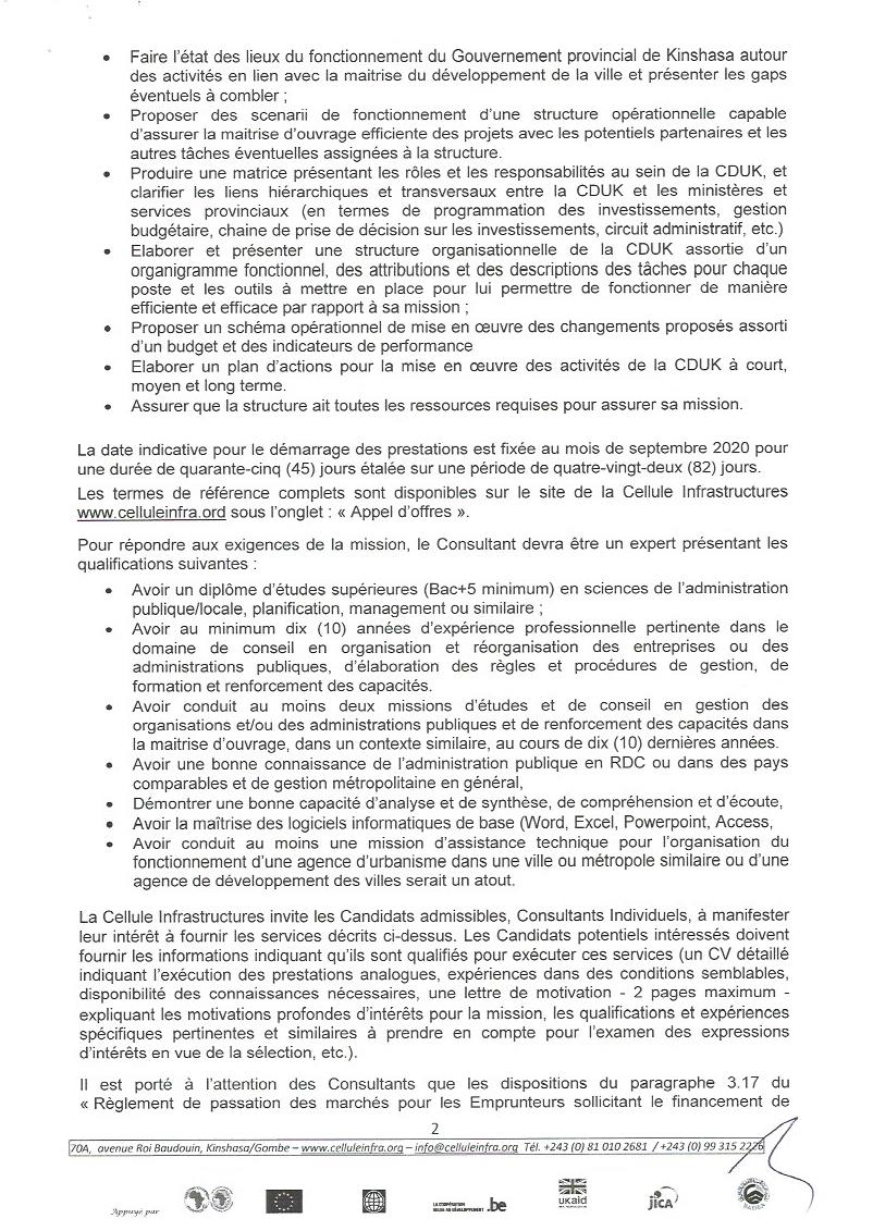 AMI relatif au recrutement d’un consultant individuel charge de la mission d’appui à la structuration de la cellule de développement urbain de Kinshasa (CDUK)