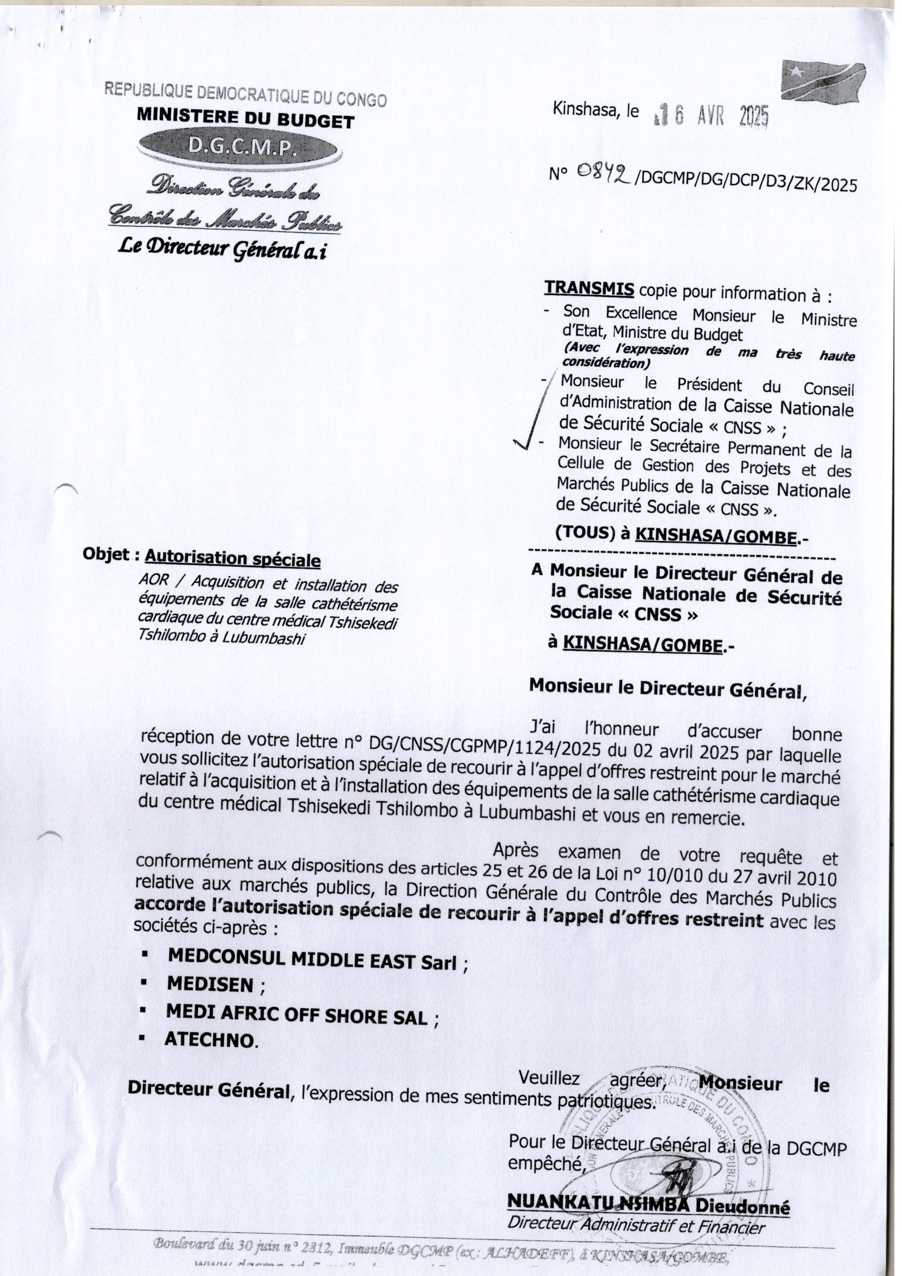 AOR/Acquisition et installation des équipements de la salle cathétérisme cardiaque du centre médical Tshisekedi Tshilombo à Lubumbashi.