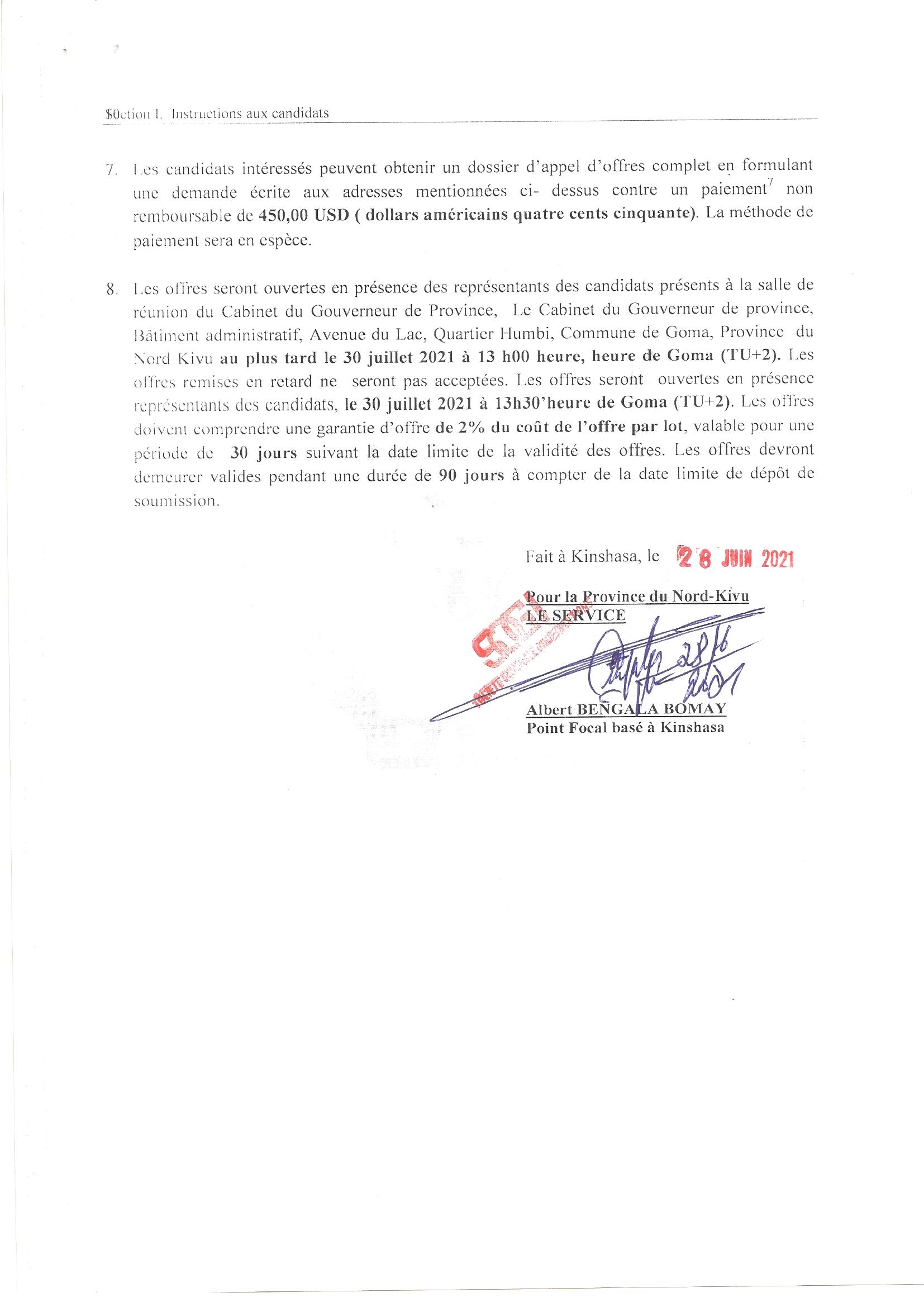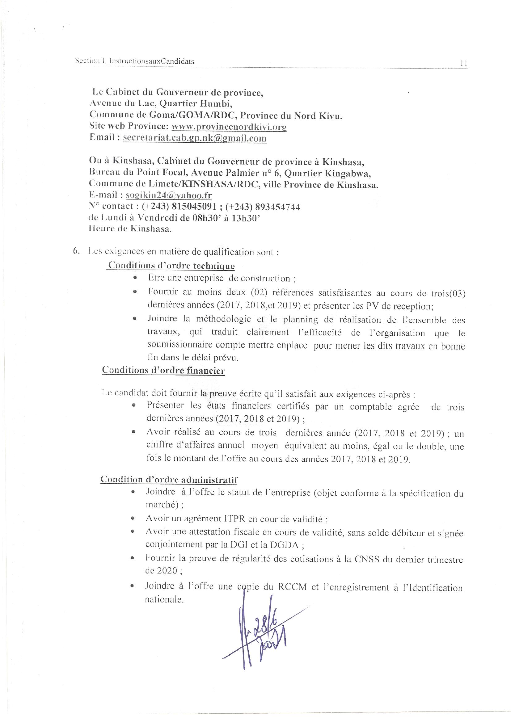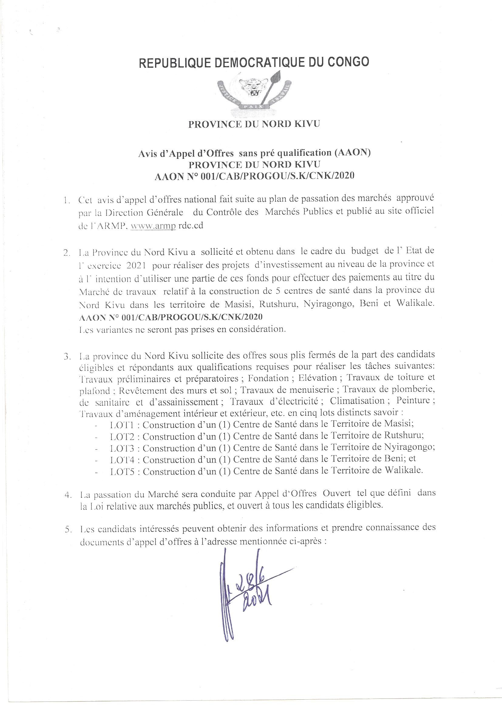 APPEL D’OFFRES SANS PRE QUALIFICATION DE LA PROVINCE DU NORD-KIVU RELATIF AU MARCHE DES TRAVAUX A CINQ (5) LOTS.