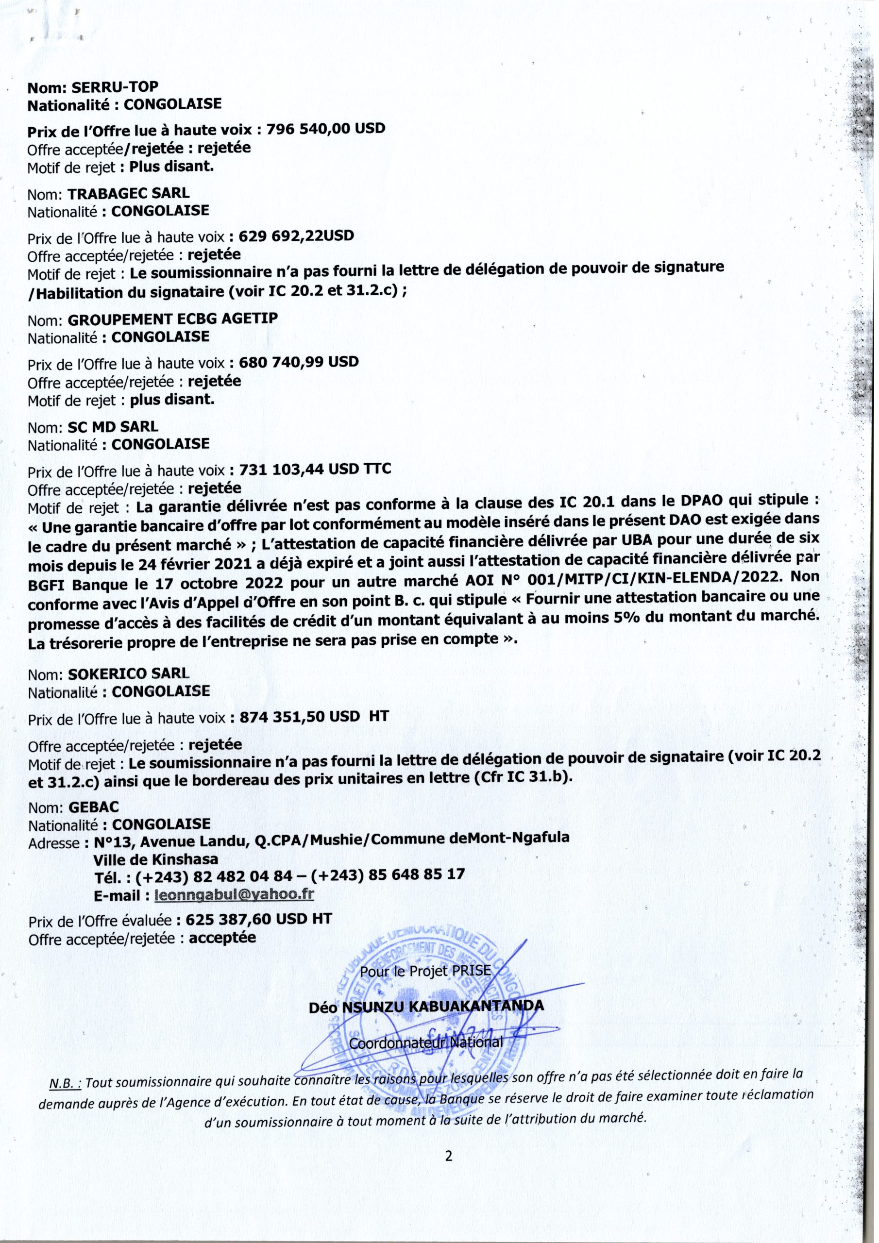 ATTRIBUTION DE MARCHE ACCORDÉE À GEBAC(GENIES BATISSEURS DU CONGO) RELATIVE À LA RÉHABILITATION DE L’EP NGIYO, CONSTRUCTION DU CENTRE DE SANTE DE LOBOLI, AINSI QUE LA CONSTRUCTION DU MARCHÉ DE MUSHIE ET LA FOURNITURE DES MOBILIERS SCOLAIRES À L’ EP…