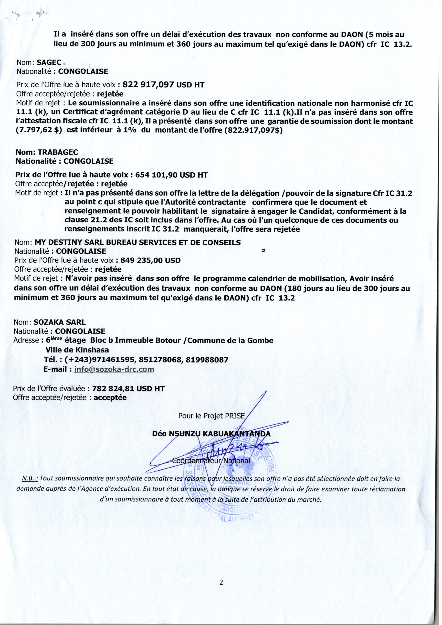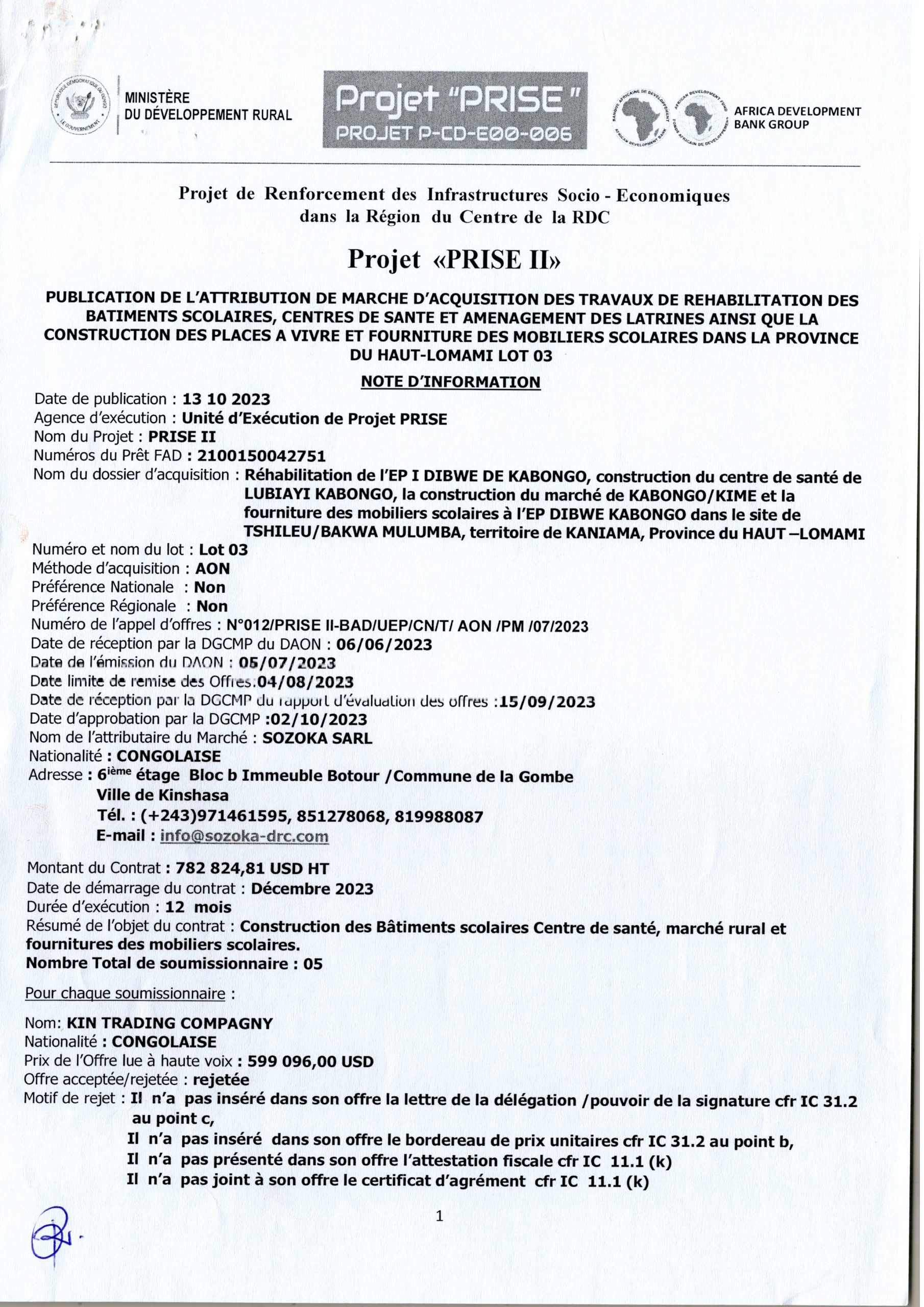 ATTRIBUTION DE MARCHE ACCORDÉE À LA SOCIÉTÉ SOZOKA SARL RELATIVE À LA RÉHABILITATION DE L’EP I DIBWE DE KABONGO, CONSTRUCTION DU CENTRE DE SANTÉ DE LUBIAYI KABONGO, LA CONSTRUCTION DU MARCHÉ DE KABONGO/KIME ET LA FOURNITURE DES MOBILIERS SCOLAIRES À …