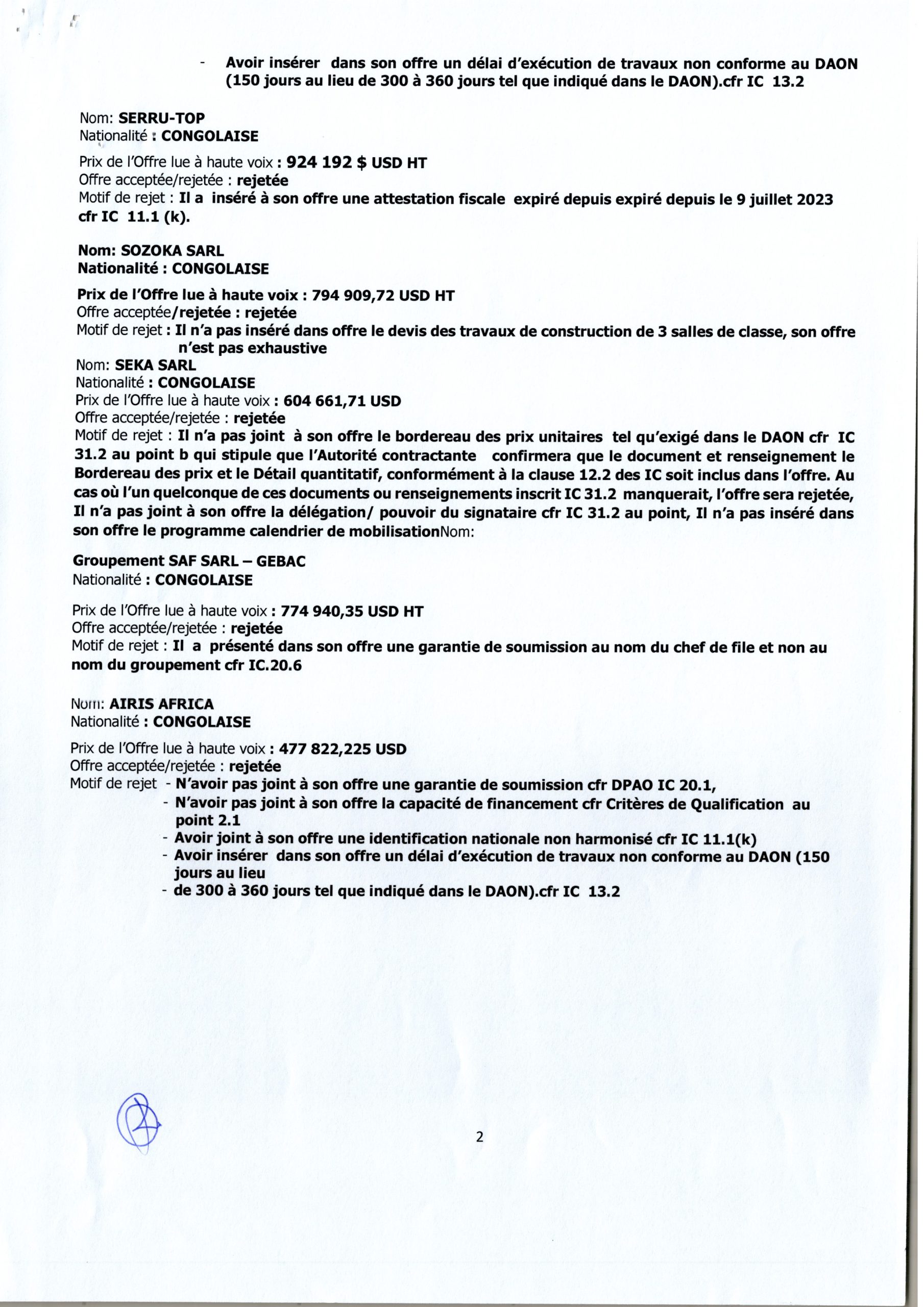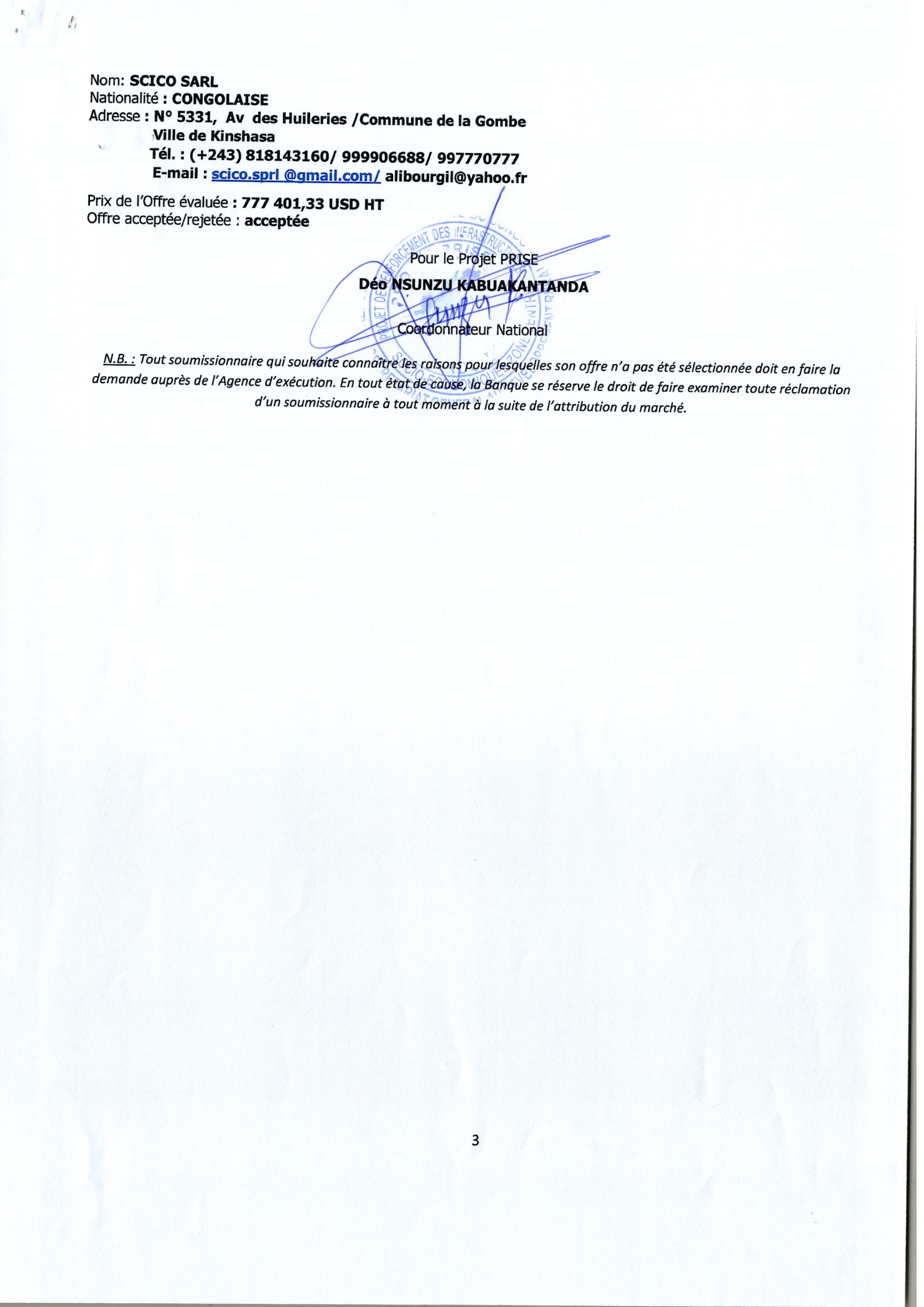 ATTRIBUTION DE MARCHE ACCORDÉE À SCICO SARL RELATIVE À LA RÉHABILITATION DE L’EP J.J OMBA, CONSTRUCTION DU CENTRE DE SANTÉ DE LOWE, LA CONSTRUCTION DU MARCHÉ DE BAKWA MBUMBA 60 KM ET LA FOURNITURE DES MOBILIERS SCOLAIRES À L’EP J.J OMBA, DANS LE SITE …