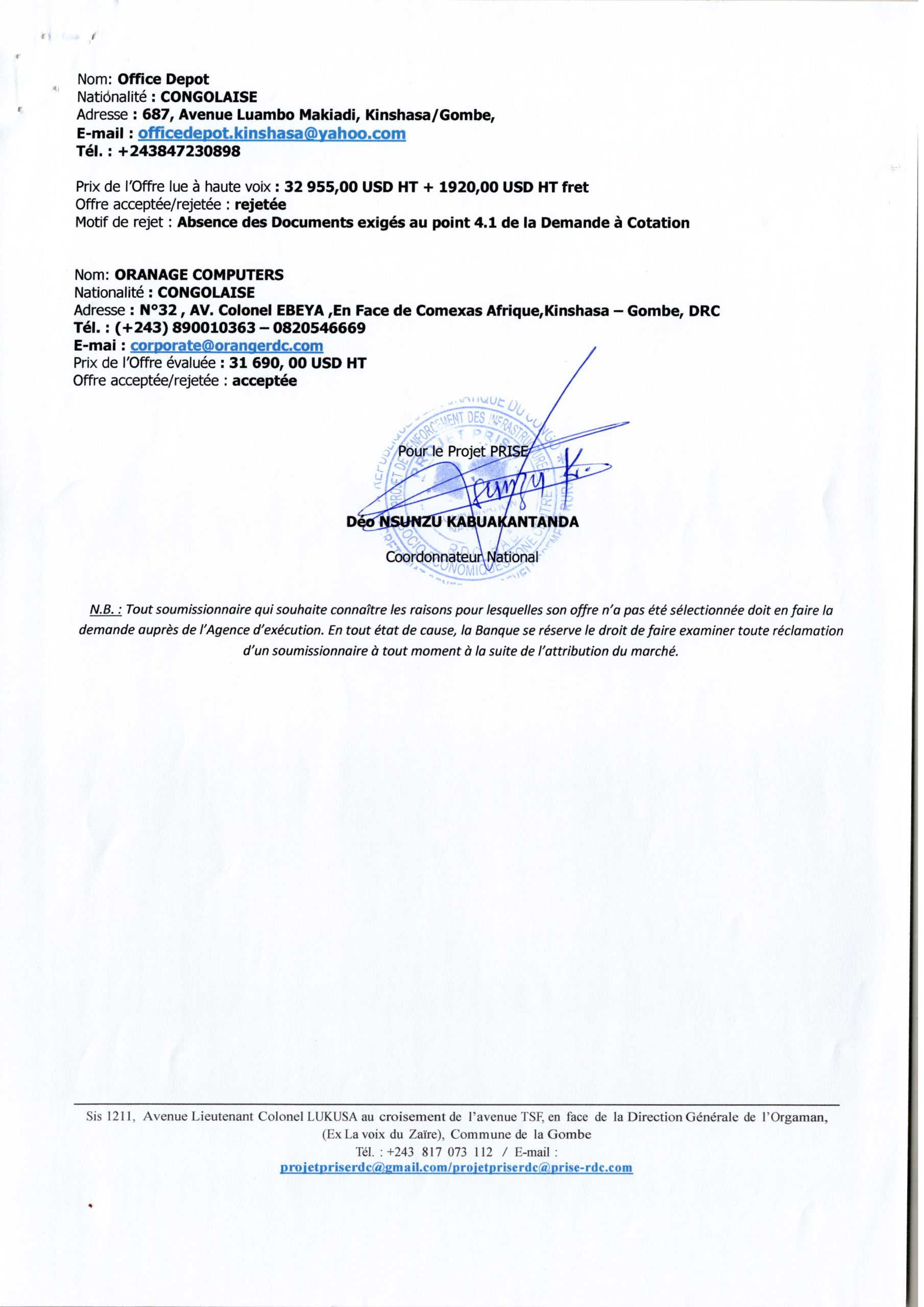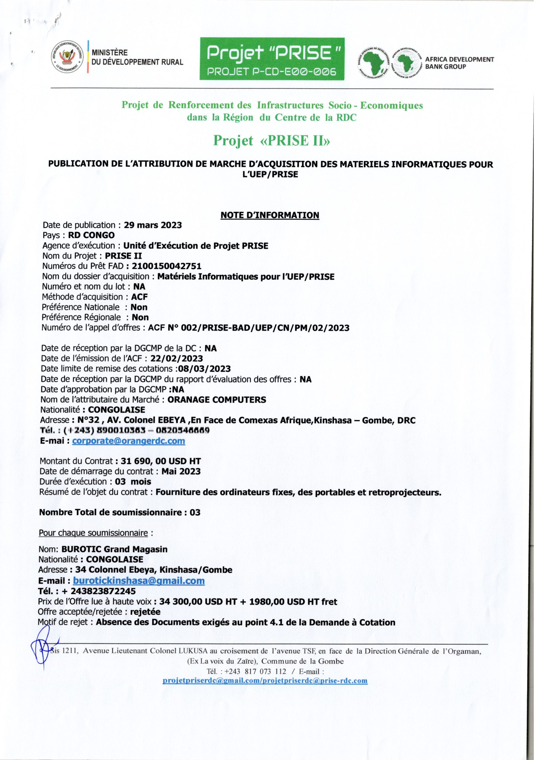 Attribution de marché d’acquisition des matériels Informatiques pour l’UEP/PRISE à la société ORANGE COMPUTERS