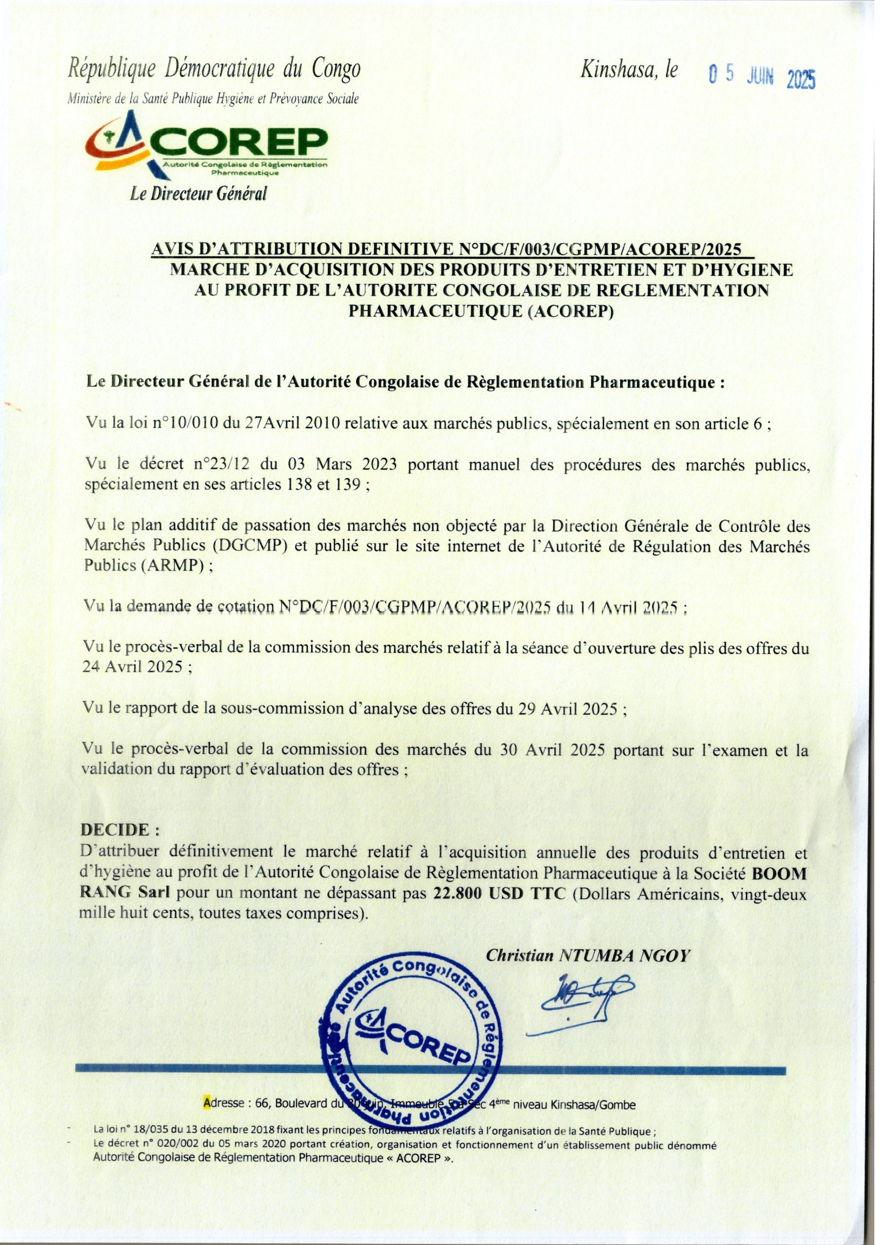 Attribution Définitif du Marché d’acquisition annuelle des produits d’entretien et d’hygiène au profit de l’Autorité Congolaise de Règlementation Pharmaceutique à la Société BOOM RANG Sarl