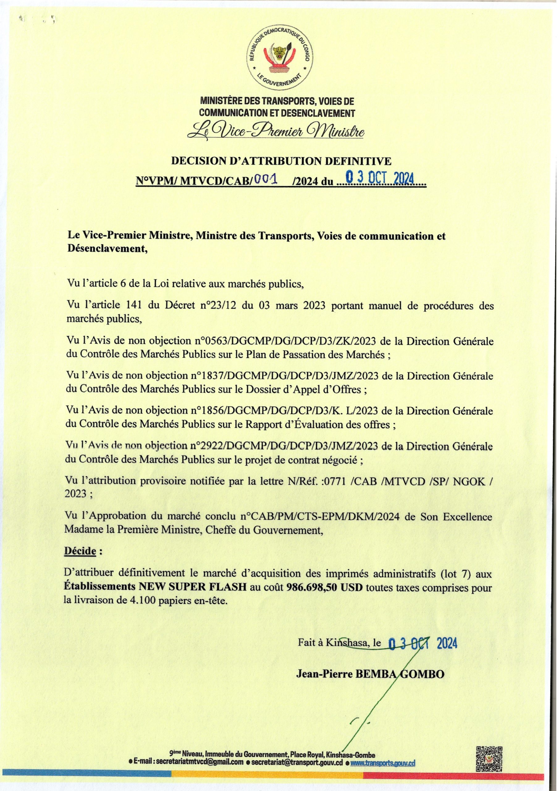 Attribution définitive à la société ” Ets NEW SUPER FLASH” le marché relatif à l’acquisition des imprimés administratifs (lot 7) (4100 papiers en-tête )